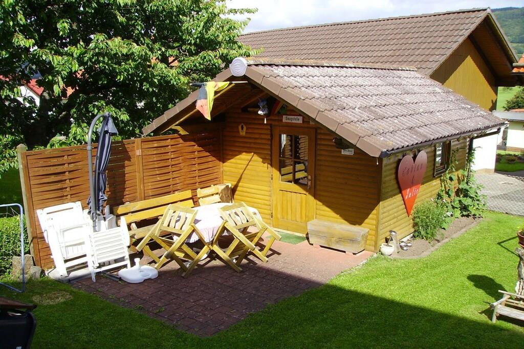 Vores charmerende ferielejlighed ligger i annekset med separat indgang. I kan finde jer selv til rette i vores cirka 50 m² store lejlighed – perfekt til afslapning og ferien. De lyse og indbydende værelser er ideelle til afslapning. Fra en lille, overdækket balkon kan I beundre de smukke Rhön-bjerge og de omkringliggende enge. Hvis I ønsker at have plads til tre eller fire personer, er der en stor sovesofa med sengetøj i stuen. Lejligheden er også udstyret til spædbørn og børn. Der er en vugge med sengetøj, en højstol og legetøj. Et meget veludstyret køkken står til jeres rådighed.