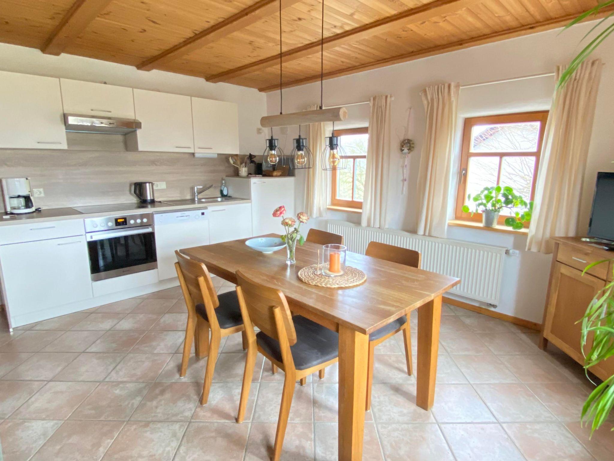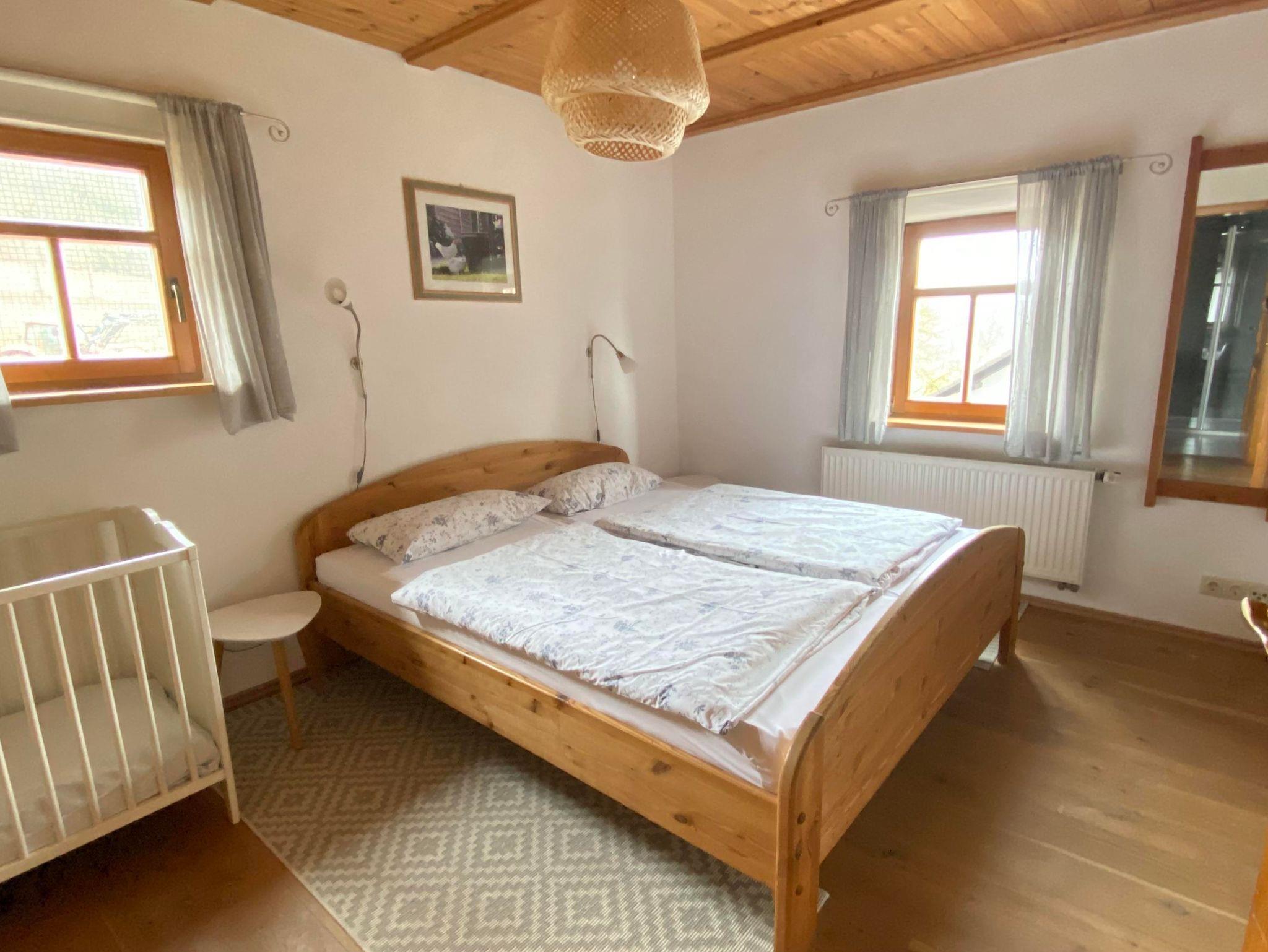 Die gemütliche Ferienwohnung im ersten Stock bietet dir eine atemberaubende Aussicht auf die wunderschöne Landschaft der Rhön, die du schon beim Frühstücken genießen kannst. In der einladenden Wohnküche findest du ein bequemes Sofa, das auch als Schlafsofa genutzt werden kann, sowie eine Sitzgruppe. Die Küche ist vollständig ausgestattet mit Backofen, Spülmaschine,Wasserkocher, Kaffeemaschine, Toaster, Eisfach und vielem mehr. Das Schlafzimmer verfügt über ein komfortables Doppelbett. Für den kleinen Nachwuchs steht ein Babybett zur Verfügung.