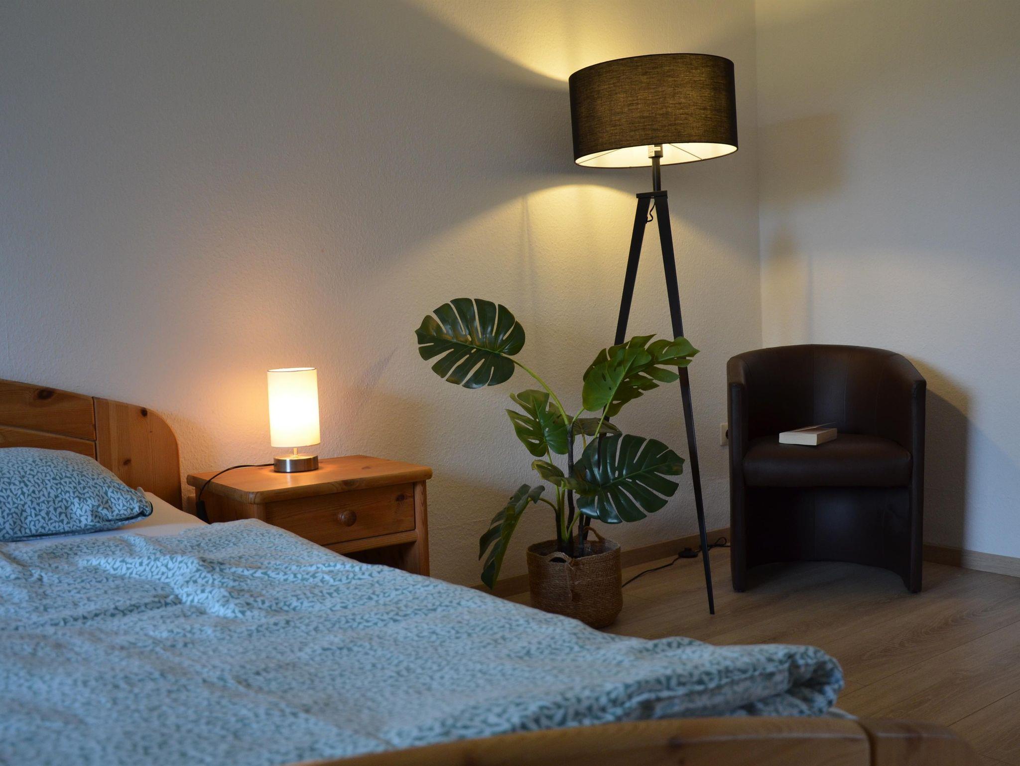 In unserer Ferienwohnung finden Sie 1 komplett eingerichtete Wohnküche mit SAT-TV, Radio und Ledersofa, einen Essplatz für 4 Personen, 1 Schlafzimmer mit Doppelbett (Durchgangszimmer zum Kinderzimmer), 1 Kinderzimmer mit Etagenbett (0,90 x 1,90 m), 1 Bad mit Dusche und WC.