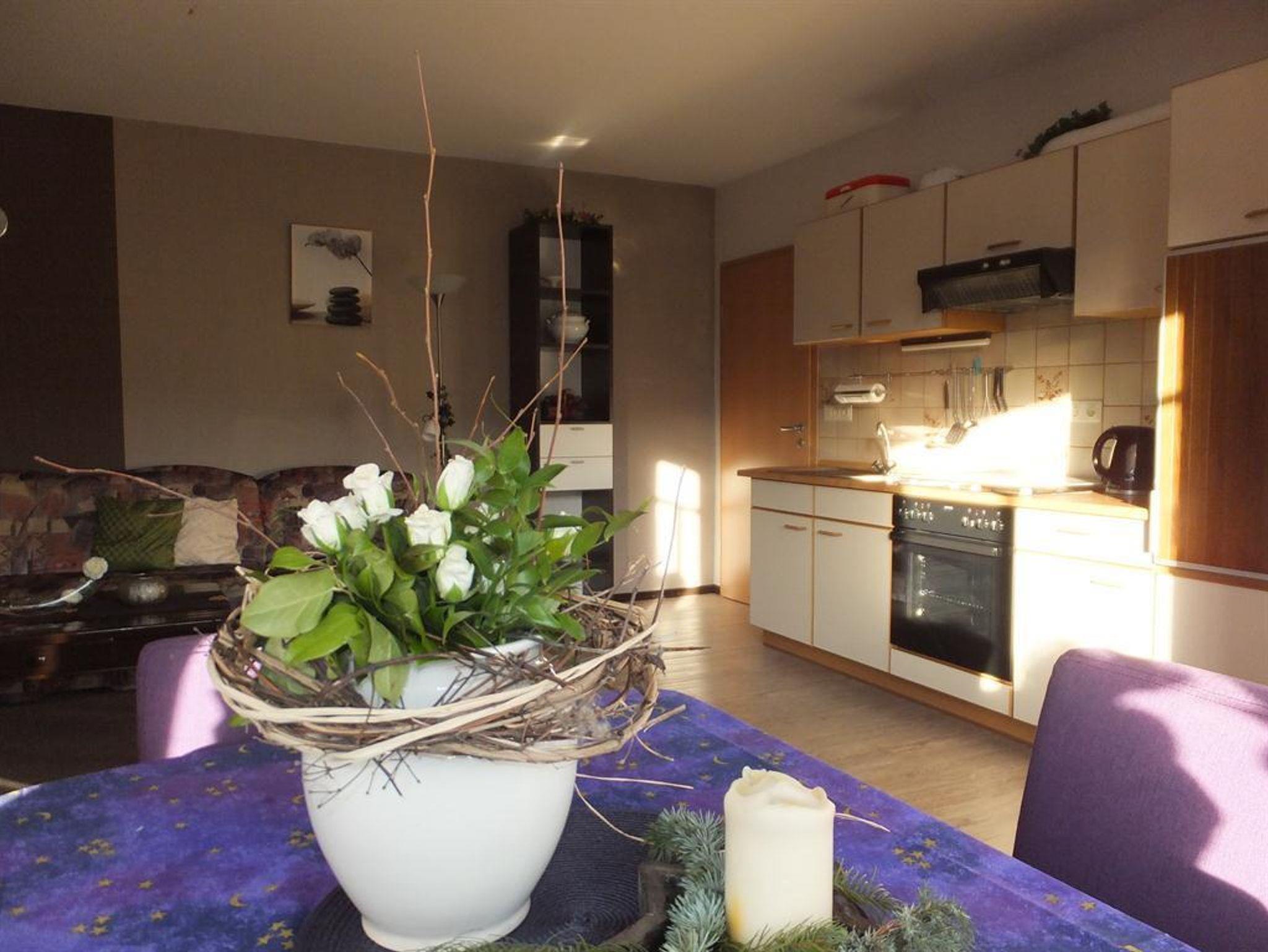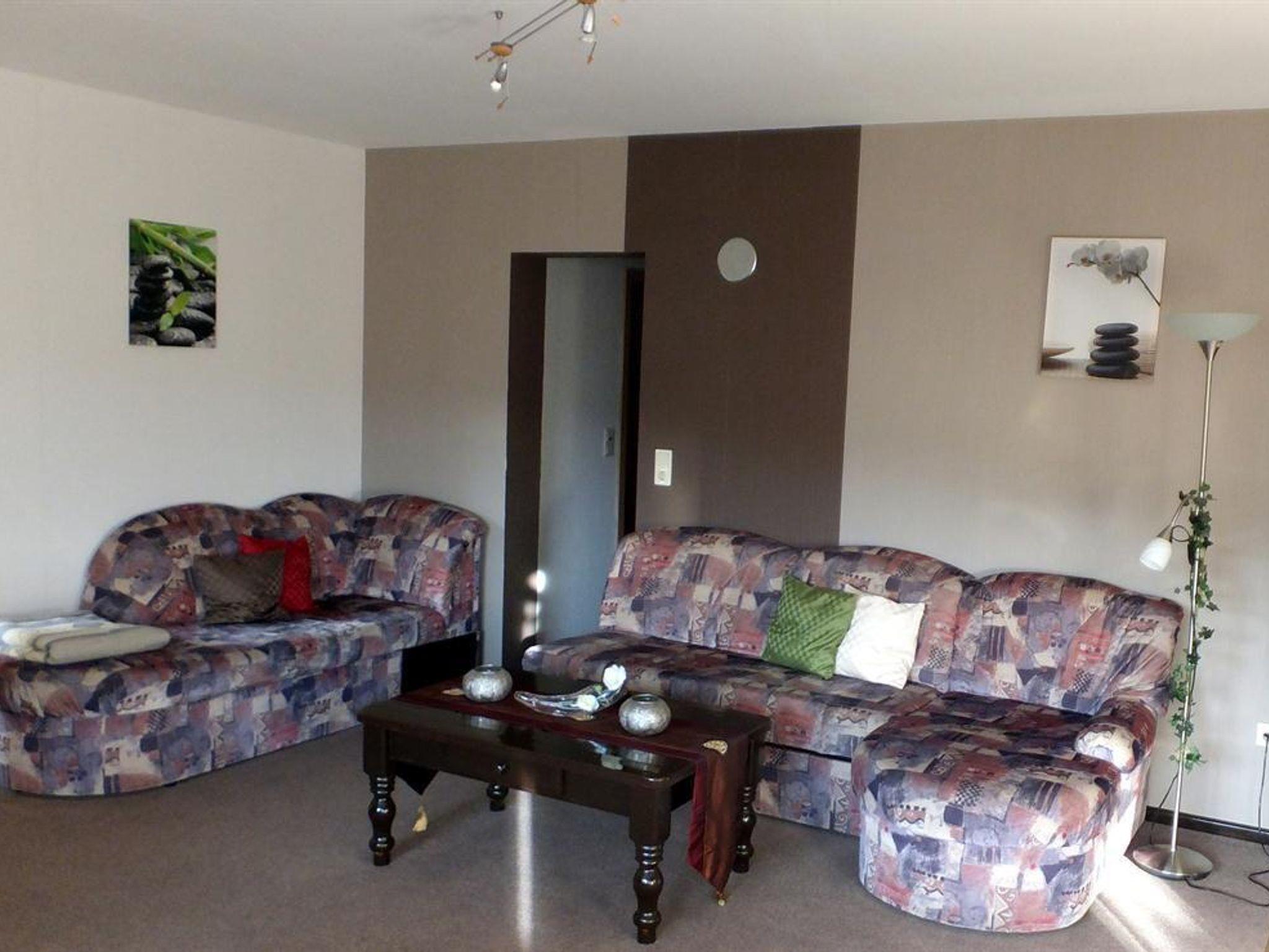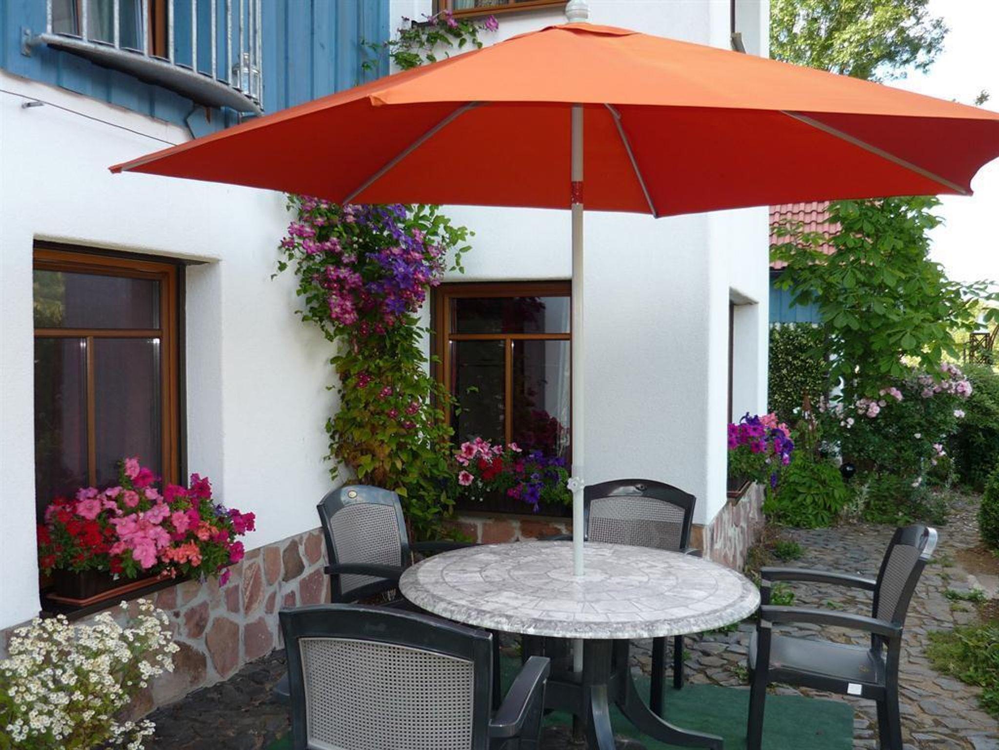 Unsere ländlich gelegene Ferienwohnung mit 60m² Wohnfläche bietet Platz für 1-4 Personen. Der gemütliche Wohnraum mit zwei Sofas, einem Esstisch und SAT-TV lädt zum Verweilen ein. Die komplett ausgestattete Küchenzeile mit Kühlschrank inkl. Gefrierfach, Herd, Backofen, Wasserkocher, Toaster und Kaffeemaschine lässt keine Wünsche offen. Die Ferienwohnung verfügt über 2 Schlafzimmer mit einem Doppelbett, sowie zwei Einzelbetten. Bettwäsche und Handtücher sind in der Wohnung vorhanden. Das geräumige Badezimmer mit Dusche, WC und Haarföhn rundet das Gesamtbild ab. Die Terrasse bietet mit Sitzgelegenheiten lädt zum Verweilen ein Vor allem im Sommer können Sie entspannte Abende in unserem Garten verbringen. Bitte beachten Sie, dass keine Haustiere erlaubt sind. Das WLAN und den Parkplatz vor dem Haus können Sie kostenfrei nutzen.