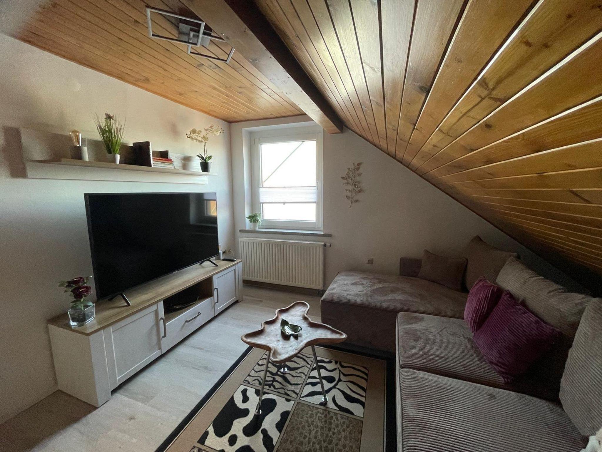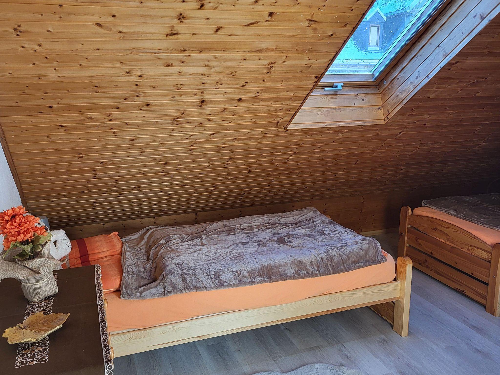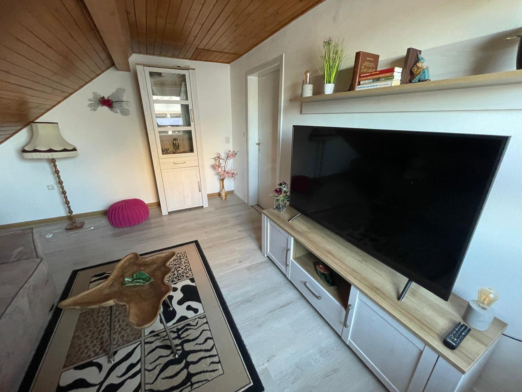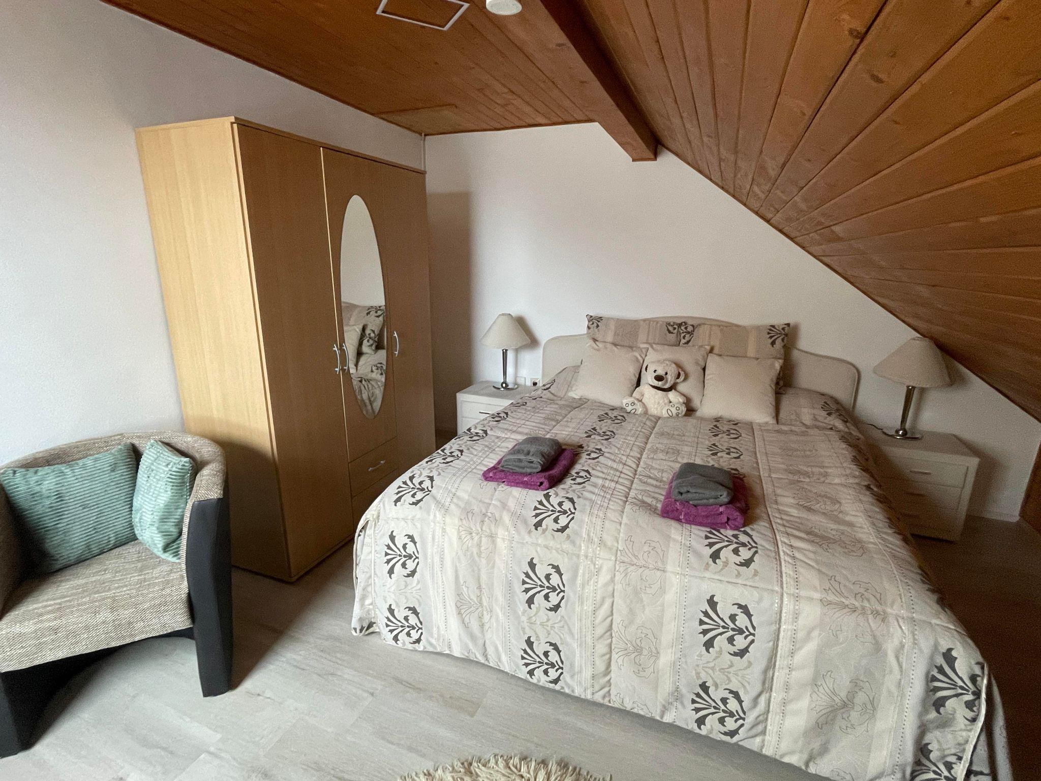 Unsere Dachgeschoss-Ferienwohnung bietet Platz für vier Personen und kann bei Bedarf zusätzlich im Wohnzimmer aufgebettet werden. Sie verfügt über zwei separate Schlafzimmer (eins mit großem Doppelbett und das zweite mit auseinanderstehenden großen Betten) , einen Wohnraum und eine separate, voll ausgestattete Küche mit Backofen, Geschirrspüler, Kühlschrank, Mikrowelle, Toaster und Kaffee-Maschine.