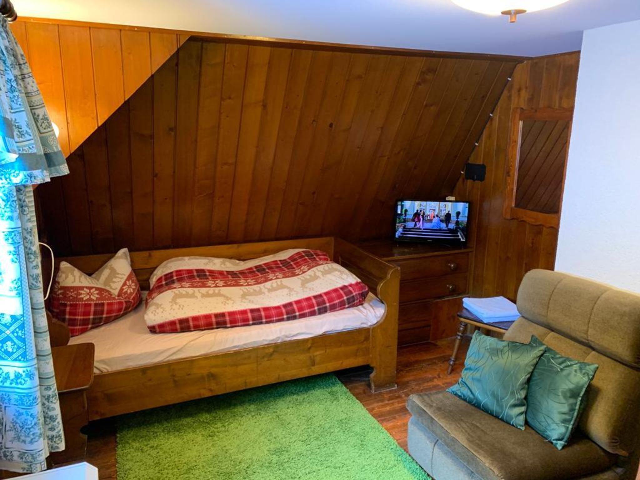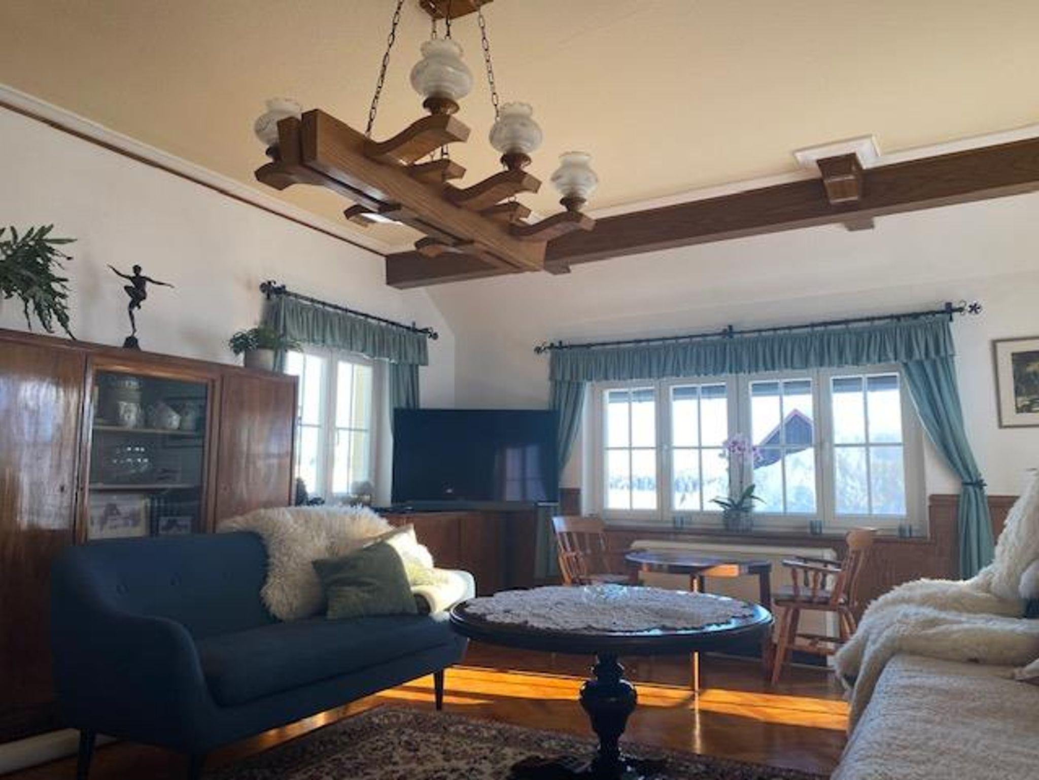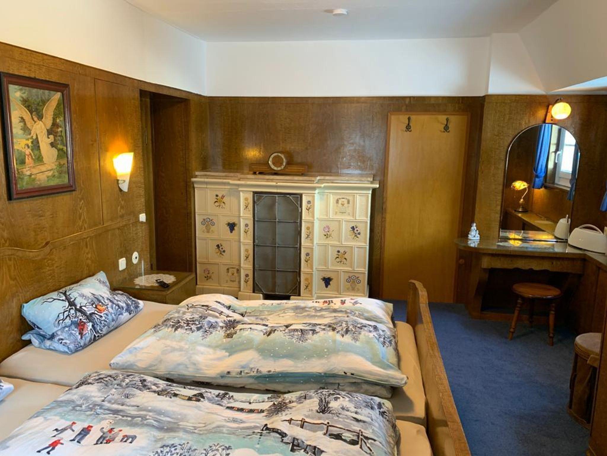 Die ehemalige Unternehmervilla aus dem Jahr 1936 ist ein Juwel, welches viele Schätze aus Gründerjahren im Originalzustand durch seine bewegte Geschichte erhalten konnte. Tauchen Sie ein, in das Prestige der 30-er Jahre. Sie parken an der Grundstücksgrenze. Ihr Gepäck nimmt den Aufzug, Sie den überdachten Aufgang zu Fuß oder bei trockenem Sonnenschein die Treppen. Nachdem Sie den Aufstieg zum Haus bewältigt haben, kommen Sie in einen herrlichen Empfangsbereich. Dort ist Platz für Gaderobe, Wanderschuhe, Skihelme usw. Abgehend dort finden Sie den Zugang zu Küche, Keller, Kaminzimmer und Bauerstube sowie die Treppe ins Obergeschoss. Im Obergeschoss gehen die drei Doppelzimmer 1,2,3 mit den Ehebetten ab und das Bad mit Dusche und WC, sowie ein extra WC. Über eine schmale Treppe gehts ins Dachgeschoss zu den äußerst gemütlichen DZ mit Einzelnbetten. Im Keller befindet sich die Sauna mit Tauchbecken, und Ruhebreich im Garten, 2 Duschen, 1 WC, Ruheberich mit Kamin und ein separates EZ.