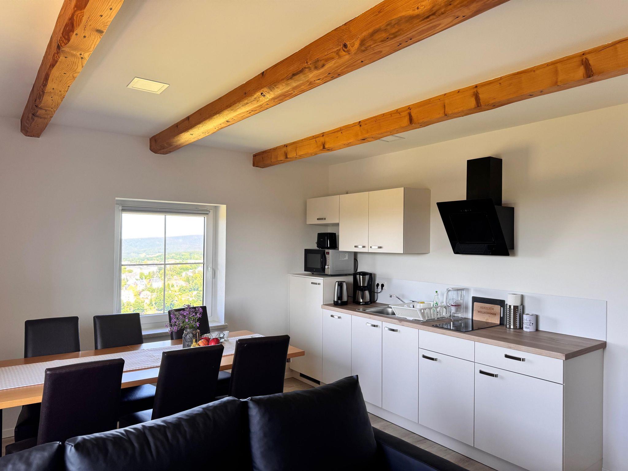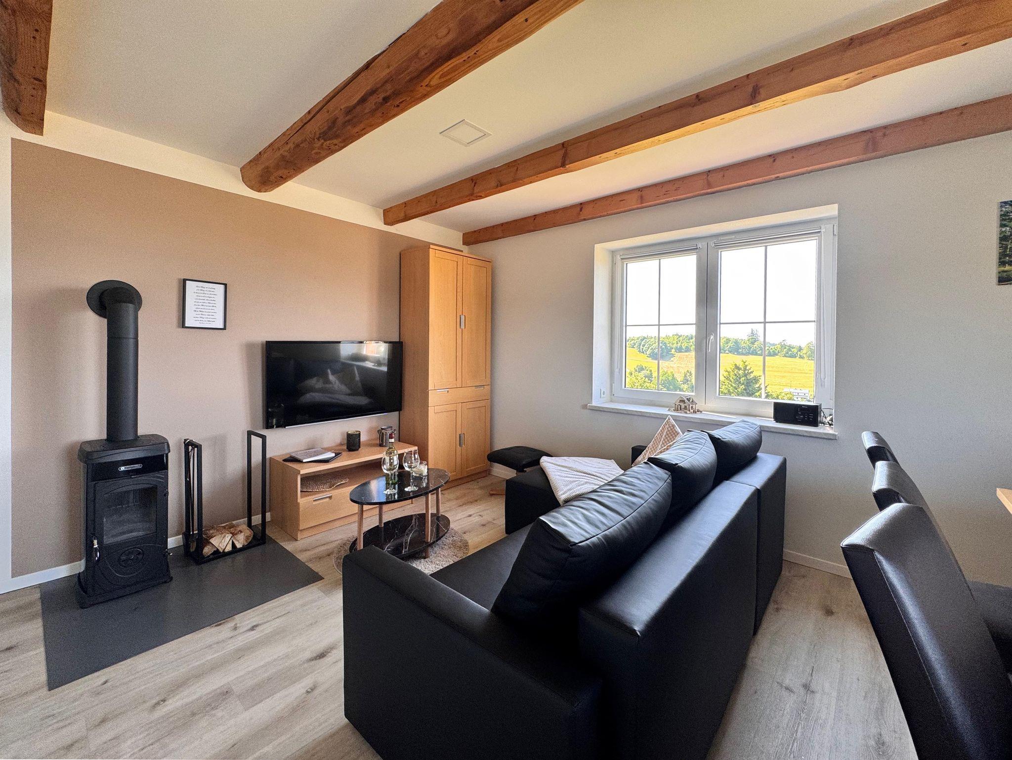 Die Ferienwohnung Fuchs bietet auf 51 Quadratmetern Platz für bis zu 7 Personen. Sie verfügt über ein Schlafzimmer mit einem Doppelbett sowie ein zweites Schlafzimmer mit zwei Etagenbetten. Im Wohnbereich befindet sich ein Schlafsofa, welches als Schlafmöglichkeit für die 7. Person dient. Der offene Wohnbereich verfügt zudem über TV, DAB-Radio mit Bluetooth und einen Kamin. Die Einbauküche ist mit Kühlschrank, Tiefkühlfach, Geschirrspülmaschine, Dunstabzugshaube, 2- Felder-Ceranfeld, Mikrowellenbackofenkombination, Dunstabzugshaube, Kaffeemaschine, Toaster, Wasserkocher, Eierkocher, Brotschneidemaschine voll ausgestattet. Das Tageslichtbad verfügt über Dusche, WC, Waschbecken und einen Handtuchheizkörper. Die gesamte Wohnung wird zentral über eine Fußbodenheizung beheizt. Die Bettwäsche und Handtücher sind inklusive. WLAN und Parkplatz sind kostenfrei vorhanden. Es gibt auch eine kostenfreie Abstellmöglichkeit für Ski, Fahrräder & Co. Es handelt sich um eine Nichtraucherwohnung.