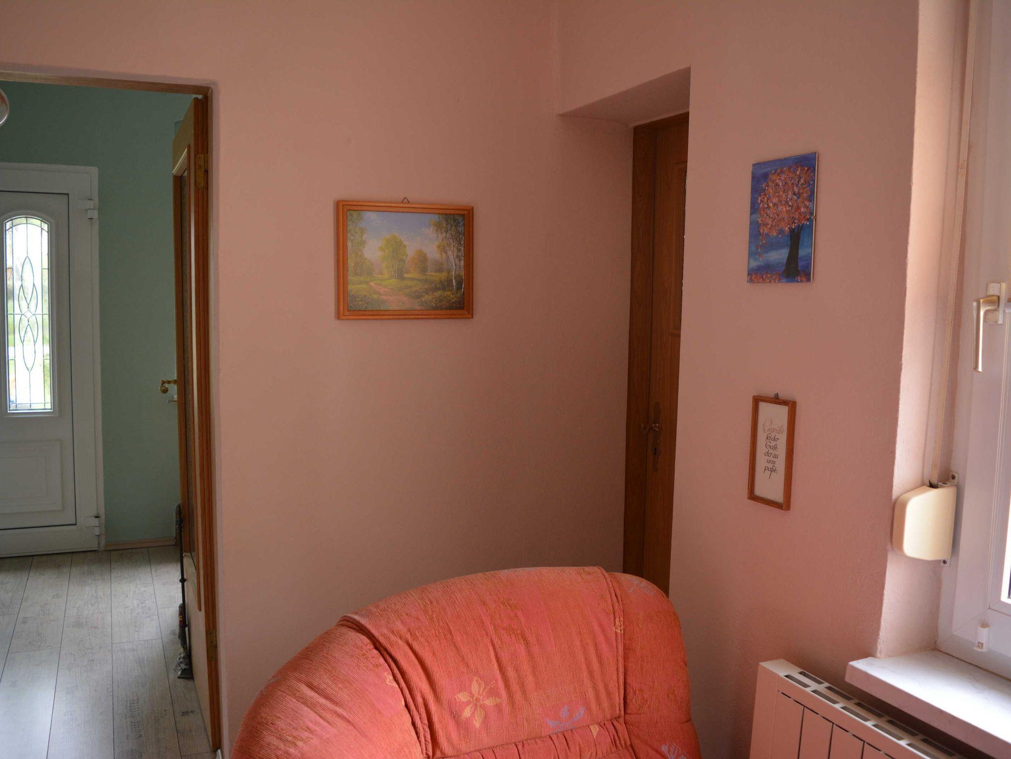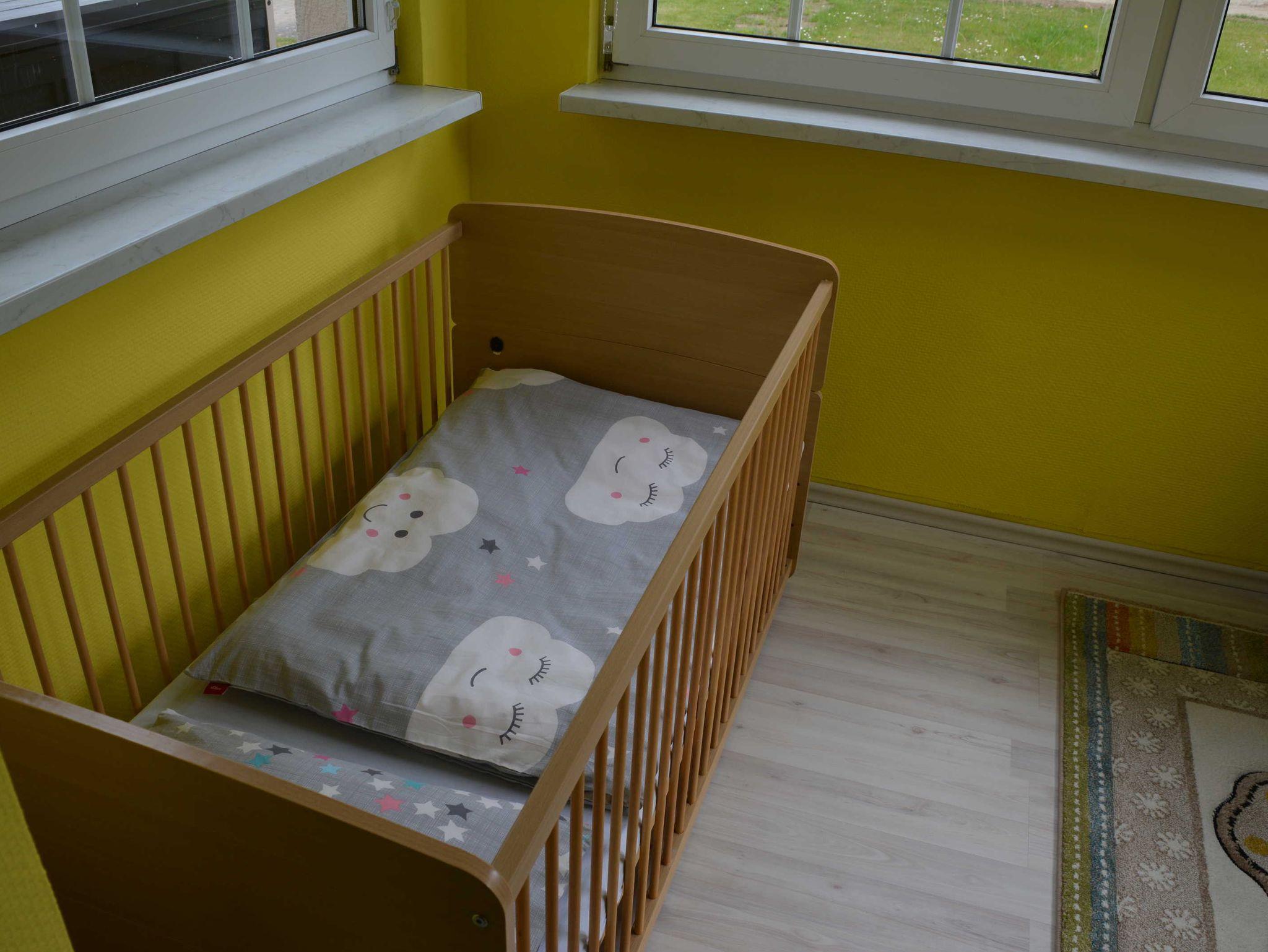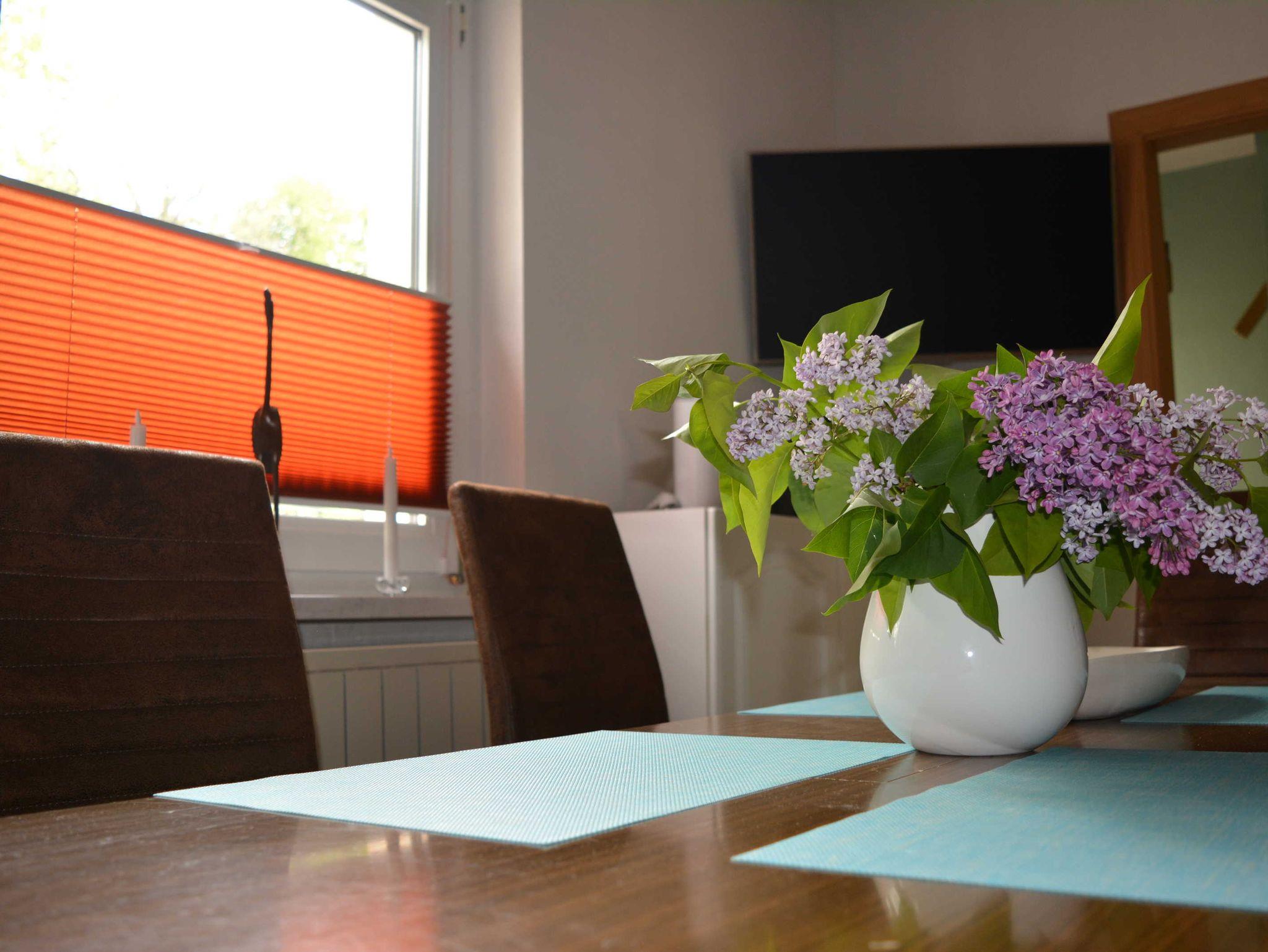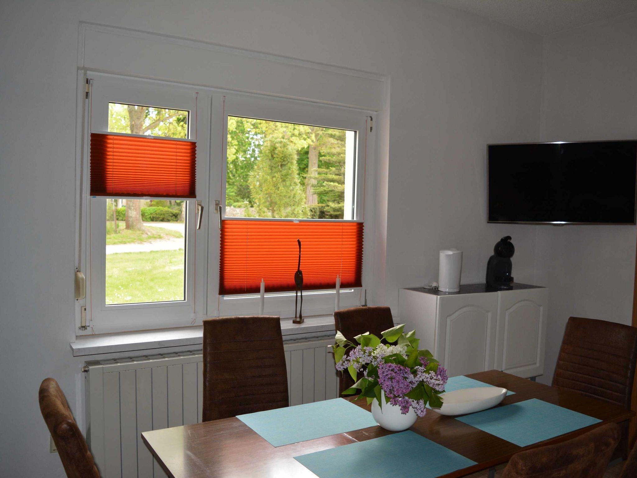 Ferienhaus in ruhiger Ortslage Wohnfläche 73 m² für 1-4 Personen; Büroarbeitsplatz und Kinderspielecke; Wohnküche (Ceranfeld, Backofen, Geschirrspüler, Mikrowelle, Kaffeemaschine, Kaffeevollautomat, Toaster, Kühl-Gefrierkombination, große Couch, Esstisch, WLAN, Satelliten-TV); ein Schlafzimmer mit Doppelbett, anliegend Büroarbeitsplatz; ein weiteres Schlafzimmer für 2 Personen mit 2 Einzelbetten, Kleiderschrank, Bügelbrett und Bügeleisen; Garderobe mit Ottomane; Badezimmer mit WC, Waschmaschine, Waschbecken, Duschkabine und Haartrockner; Baby-Essstuhl; Terrasse mit Sonnenschirm, gemütlichen Gartenmöbeln und Holzkohlegrill; 2 PKW Stellplätze; Zentralheizung