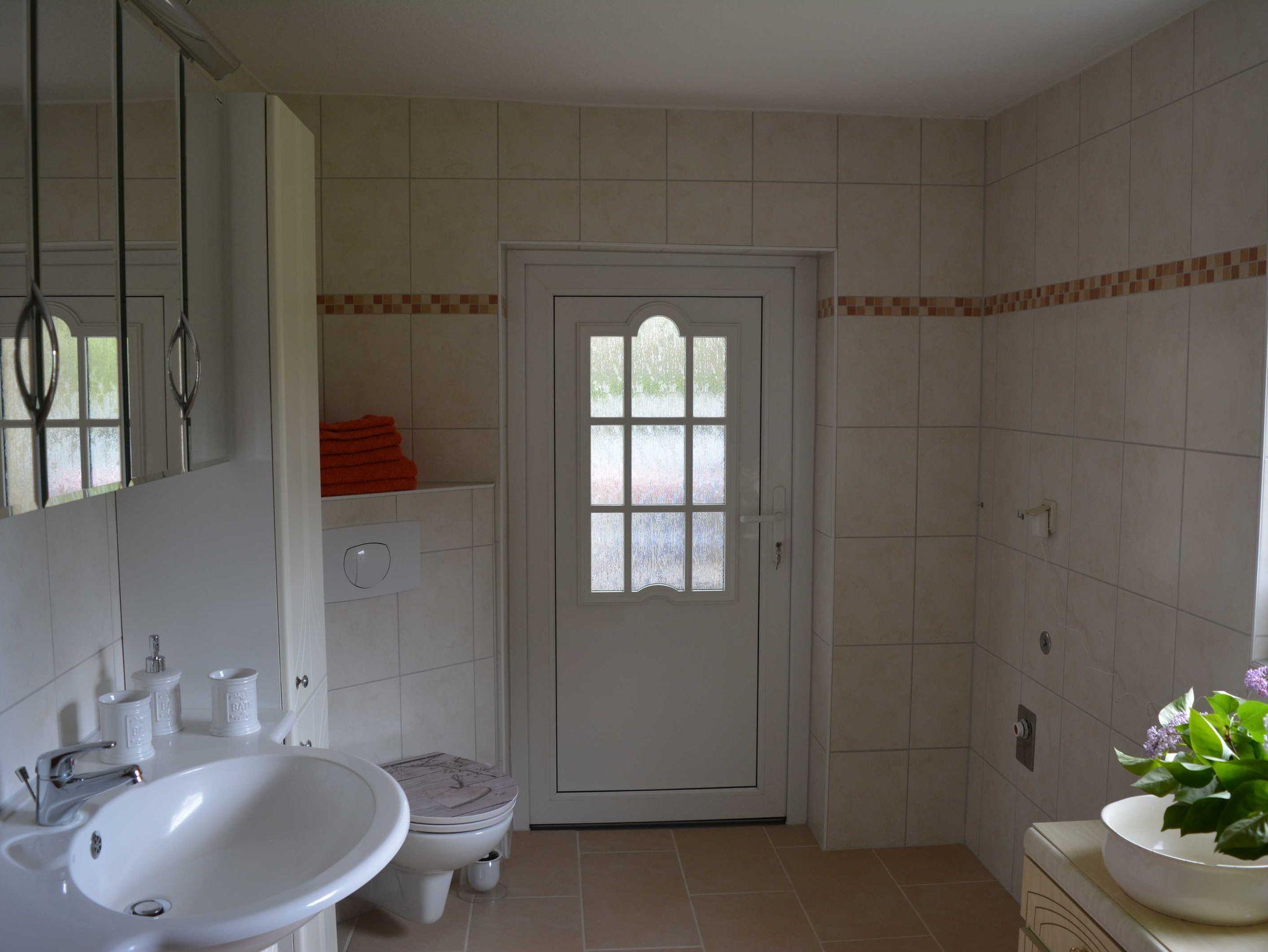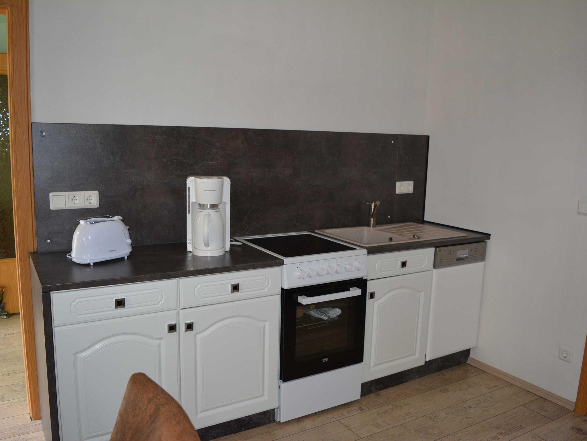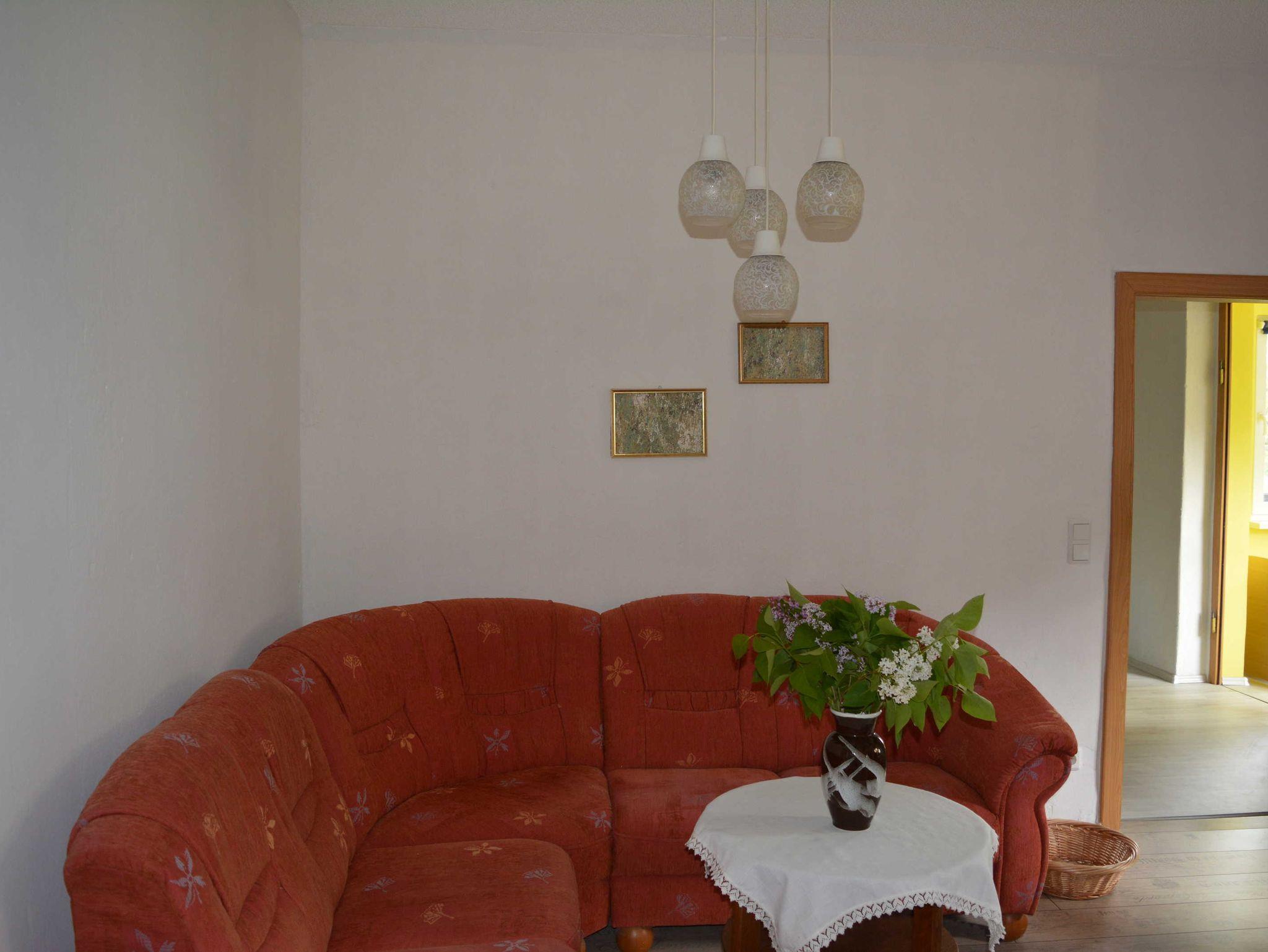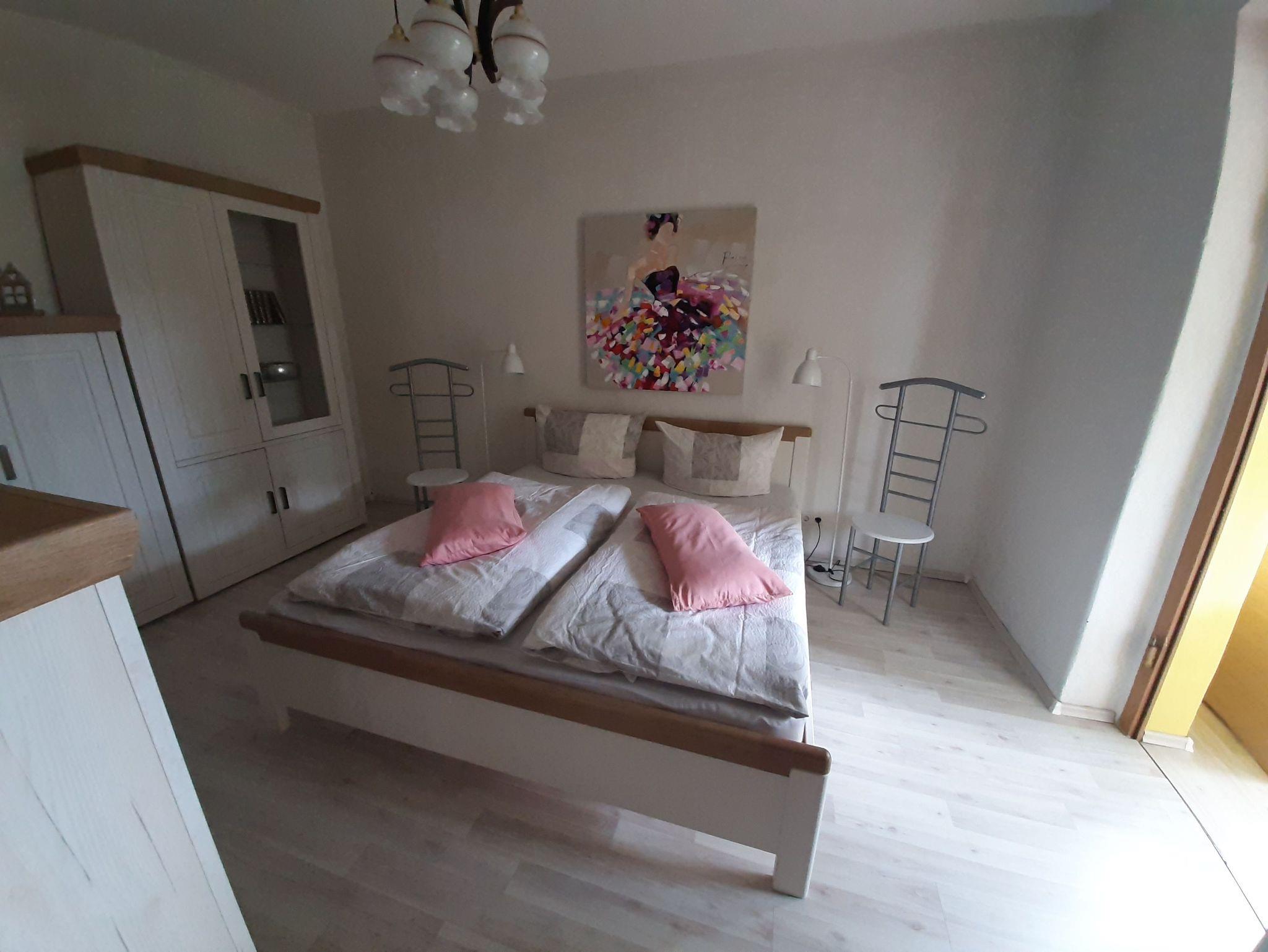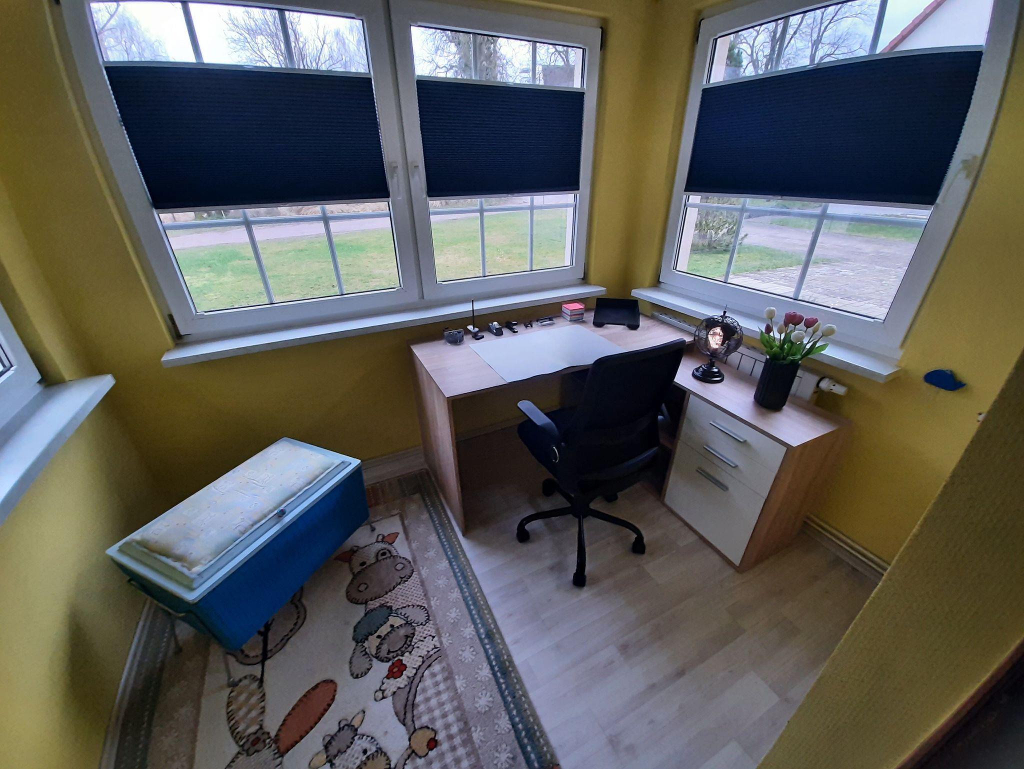 Ferienhaus in ruhiger Ortslage Wohnfläche 73 m² für 1-4 Personen; Büroarbeitsplatz und Kinderspielecke; Wohnküche (Ceranfeld, Backofen, Geschirrspüler, Mikrowelle, Kaffeemaschine, Kaffeevollautomat, Toaster, Kühl-Gefrierkombination, große Couch, Esstisch, WLAN, Satelliten-TV); ein Schlafzimmer mit Doppelbett, anliegend Büroarbeitsplatz; ein weiteres Schlafzimmer für 2 Personen mit 2 Einzelbetten, Kleiderschrank, Bügelbrett und Bügeleisen; Garderobe mit Ottomane; Badezimmer mit WC, Waschmaschine, Waschbecken, Duschkabine und Haartrockner; Baby-Essstuhl; Terrasse mit Sonnenschirm, gemütlichen Gartenmöbeln und Holzkohlegrill; 2 PKW Stellplätze; Zentralheizung