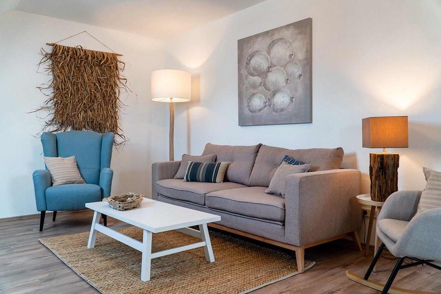 Die Ferienwohnung "Meereszeiten" wurde mit viel Liebe zum Detail ausgestattet und bietet mit einem Schlafzimmern und einer zusätzlichen Schlafcouch im Wohnzimmer Platz für 1-3 Personen.