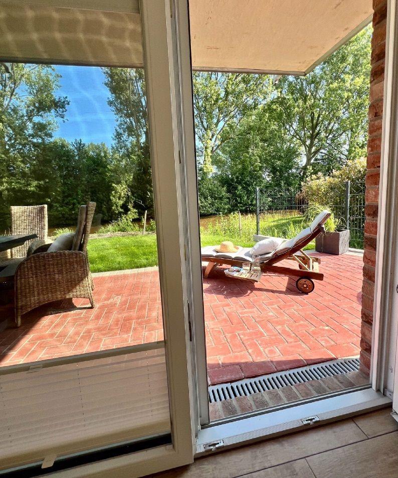 Die Terrasse wurde großzügig und um die gesamte Wohnung umlaufend angelegt. Auf der Hauptterrasse können Sie den direkten Ausblick auf das Siel genießen. Nehmen Sie hier an dem hochwertigen großen und ausziehbaren Esstisch mit bequemen Gartensesseln Platz. Ein Weber-Kugelgrill steht mit Zubehör für einen gemütlichen Grillabend ebenfalls zur Verfügung. Nehmen Sie in den hochwertigen Teakholzsesseln auf der kleinen Terrasse mit Ost-Ausrichtung Platz. Genießen Sie hier die Morgensonne bei einer Tasse Tee oder Kaffee. Ein Sonnenbad können Sie auf der Teakliege nehmen. Vor einem Sonnenbrand schützt Sie ein großer Sonnenschirm.