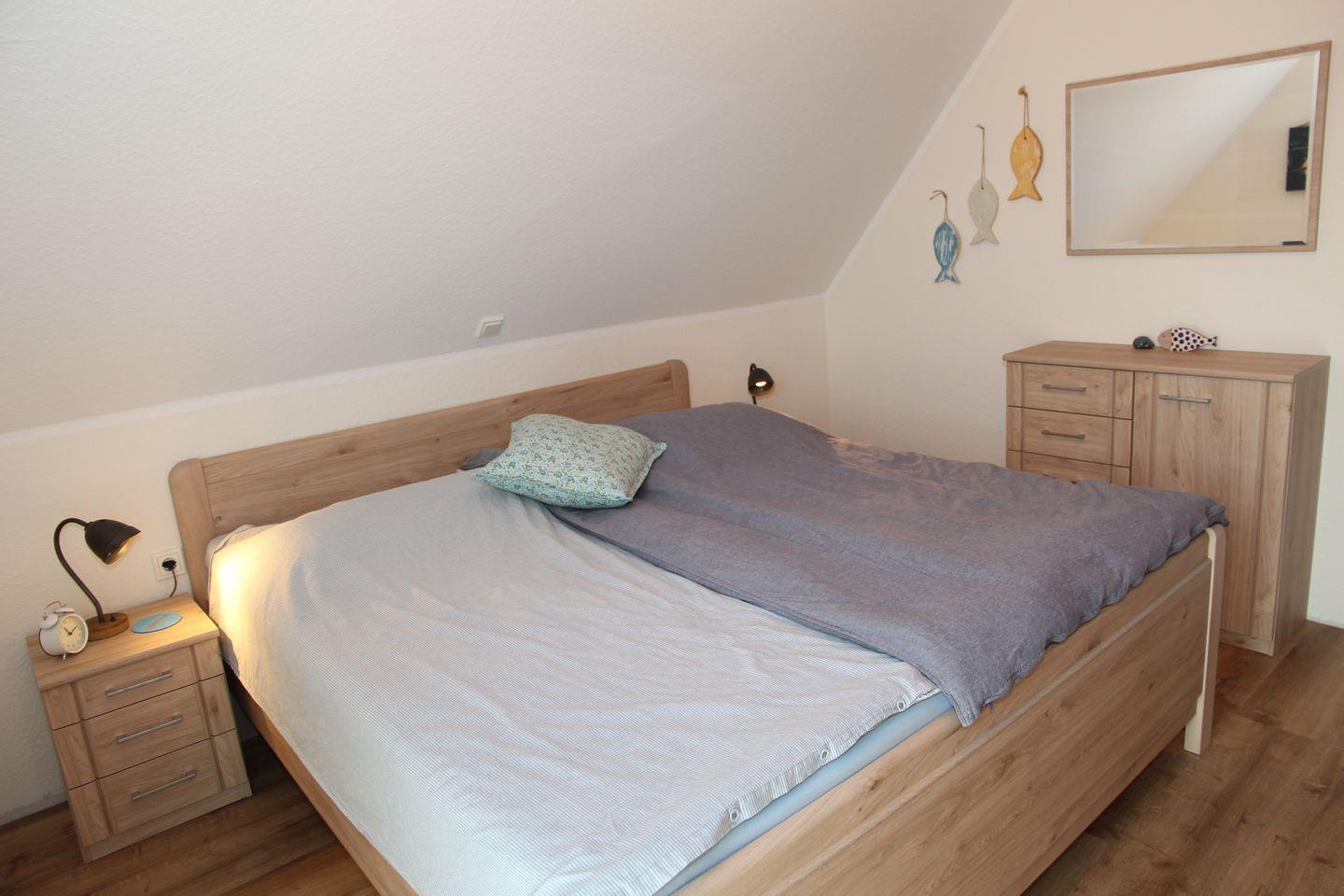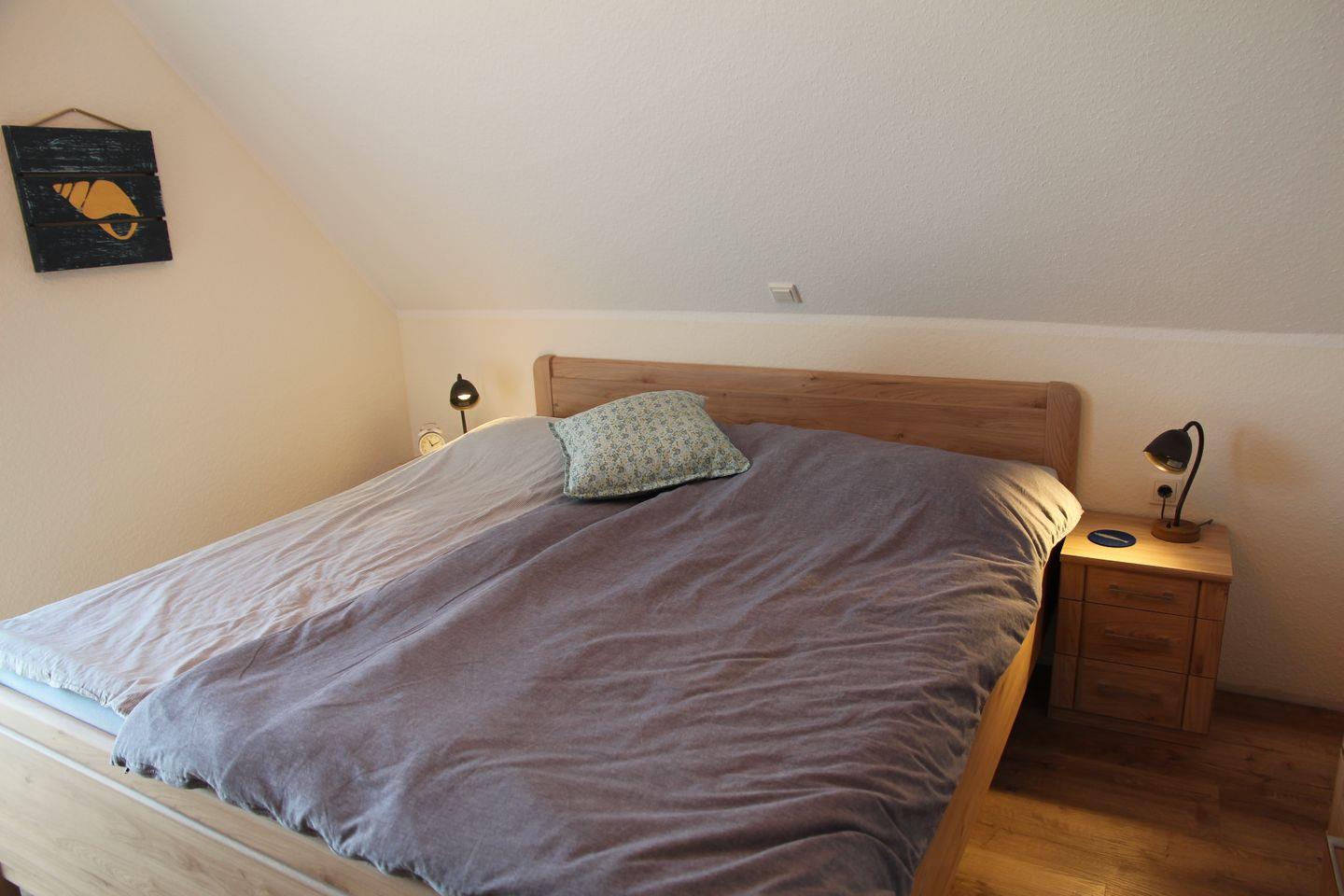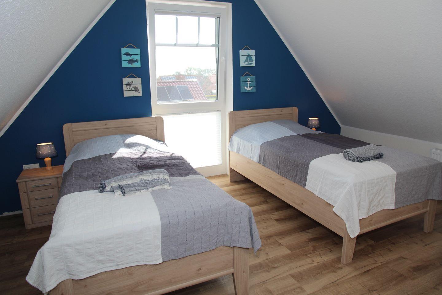 Im ausgebauten Dachgeschoss finden Sie eine schöne Galerie mit zwei Einzelbetten (1,00m x 2,00m Matratzen), Kommode, Sessel und einem Schreibtisch. Auch von hier haben Sie einen tollen Blick über den Kanal und die dahinterliegenden Felder!