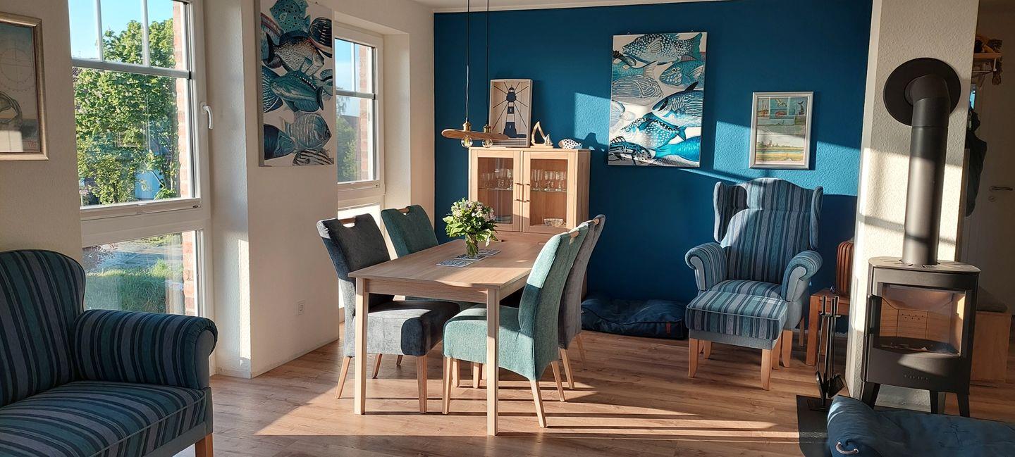 Entspannte Zeit mit TiefBlick in Eilsum, dem beschaulichen Dorf in der Krummhörn, gelegen am Alten Greetsieler Sieltief, umgeben von Feldern, Natur und ostfriesischer Weite, unweit vom malerischen Greetsiel, das wünschen wir Ihnen. Ausgedehnte Spaziergänge für Mensch und Hund sowie Radtouren durch die Krummhörn und zur Nordseeküste sind wohltuend für Geist und Seele. Hell, sehr geräumig, immer mit Blick auf das Sieltief befindet sich unsere gemütlich eingerichtete und gut ausgestattete Wohnung im ersten Ober- und im Dachgeschoß des Hauses. Ostfriesensofa, Ohrensessel, Kaminofen und Balkon laden ein, tief zu blicken und zu entschleunigen.
