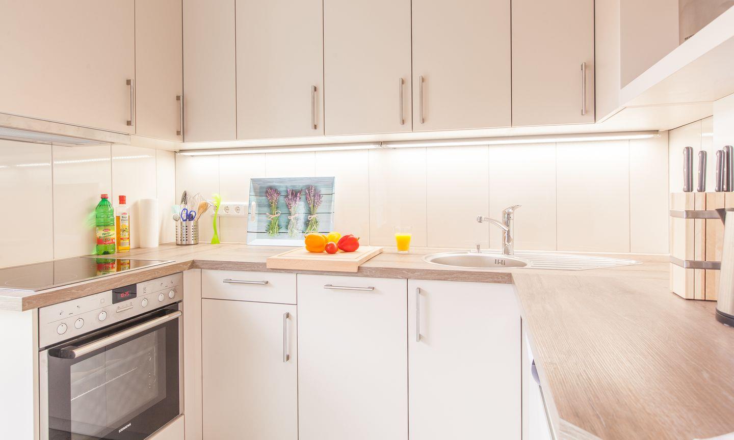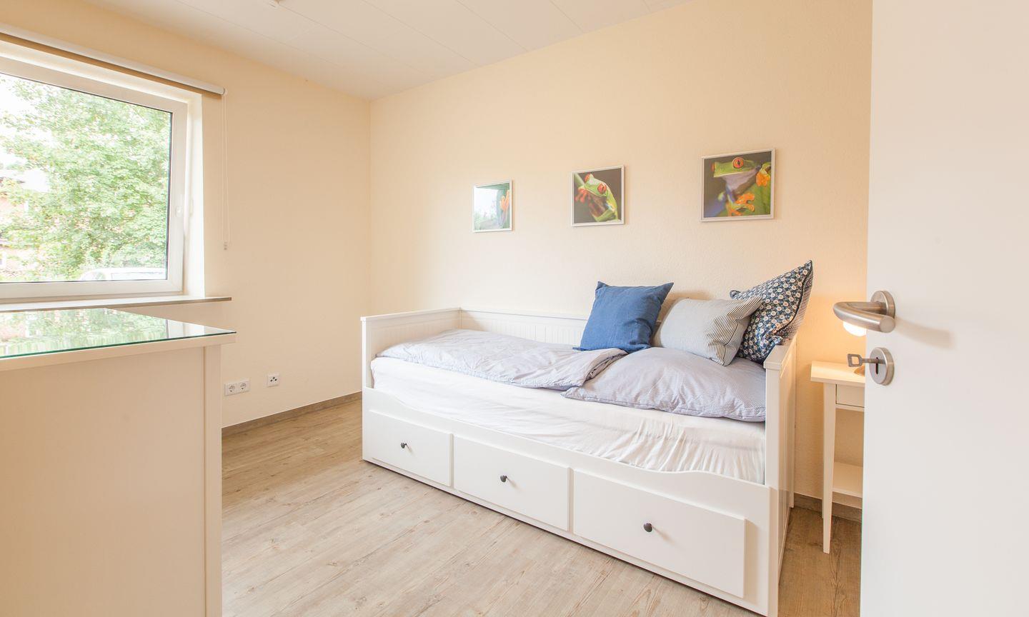 Weiter geht`s, für besondere Kocherlebnisse, in eine voll ausgestattete Küche mit Zugang zur Terrasse. Das Highlight dieses Hauses ist das großzügige Wohn-/ Esszimmer mit gemütlichem Sofa, großem TV und einer Essecke. Das Hauptschlafzimmer bietet ein Doppelbett und einen großen Kleiderschrank für die ganze Familie. Zusätzlich gibt es 2 Schlafzimmer mit einem Einzelbett und einer Kommode. Die Schlafzimmer sind mit Fliegengittern ausgestattet. Das Badezimmer verfügt über eine ebenerdige Dusche mit einer Rainshower Regendusche, Handtuchtrockner und Fenster. Der ca. 400 m² große Garten mit geschützter Terrasse bietet eine Sitzgruppe mit Sonnenschirm, 1 Holzkohlegrill und 2 Sonnenliegen. Fahrräder können sicher im abgeschlossenen Abstellschuppen abgestellt werden.