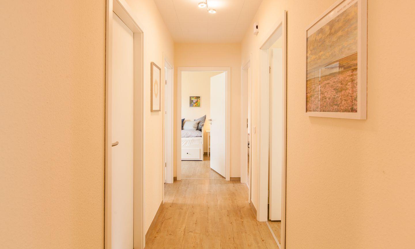 Der Eingang des Ferienhauses ist ein heller Flur mit Gäste-WC und HWR.