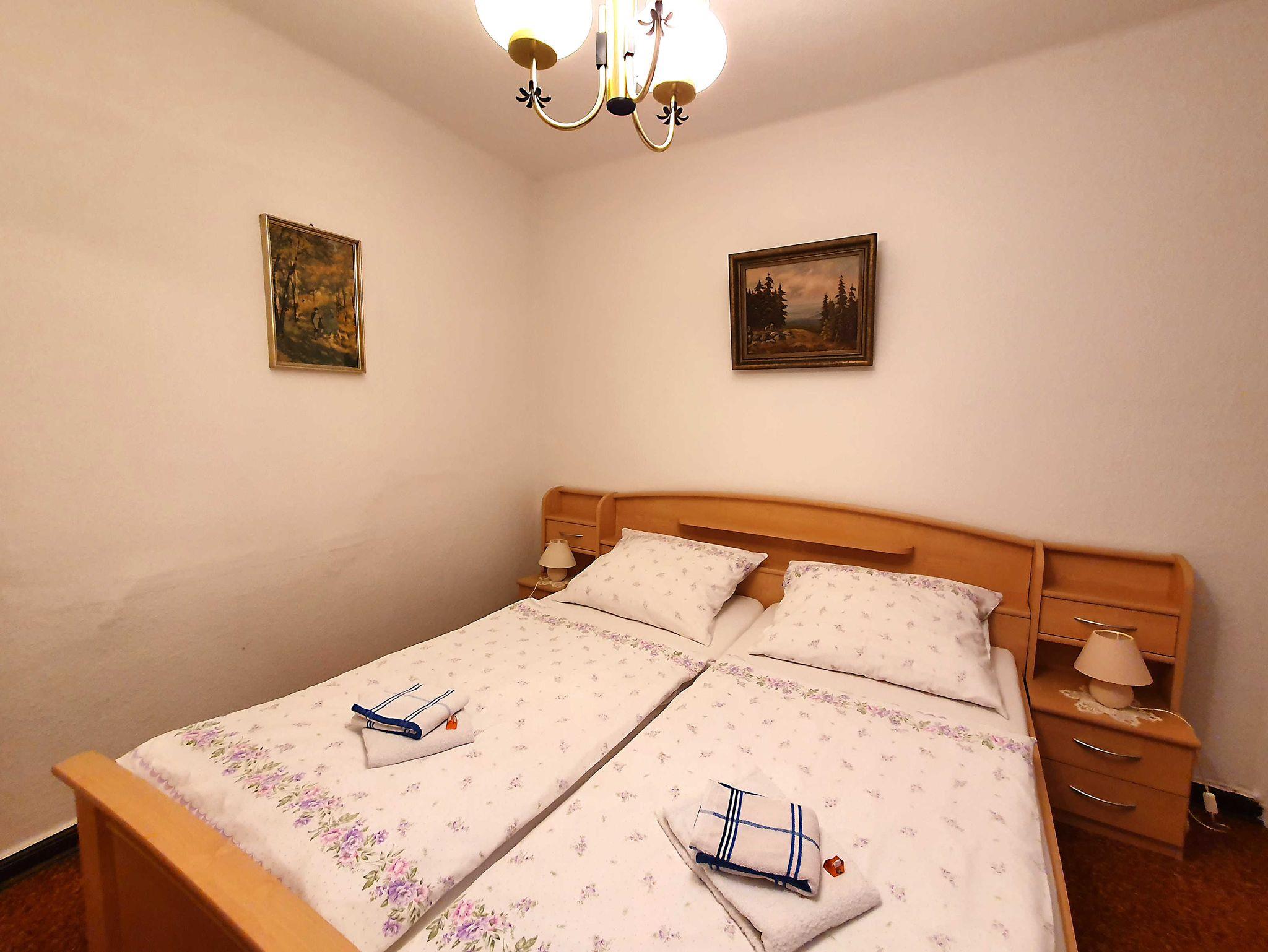 Die Ferienwohnung befindet sich im Erdgeschoss des Hauses und bietet den Gästen eine Wohnfläche von ca.77 qm. Es stehen zwei separate Schlafzimmer, ein Wohnzimmer, eine Wohnküche mit angrenzender Veranda sowie WC und Badewanne zur Verfügung.