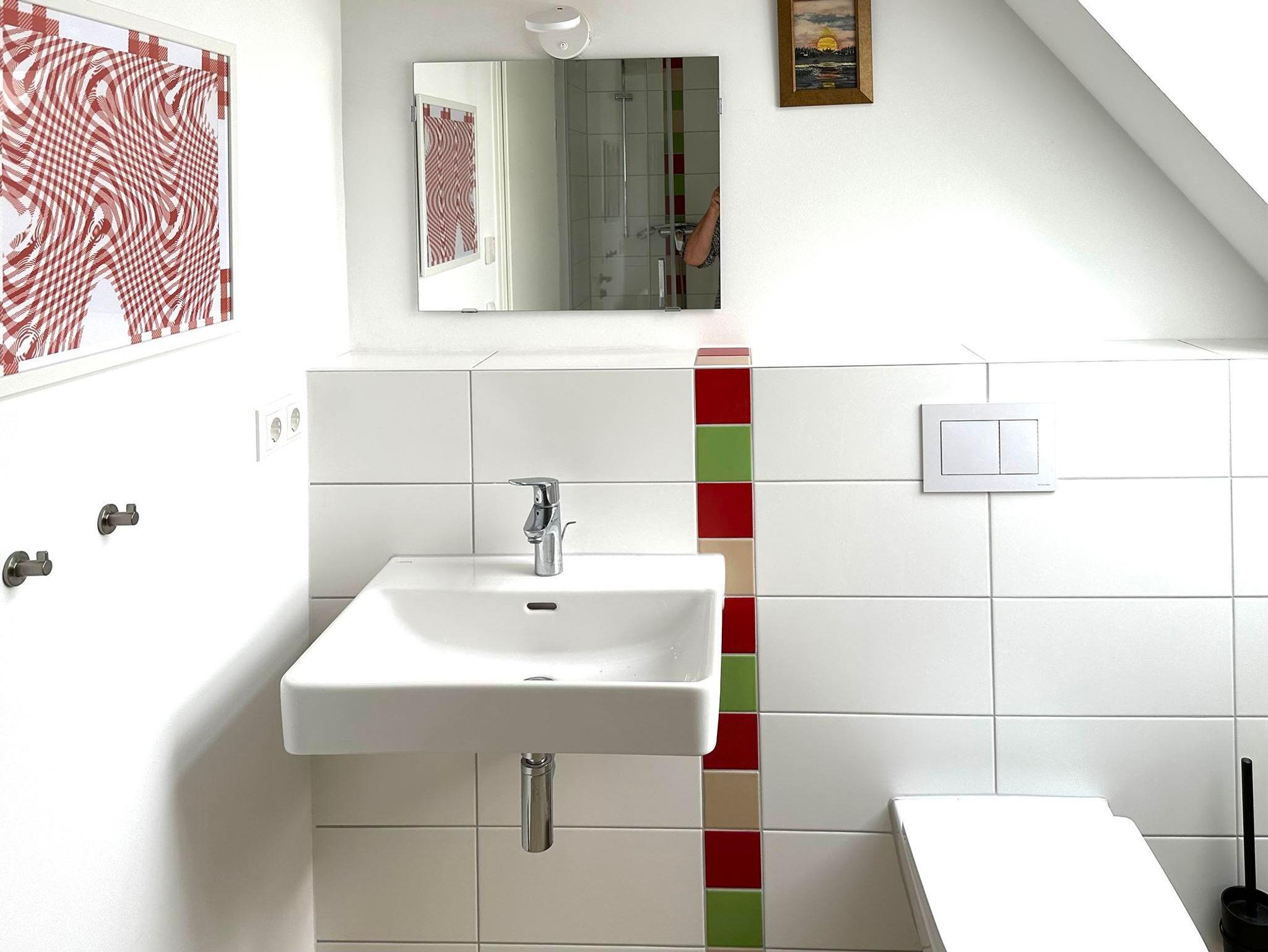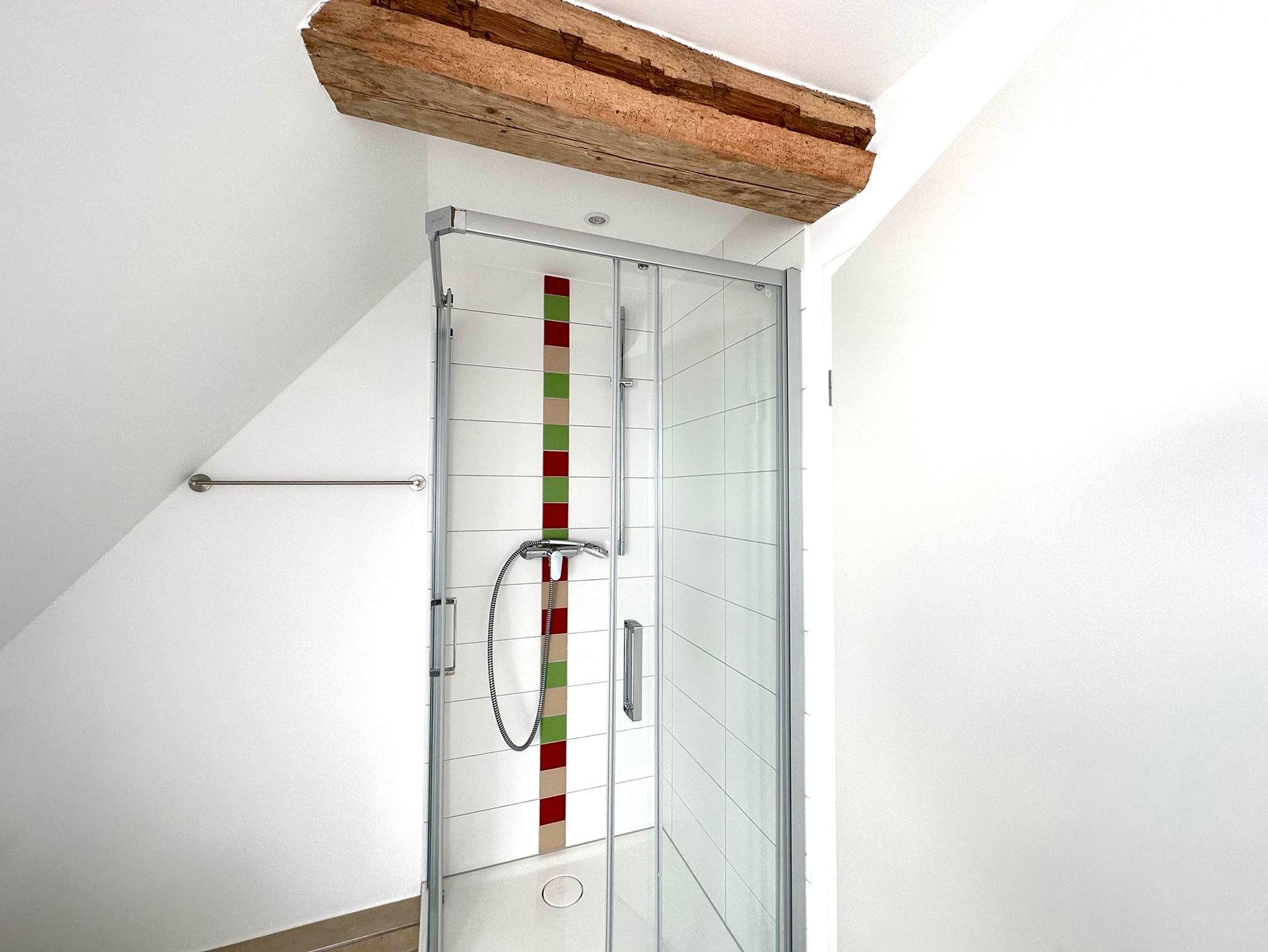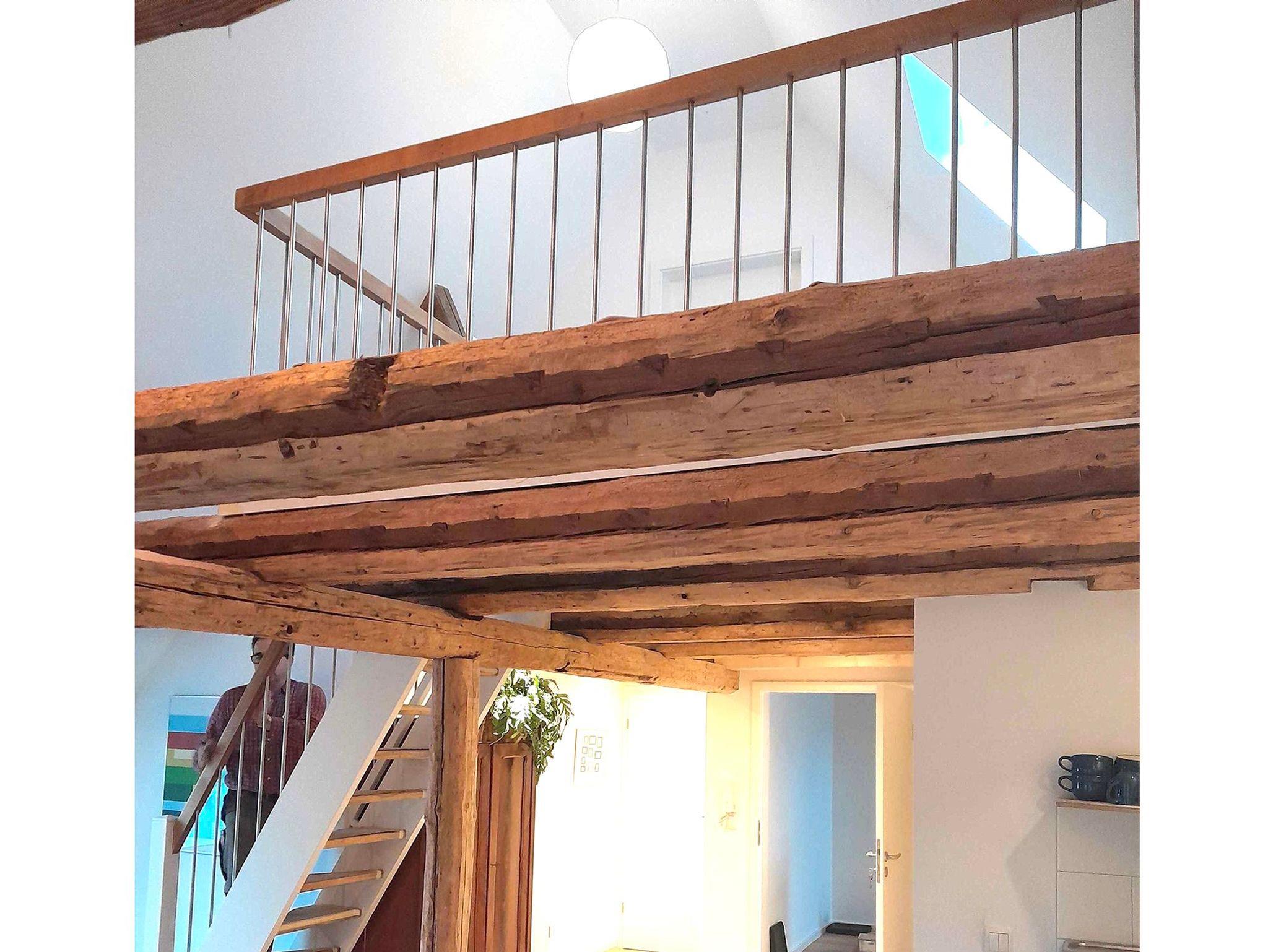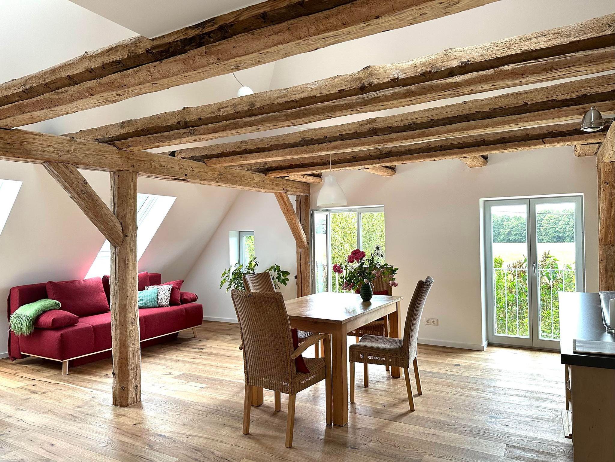 Die Fewo Horst 1_ rot im OG ist grundsaniert und ganz neu. Die 60 qm plus 6 qm Empore bieten Raum für 1-5 Personen. Der großzügige Wohnbereich ist zum Dach geöffnet. Die freigelegten Balken und der Holzfußboden geben der Wohnung ein besonderes Flair – attraktiv ist die Empore als Rückzugsort oder zum Spielen. Es gibt zwei Schlafzimmer: einen Doppelbett-Schlafraum und einen weiteren Einzelbett-Schlafraum. Zusätzlich gibt es ein hochwertiges Schlafsofa, auf dem zwei Personen gut schlafen können. Das Duschbad ist gräumig und hell. Die Küchenzeile und die Elektrogeräte darin sind neu.