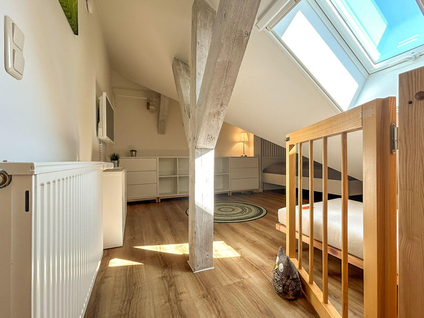 Über eine große Holztreppe gelangt ihr in den Flur des 1. Obergeschosses. Von hier aus könnt ihr das geräumige Duschbad oder das gemütliche Schlafzimmer (Doppelbett 160 x 200 cm) betreten. Dort ist ebenfalls ein TV verfügbar. Außerdem ist das Zimmer mit einem kleinen Schreibtisch möbliert, an dem ihr Postkarten über euren fantastischen Aufenthalt an der Ostseeküste schreiben könnt. In dem Kleiderschrank und einem offenen Regal habt ihr die Möglichkeit, eure Urlaubsgarderobe zu verstauen.