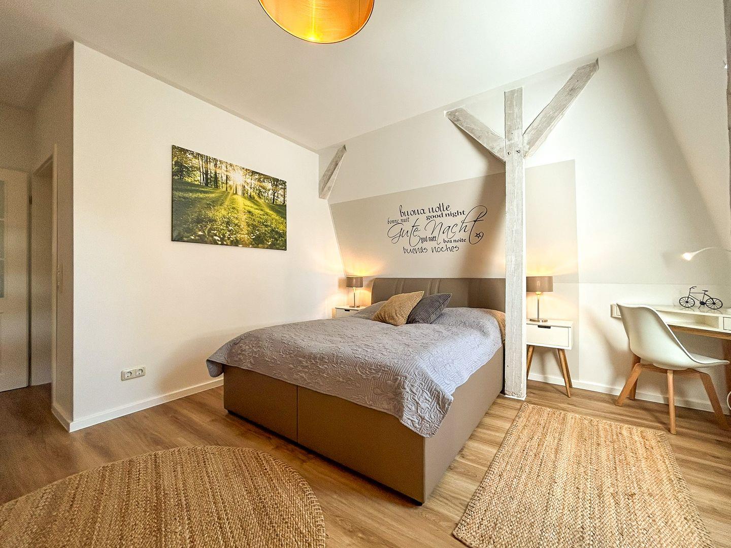 Du bewohnst die Wohnung auf drei Etagen, die im Hauptgebäude eines ehemaligen Bauernhofs integriert ist. Der Hof liegt in ruhiger Lage unweit von Naturstrand, Steilküste und Küstenradweg in Elmenhorst, außerhalb von Boltenhagen (ca. 10min Fahrzeit).