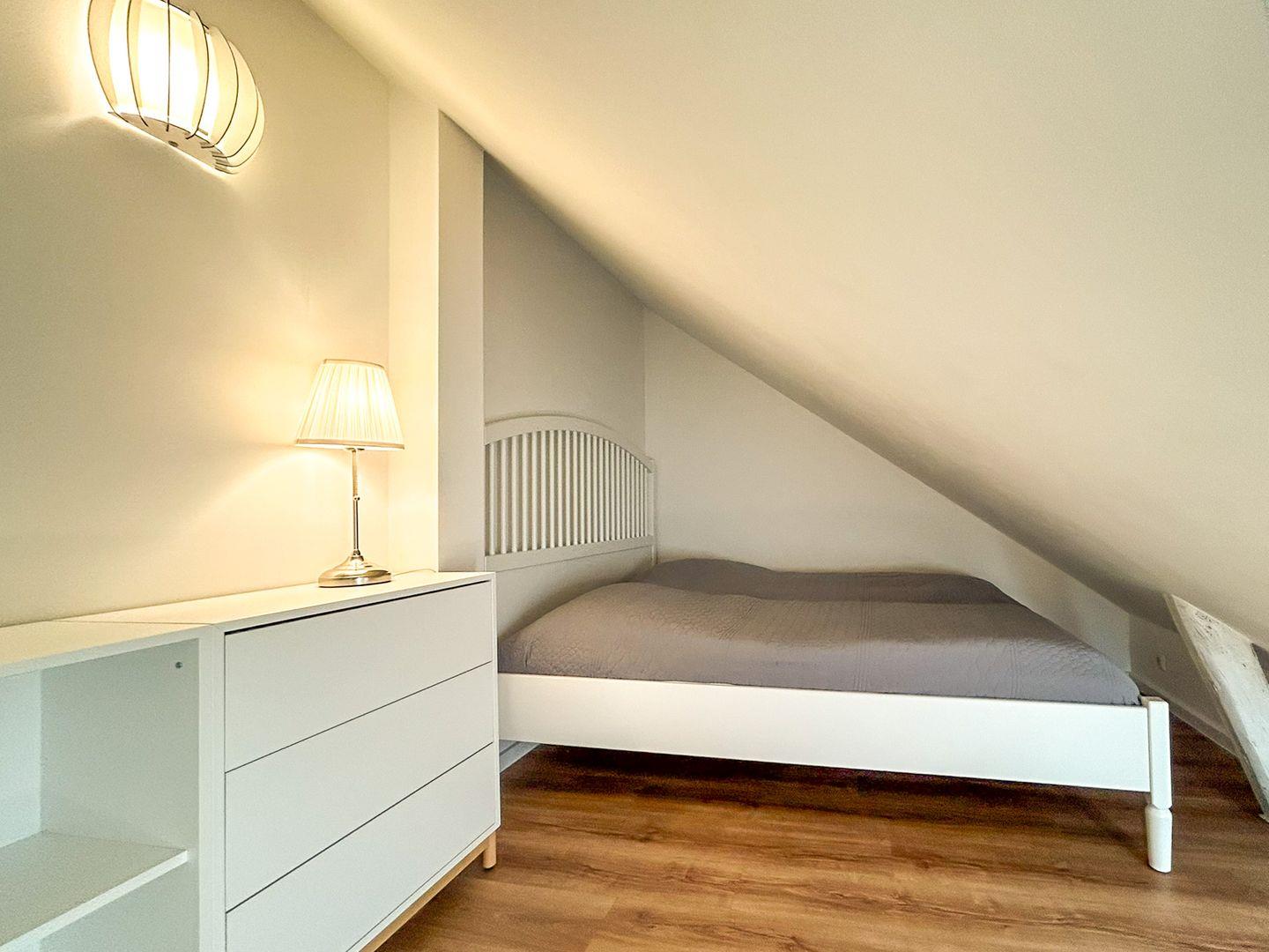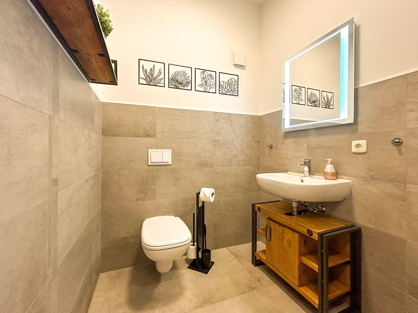 Im Erdgeschoss befindet sich zudem das modern eingerichtete Gäste-WC. Außerdem ist ein Abstellraum vorhanden, in dem ihr einen Staubsauger und weitere Reinigungsutensilien findet und in welchem ihr eure Koffer abstellen könnt.