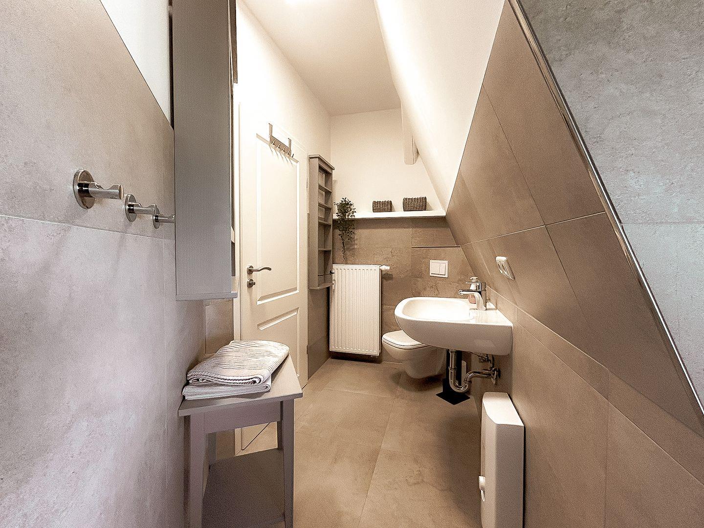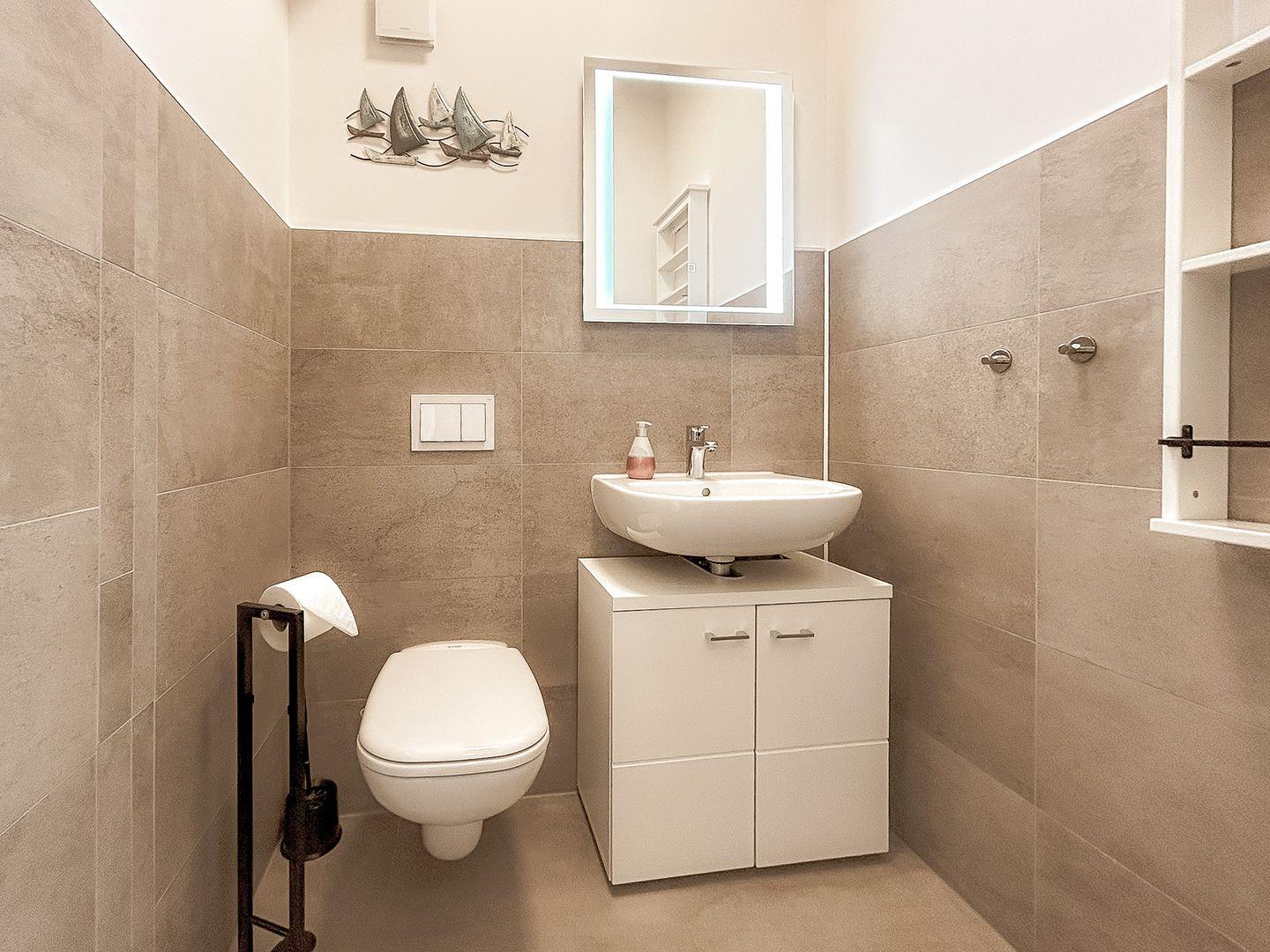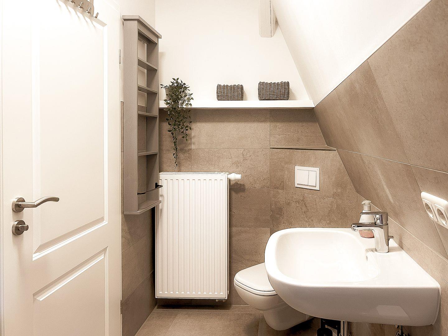 Die gesamte Wohnung ist schick und stilvoll eingerichtet und lässt augenblicklich ein Wohlfühlgefühl aufkommen. Im Erdgeschoss dieses individuell geschnittenen Apartments befindet sich weiterhin das modern ausgestattete Gäste-WC. Außerdem ist ein Abstellraum vorhanden, in dem ein Staubsauger und weitere Utensilien des täglichen Bedarfs untergebracht werden können.