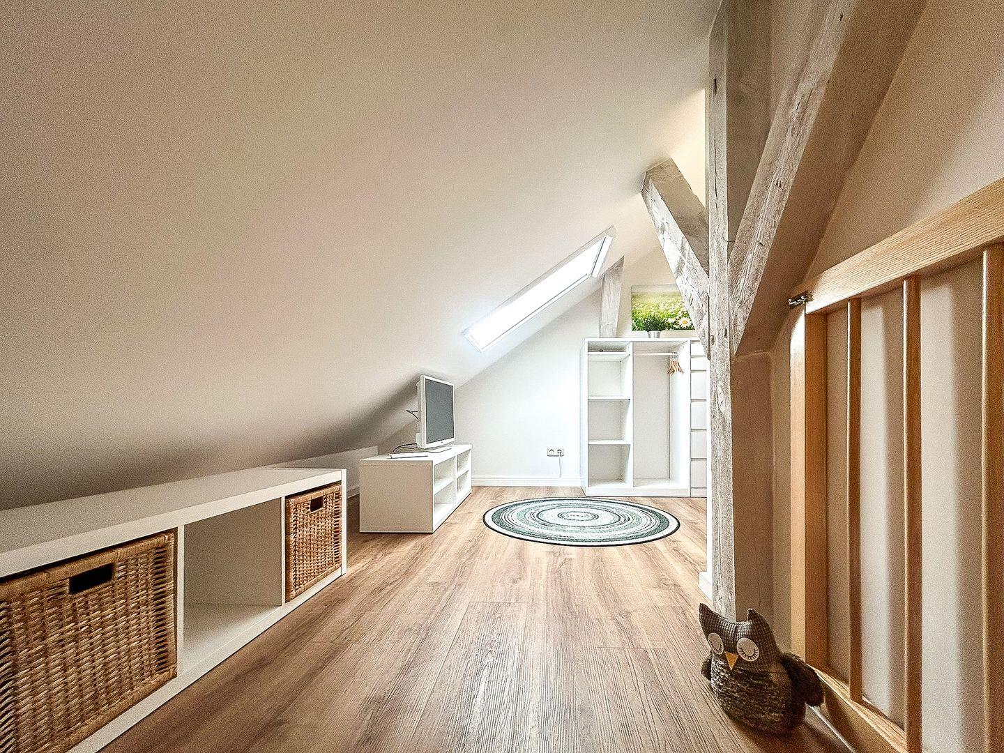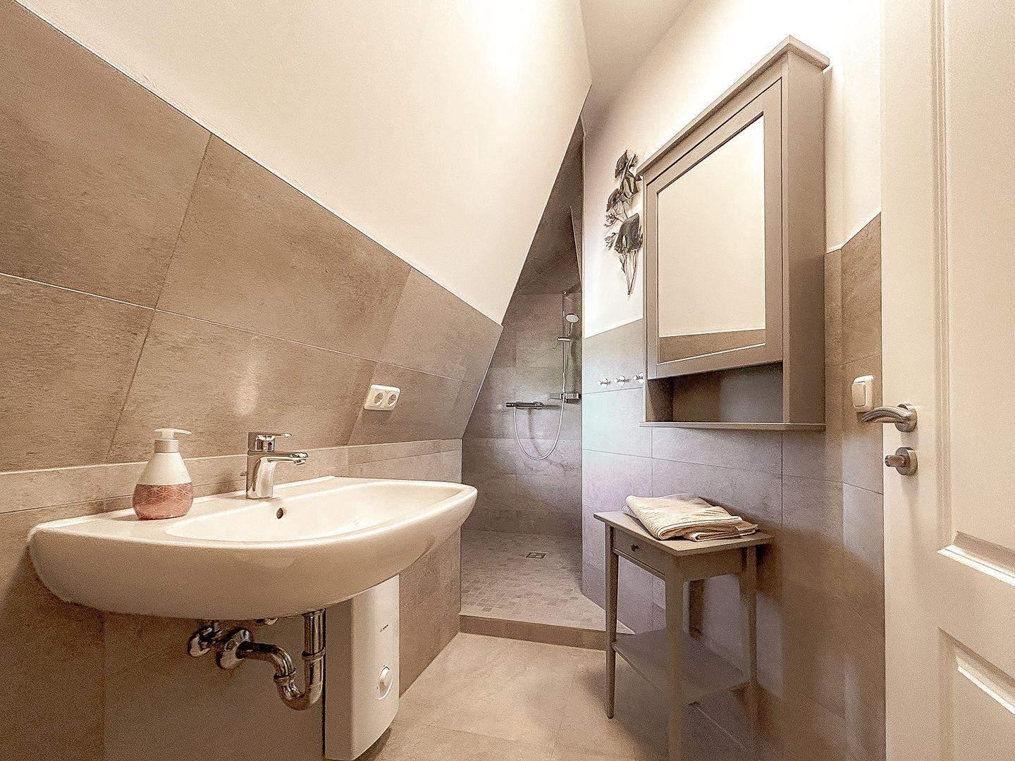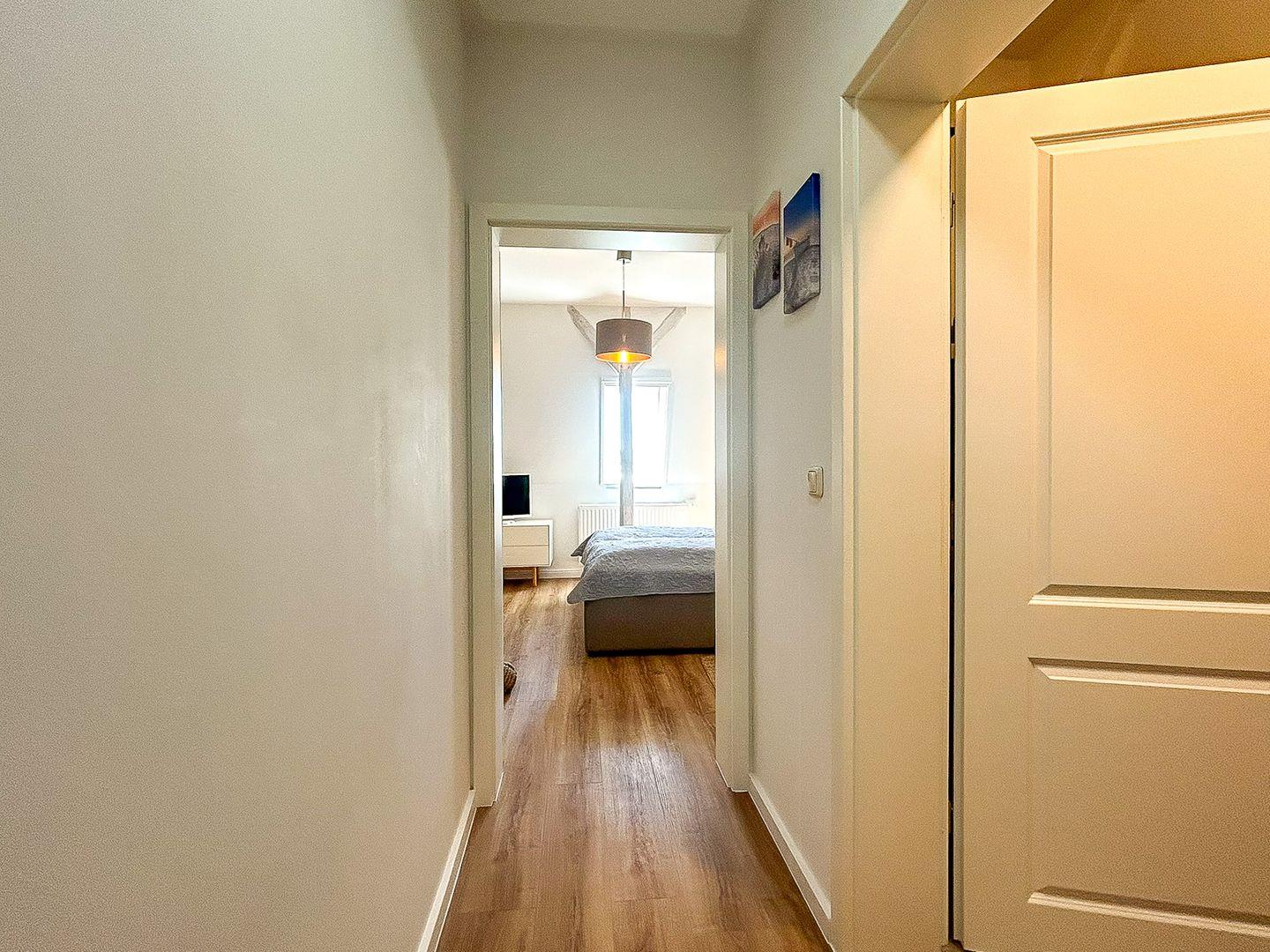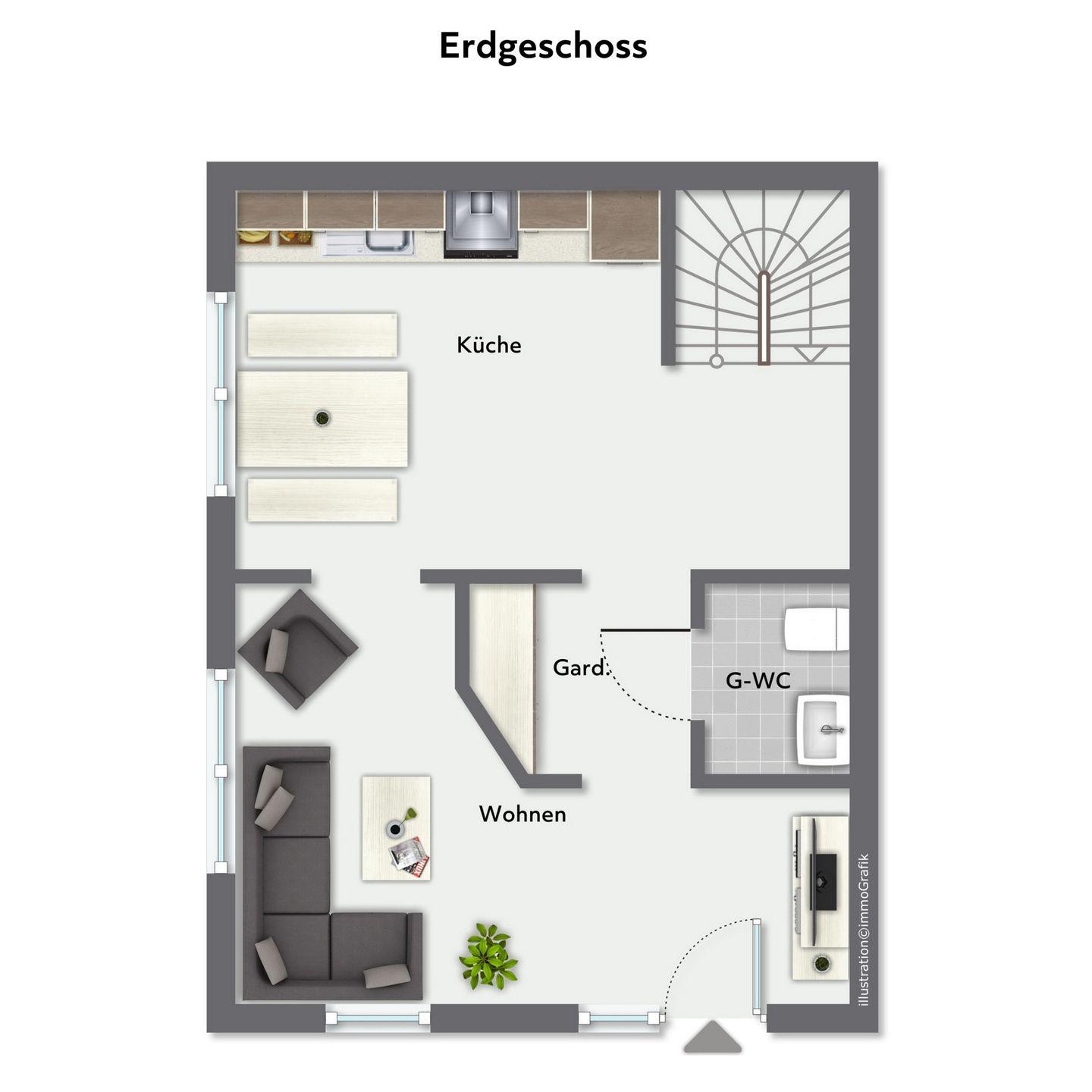Die gesamte Wohnung ist schick und stilvoll eingerichtet und lässt augenblicklich ein Wohlfühlgefühl aufkommen. Im Erdgeschoss dieses individuell geschnittenen Apartments befindet sich weiterhin das modern ausgestattete Gäste-WC. Außerdem ist ein Abstellraum vorhanden, in dem ein Staubsauger und weitere Utensilien des täglichen Bedarfs untergebracht werden können.