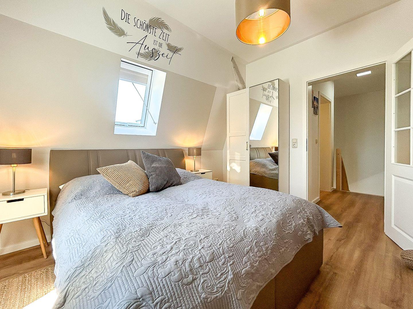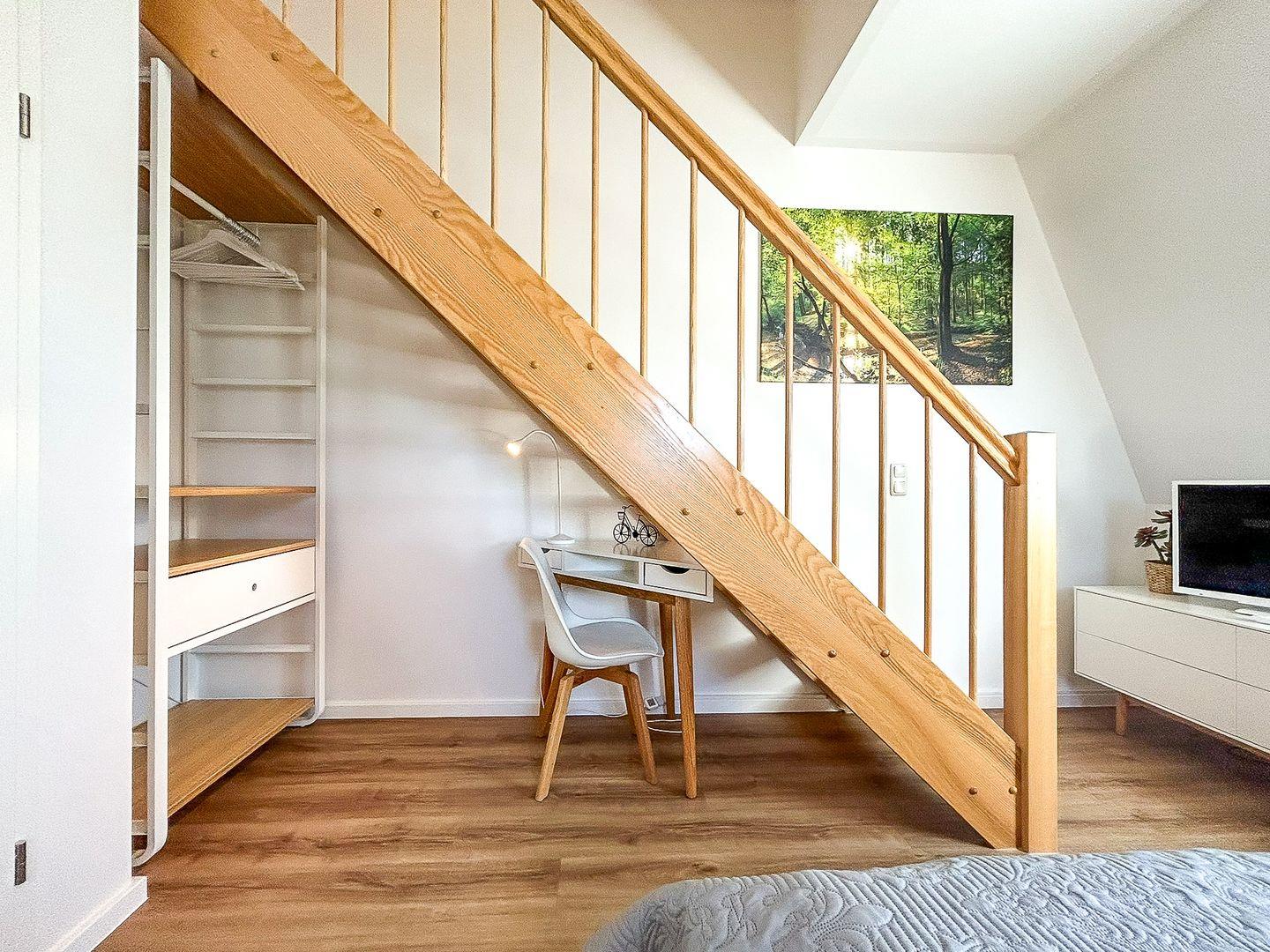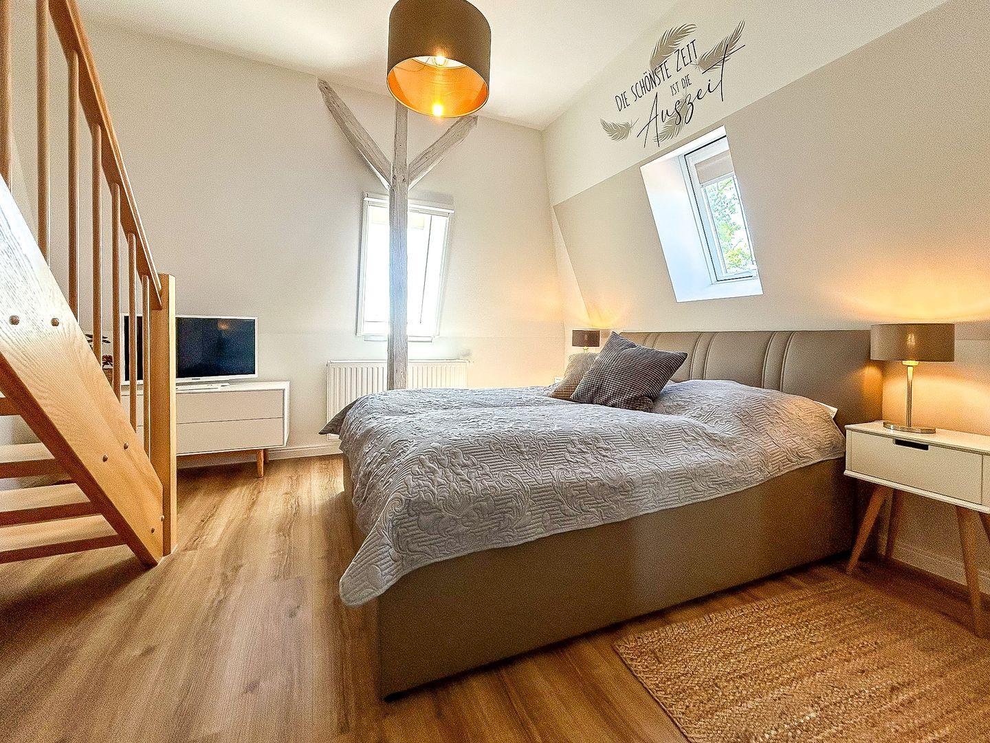 Über eine große Holztreppe gelangst du in den Flur des 1. Obergeschosses. Von hier aus kannst du das zweite Badezimmer mit bodengleicher Dusche oder das gemütliche Schlafzimmer (Doppelbett 160 x 200 cm) betreten. Hier steht dir ebenfalls ein TV zur Verfügung. Außerdem ist das Zimmer mit einem kleinen Schreibtisch versehen. In einem Kleiderschrank und einem offenen Regal hast du Gelegenheit, deine Urlaubsgarderobe zu verstauen.