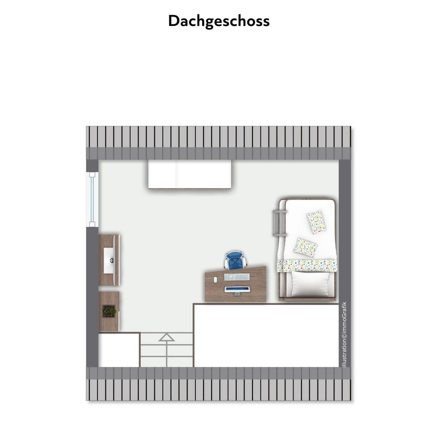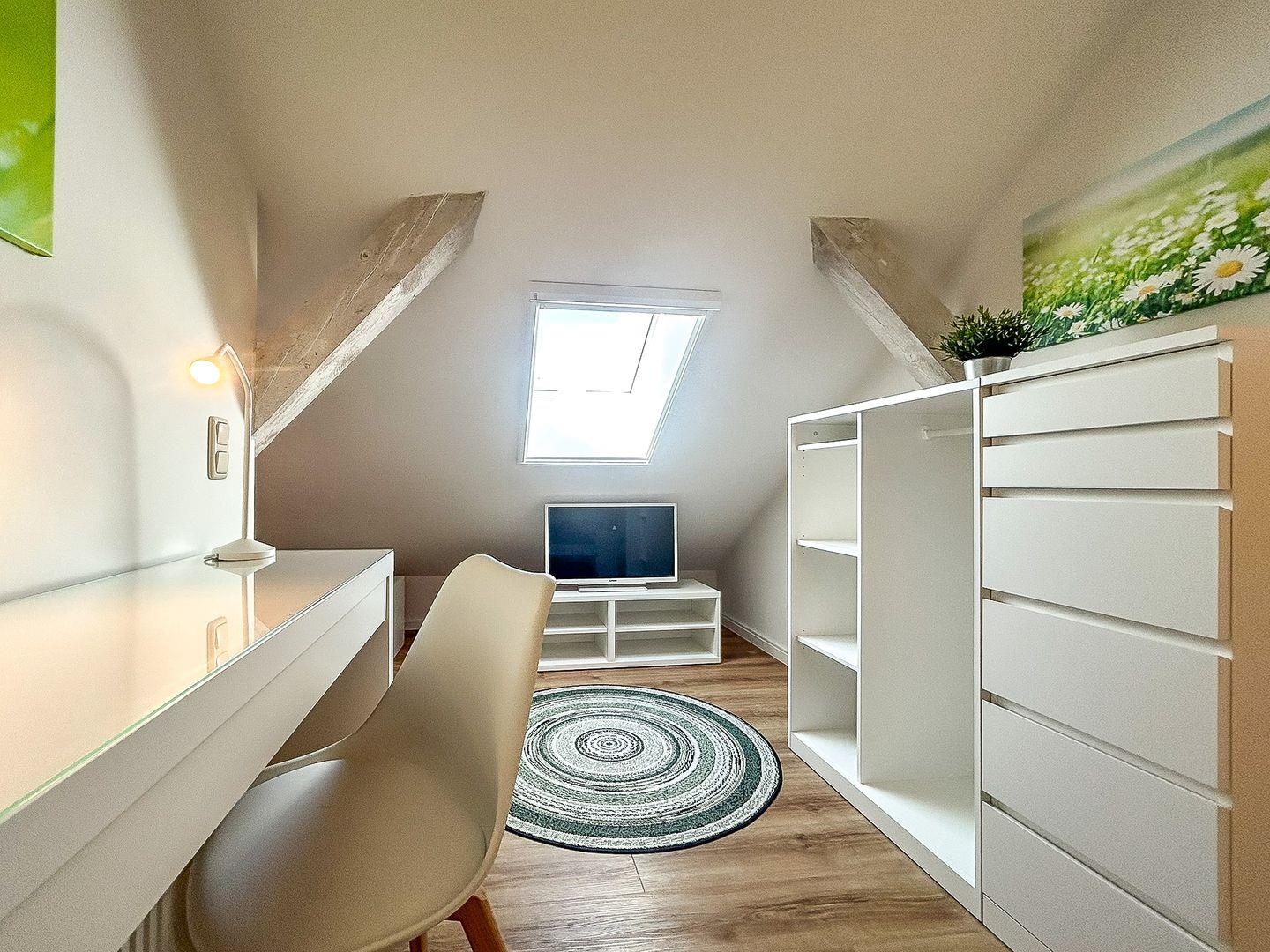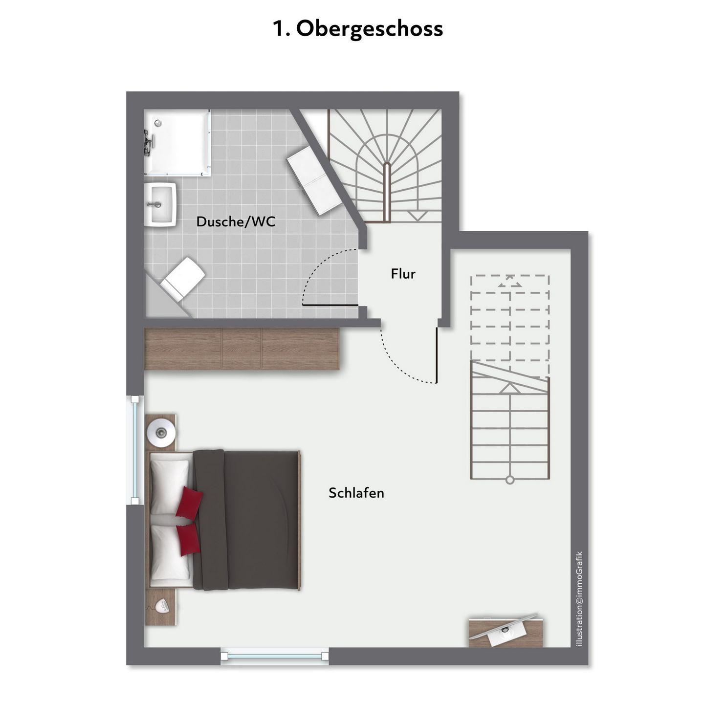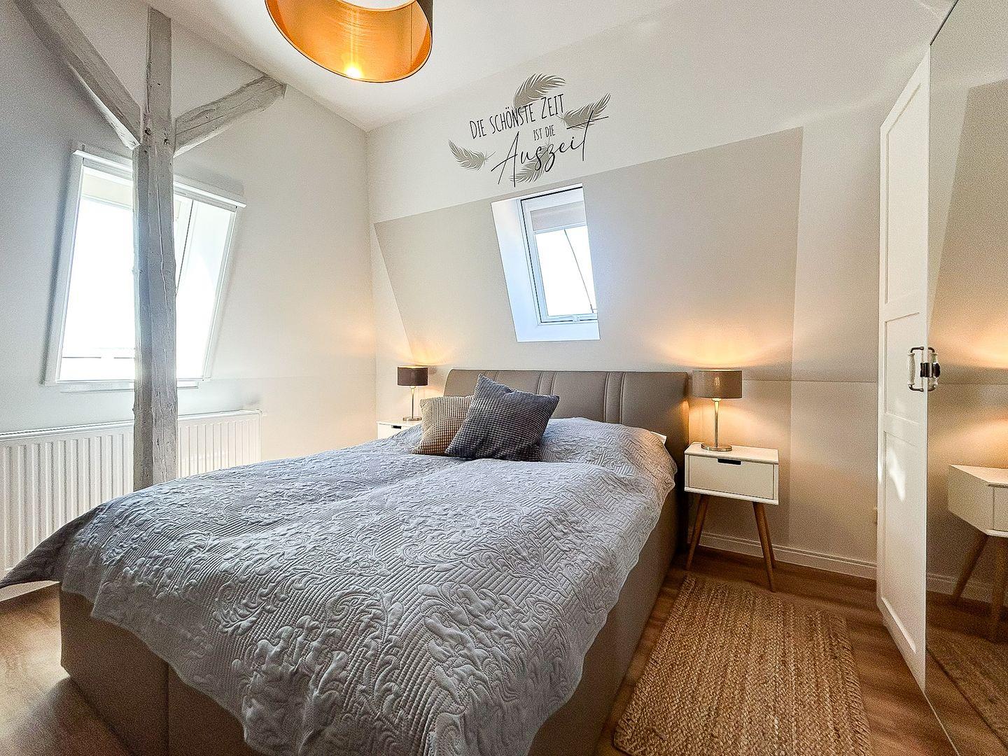 Über eine große Holztreppe gelangst du in den Flur des 1. Obergeschosses. Von hier aus kannst du das zweite Badezimmer mit bodengleicher Dusche oder das gemütliche Schlafzimmer (Doppelbett 160 x 200 cm) betreten. Hier steht dir ebenfalls ein TV zur Verfügung. Außerdem ist das Zimmer mit einem kleinen Schreibtisch versehen. In einem Kleiderschrank und einem offenen Regal hast du Gelegenheit, deine Urlaubsgarderobe zu verstauen.