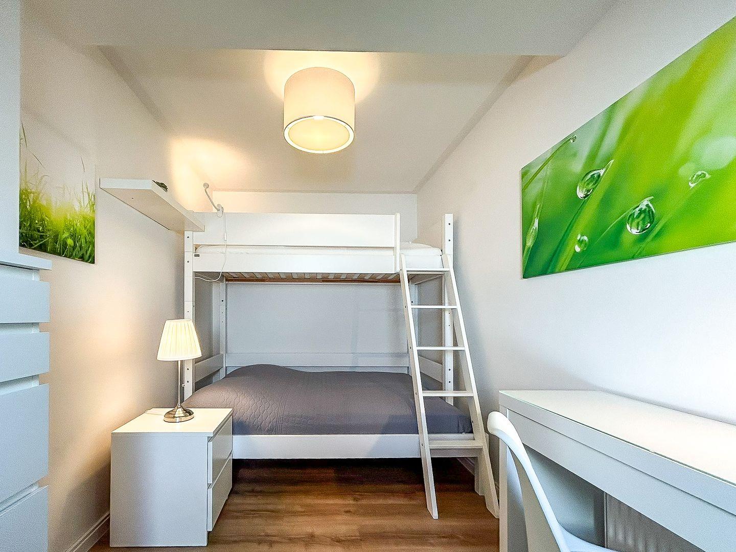 Im 2. Obergeschoss befindet sich das weitere liebevoll eingerichtete Schlafzimmer mit einem Doppelstockbett. Die untere Liegefläche ist 140 x 200 cm breit, das obere Bett ist 90 x 200 cm breit. Selbstverständlich ist auch hier für etwas Kurzweil ein TV zu finden.