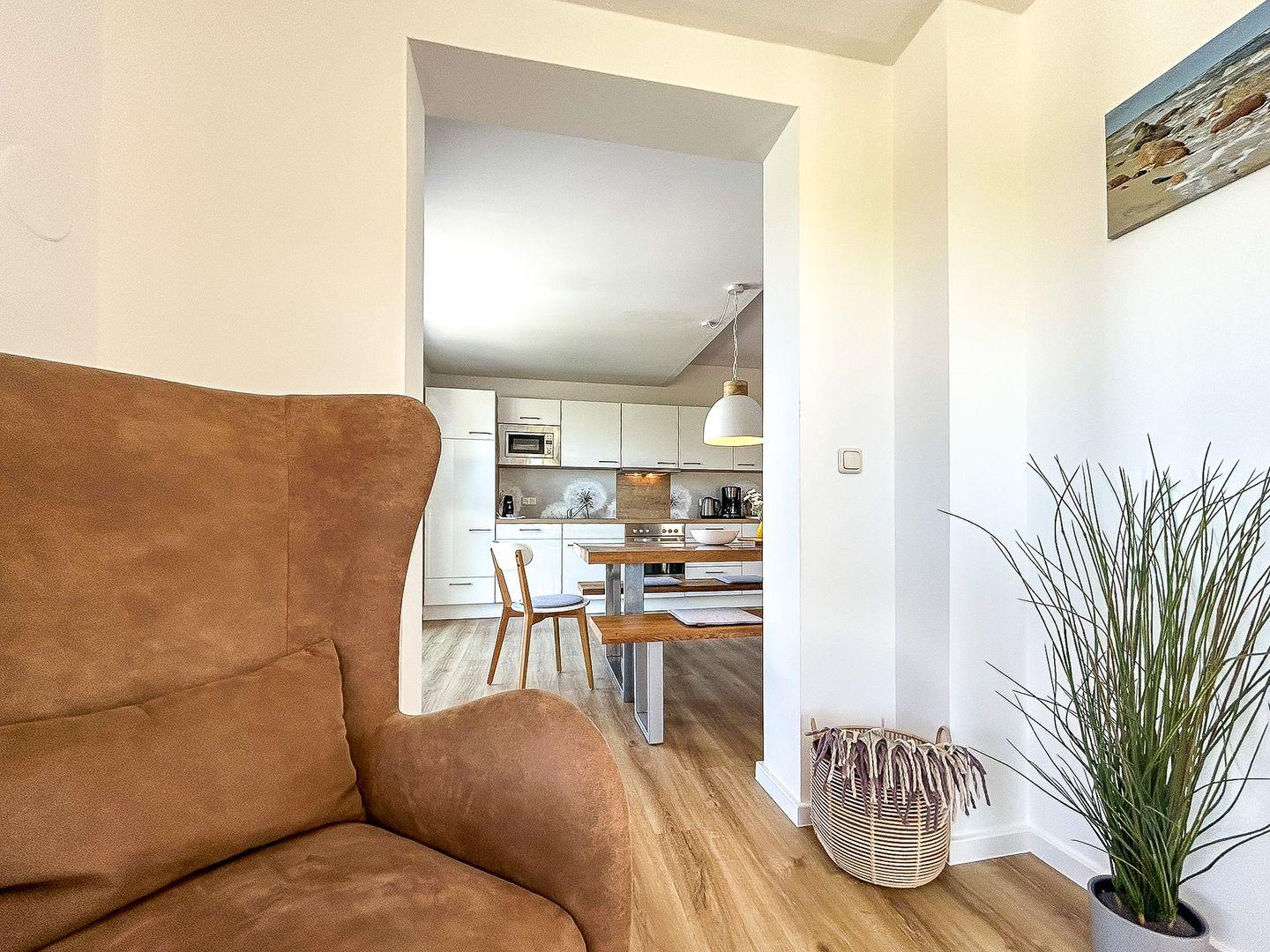 Über eine Außentreppe gelangst du direkt in den stilvollen und gemütlichen Wohnbereich, der unter anderem mit einem großen 55-Zoll großem TV ausgestattet ist. Vom Wohnraum aus gelangst du in die offen und modern gestaltete Küche, die keine Wünsche offenlässt. Sie beinhaltet neben einem Kühlschrank mit Tiefkühlkombination, einem 4-Platten-Cerankochfeld mit Backofen, Spülmaschine und Mikrowelle selbstverständlich auch alle nötigen Küchenutensilien wie Toaster, Wasserkocher etc. Der Esstisch bietet ausreichend Platz für ausgedehnte Mahlzeiten mit der ganzen Familie.