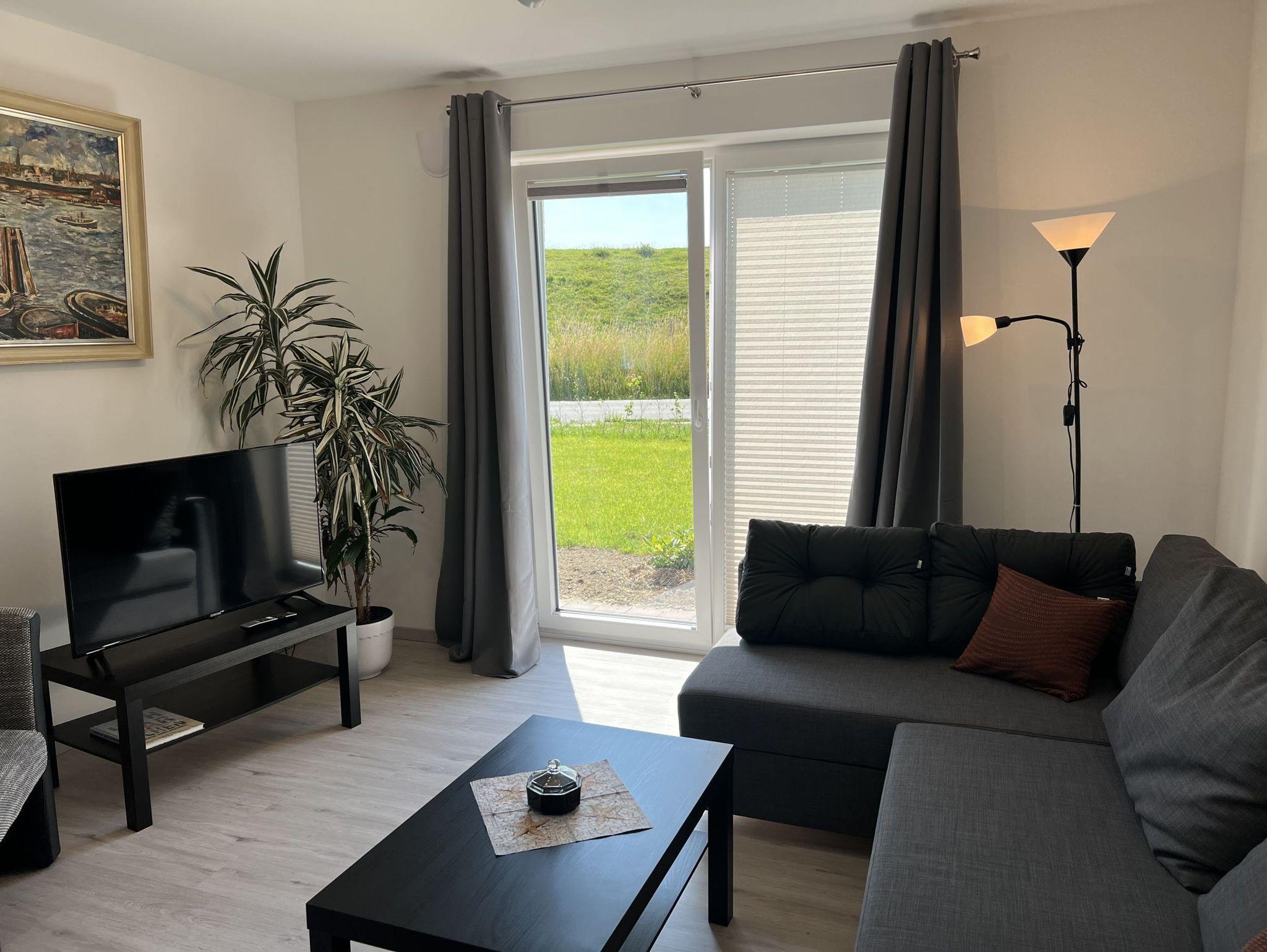 Zu der Ferienwohnung Ebbe im Erdgeschoss gehört eine Terrasse und ein Garten mit Strandkorb.