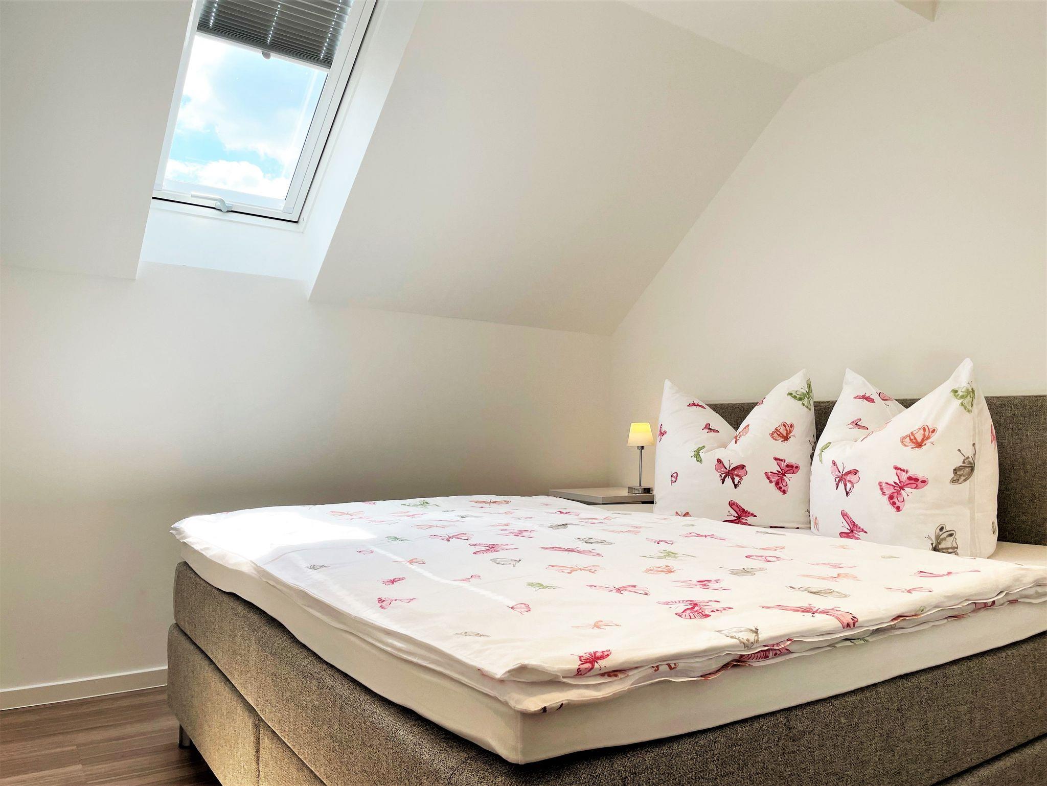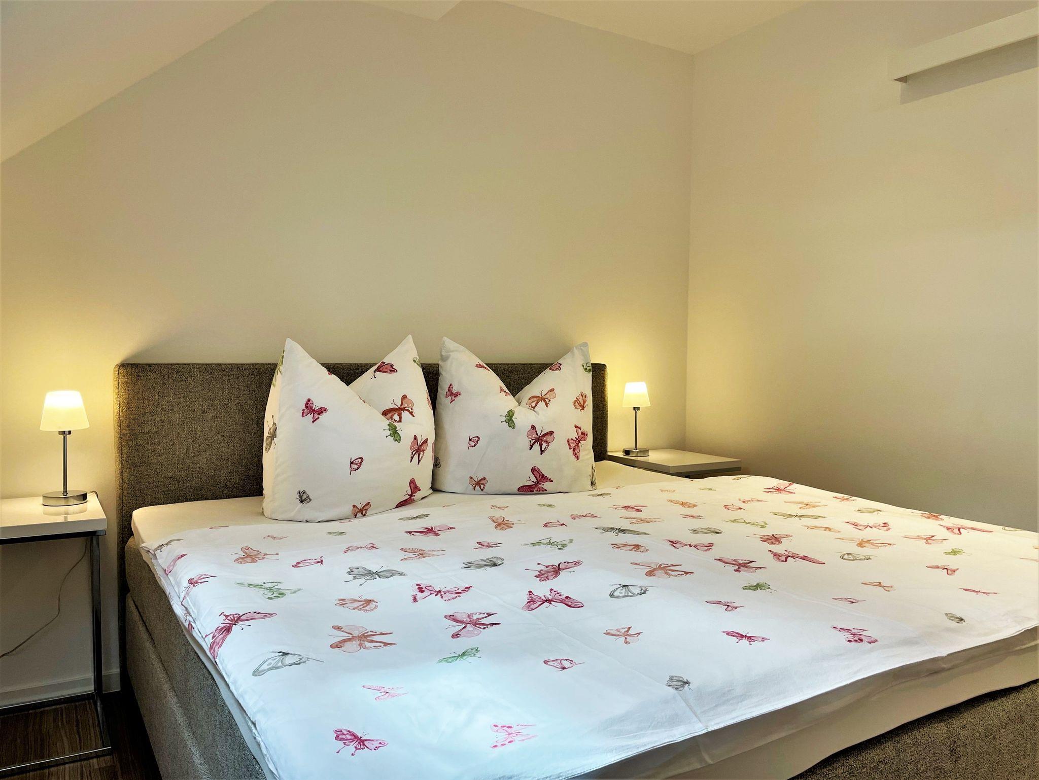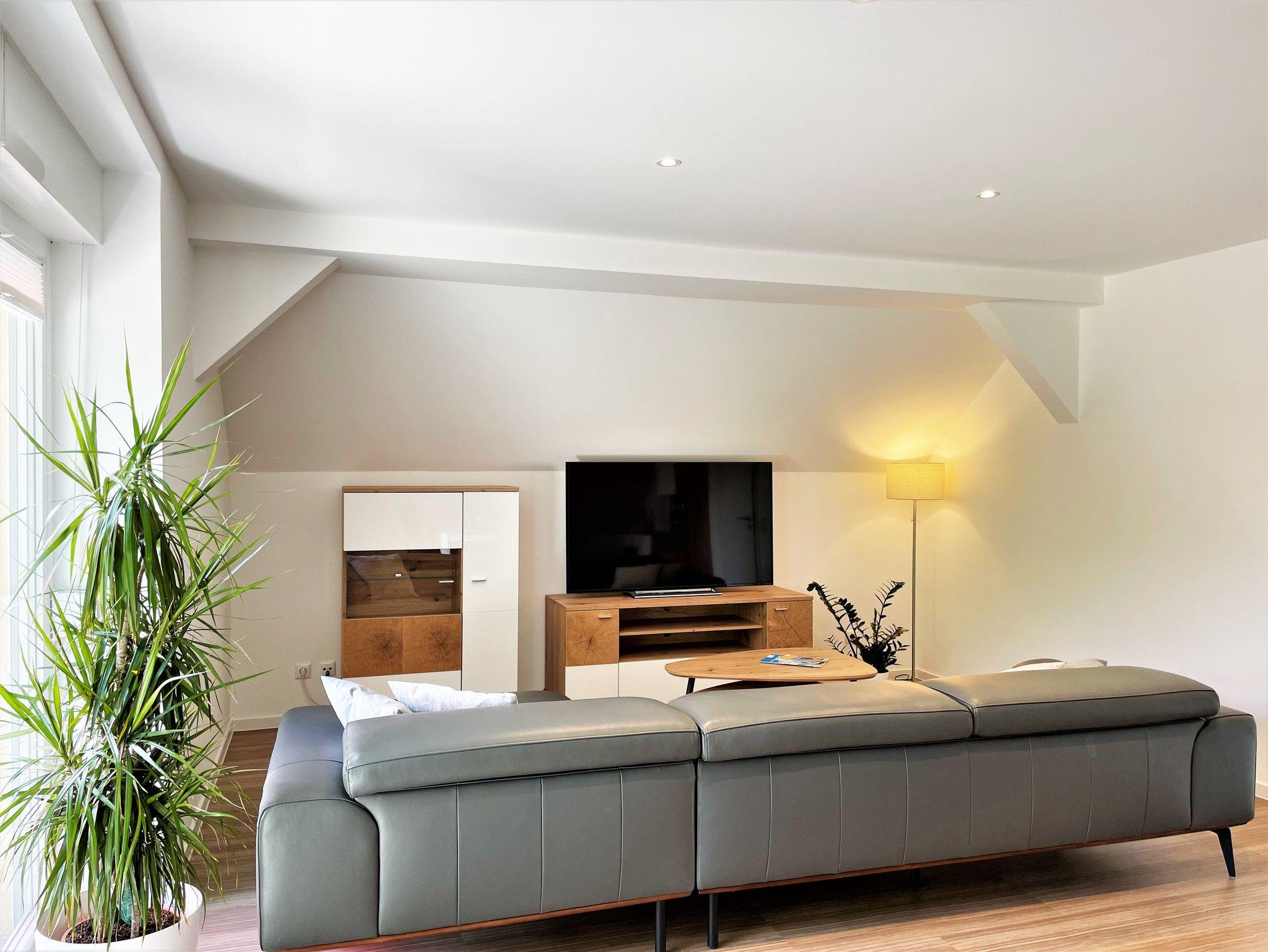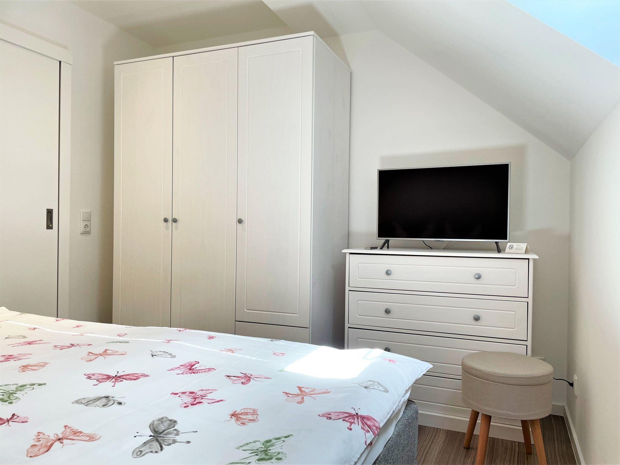 Die 86 m² große Nichtraucherferienwohnung hat 3 Zimmer, befindet sich in der oberen Etage und eignet sich ideal für 4 Personen. Alle Zimmer sind farblich, hell und harmonisch aufeinander abgestimmt. Das Wohnzimmer ist mit einer modernen Schrankwand, großem TV-Flachbildschirm und einem bequemen Ecksofa eingerichtet. Weiterhin befindet sich ein Esstisch im Wohnzimmer, an dem 4 Personen speisen können. Ein Schlafzimmer verfügt über 2 getrennt stehende Schlafmöglichkeiten und einer Kommode. Im 2 Schlafzimmer steht Gästen ein Boxspringbett zu Verfügung sowie ein großer Kleiderschrank, Kommode und ein TV-Flachbildschirm.