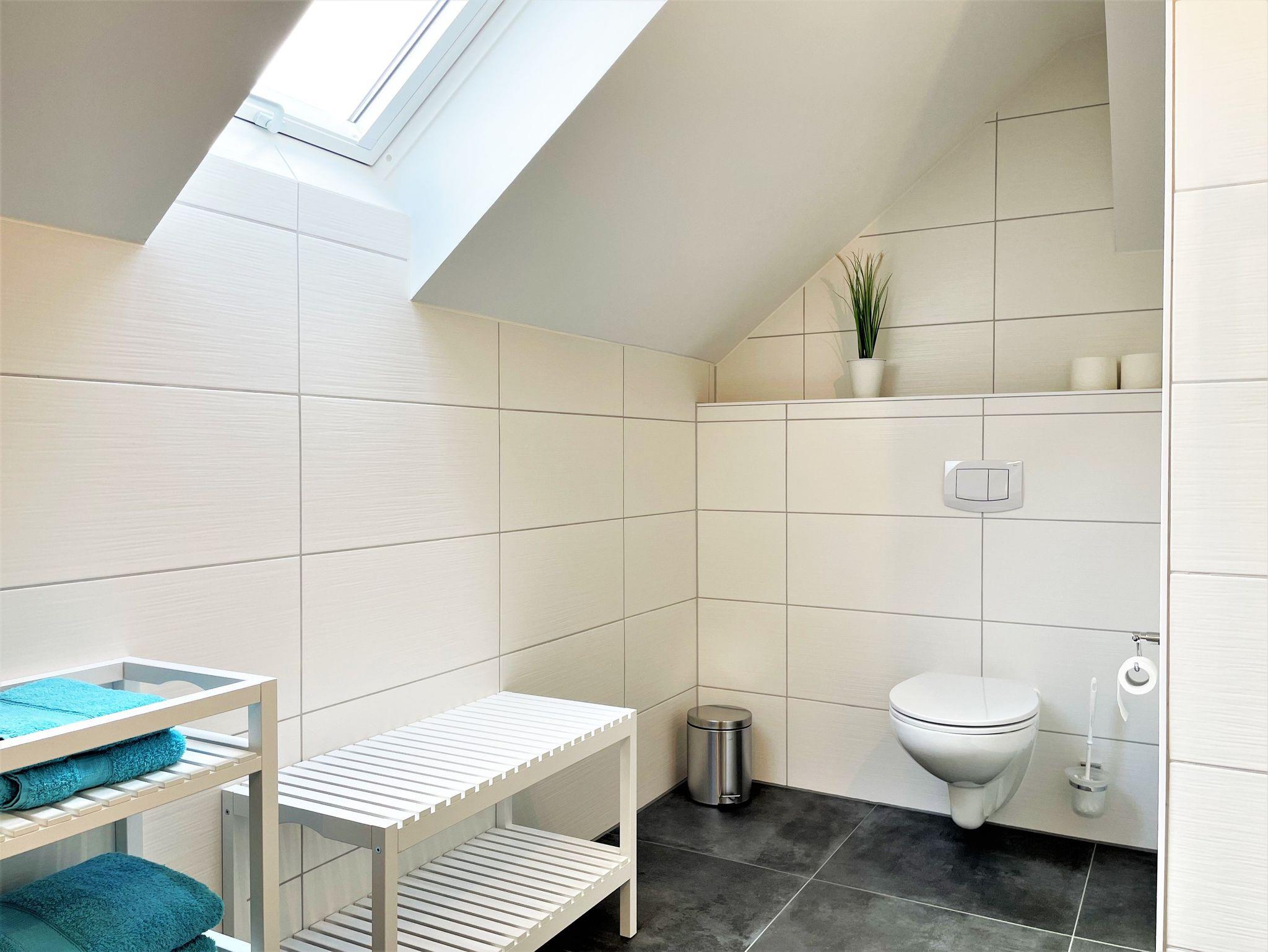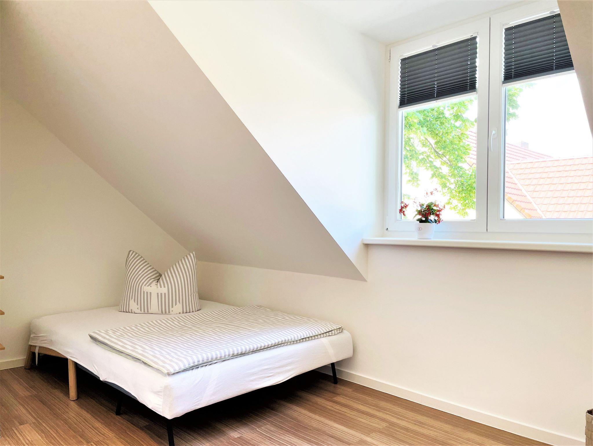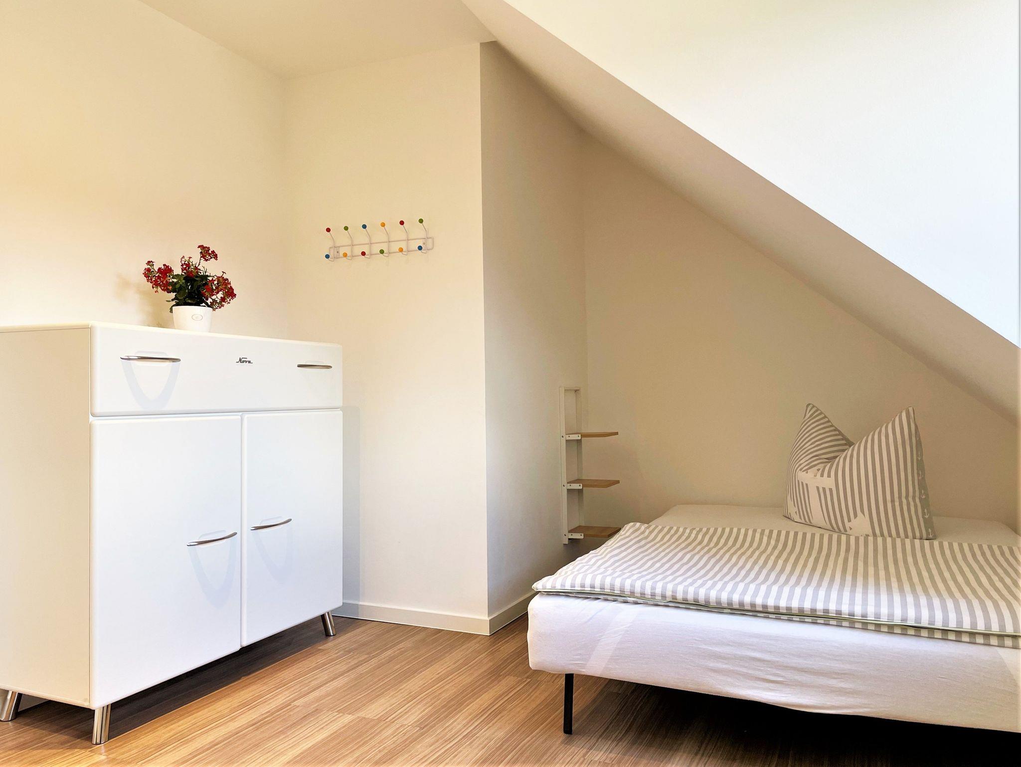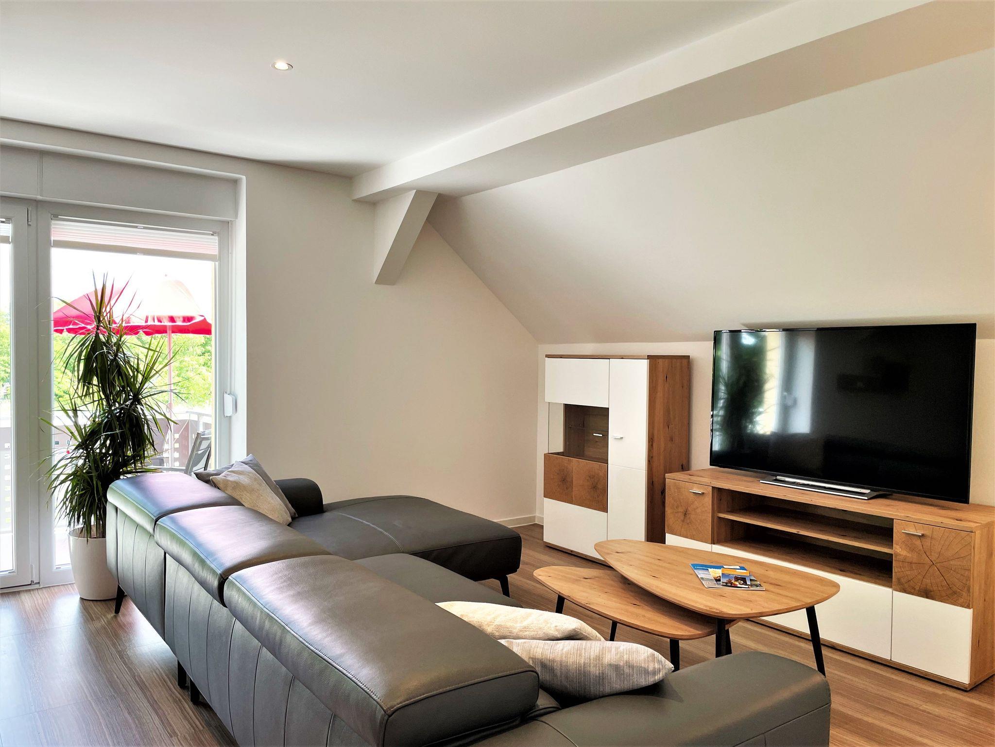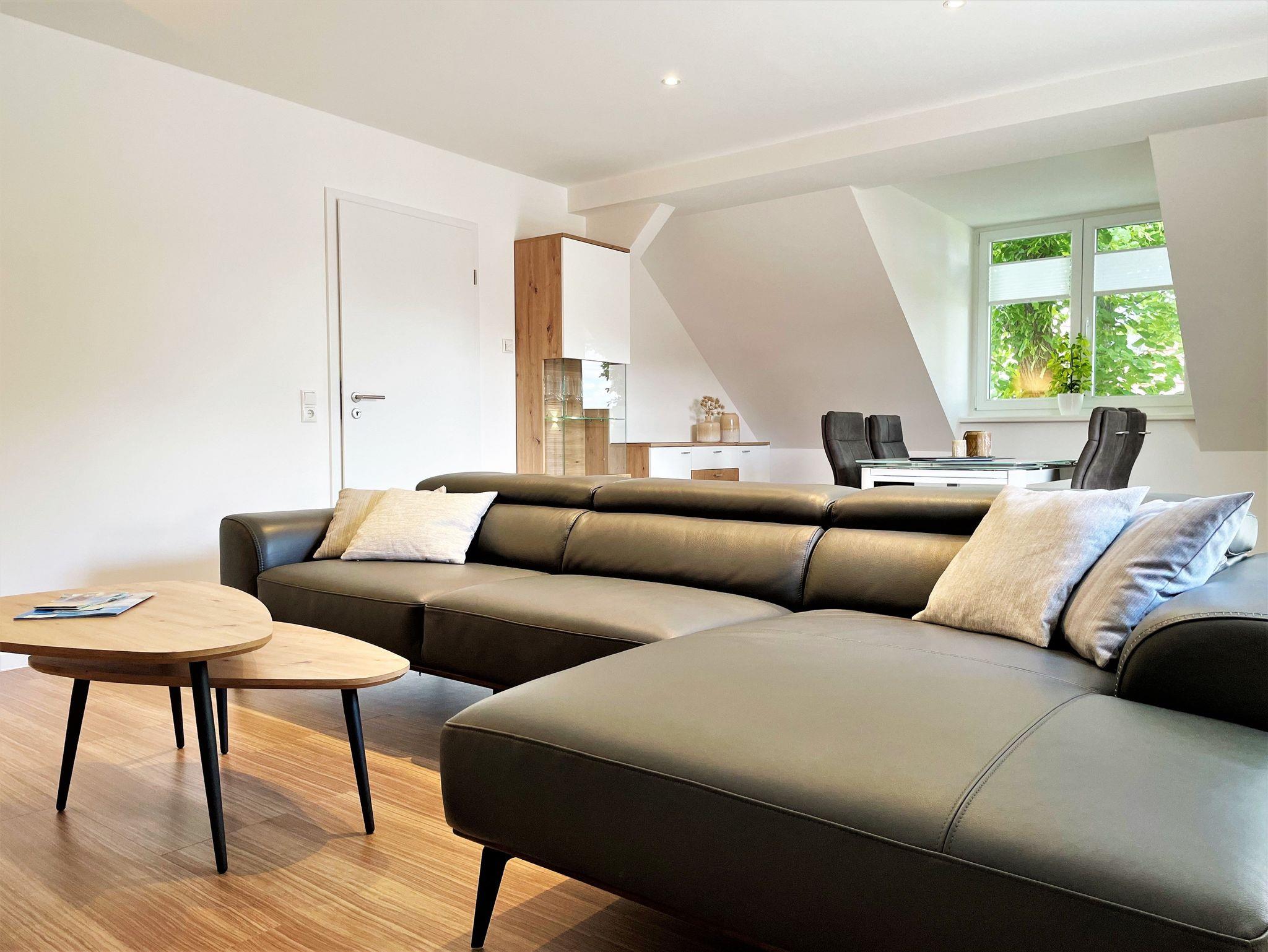 Die 86 m² große Nichtraucherferienwohnung hat 3 Zimmer, befindet sich in der oberen Etage und eignet sich ideal für 4 Personen. Alle Zimmer sind farblich, hell und harmonisch aufeinander abgestimmt. Das Wohnzimmer ist mit einer modernen Schrankwand, großem TV-Flachbildschirm und einem bequemen Ecksofa eingerichtet. Weiterhin befindet sich ein Esstisch im Wohnzimmer, an dem 4 Personen speisen können. Ein Schlafzimmer verfügt über 2 getrennt stehende Schlafmöglichkeiten und einer Kommode. Im 2 Schlafzimmer steht Gästen ein Boxspringbett zu Verfügung sowie ein großer Kleiderschrank, Kommode und ein TV-Flachbildschirm.