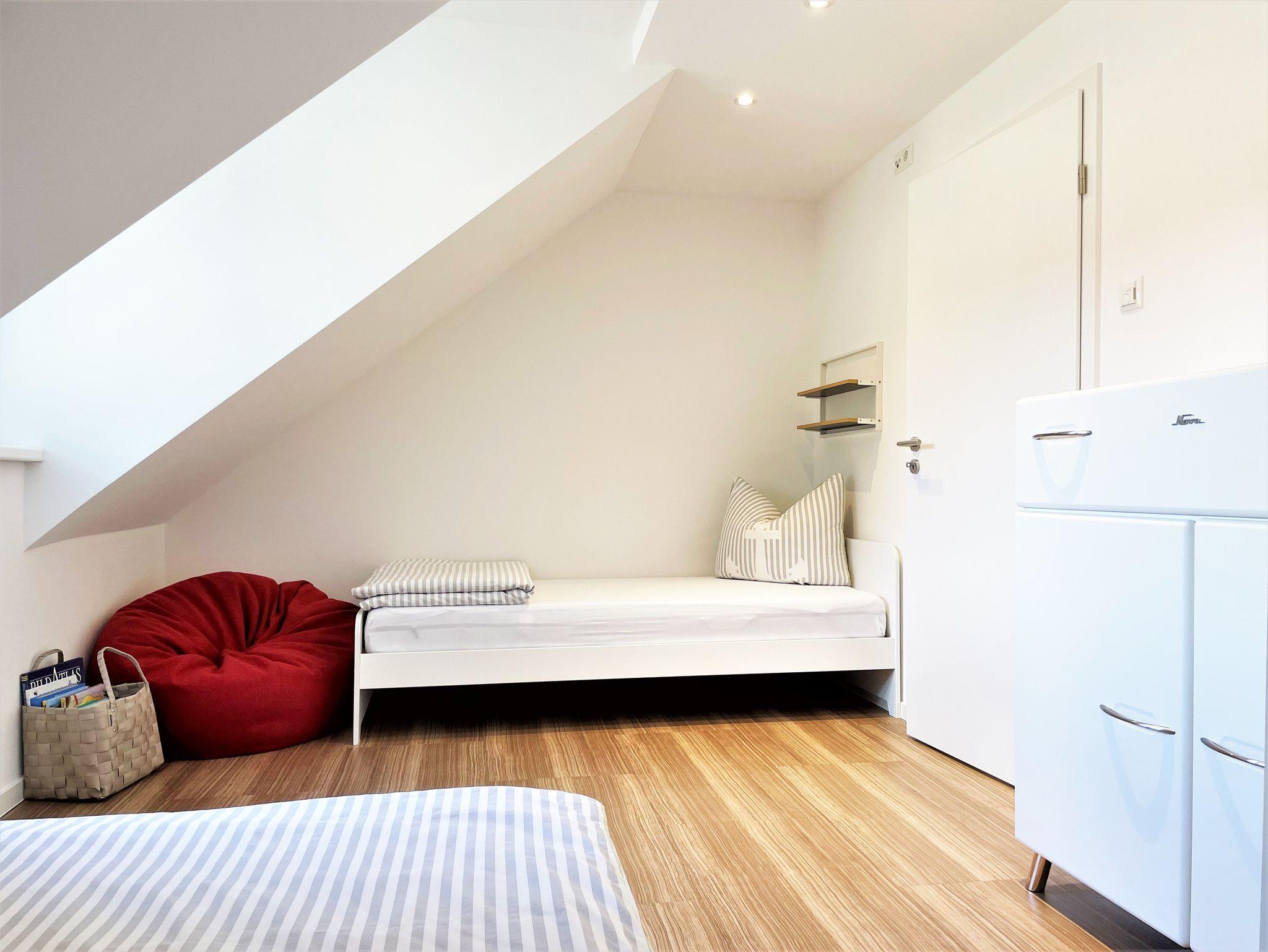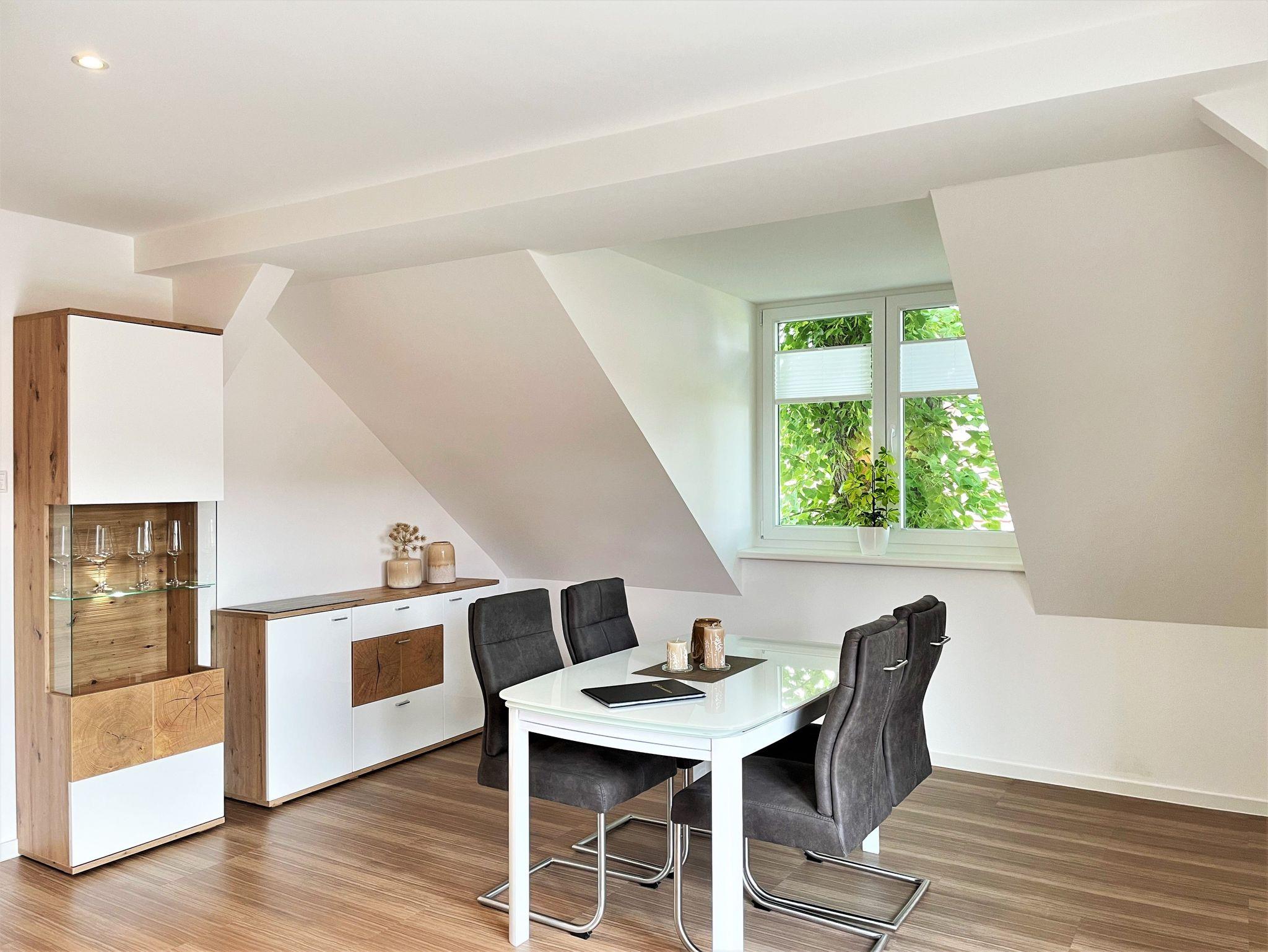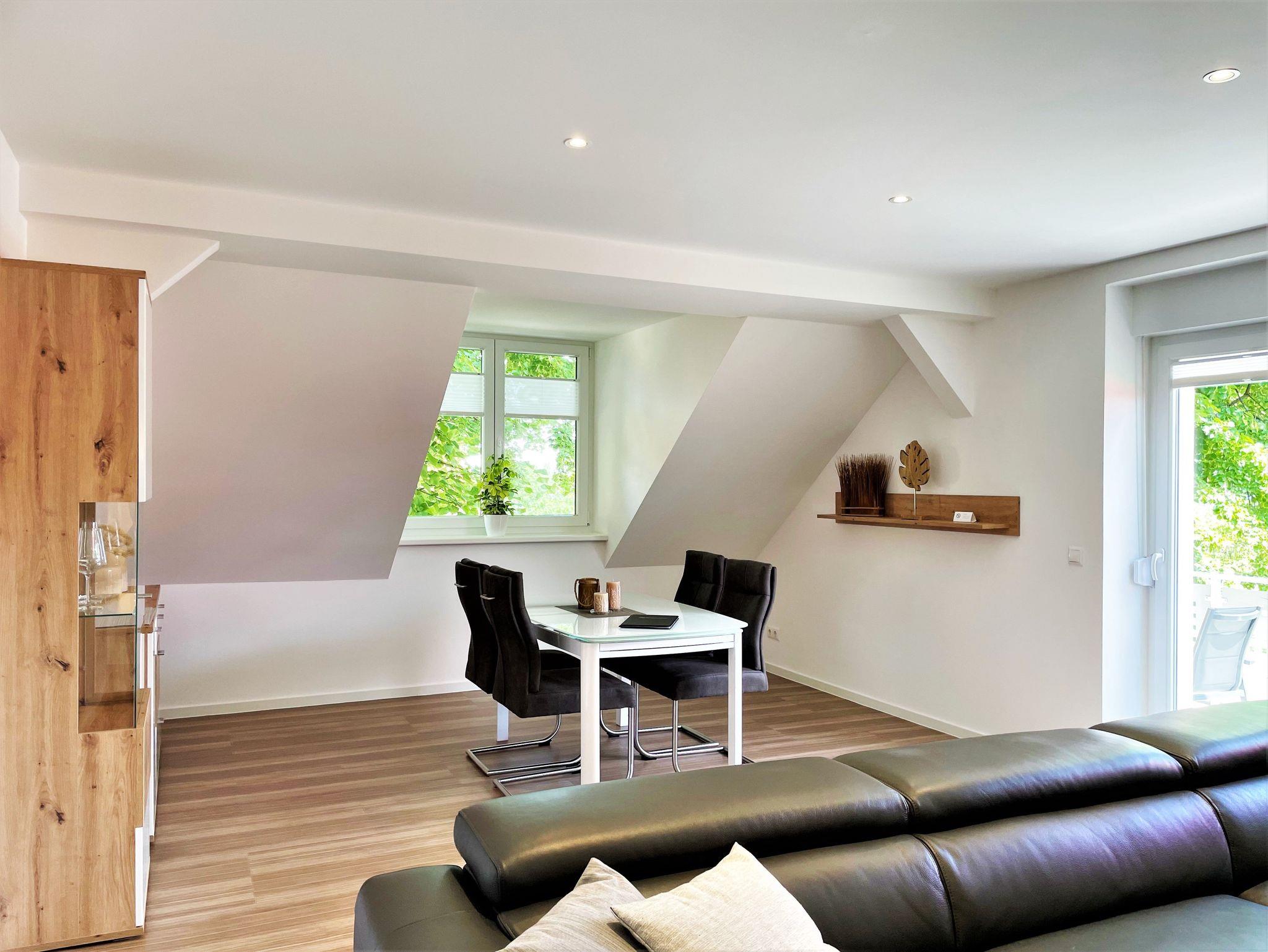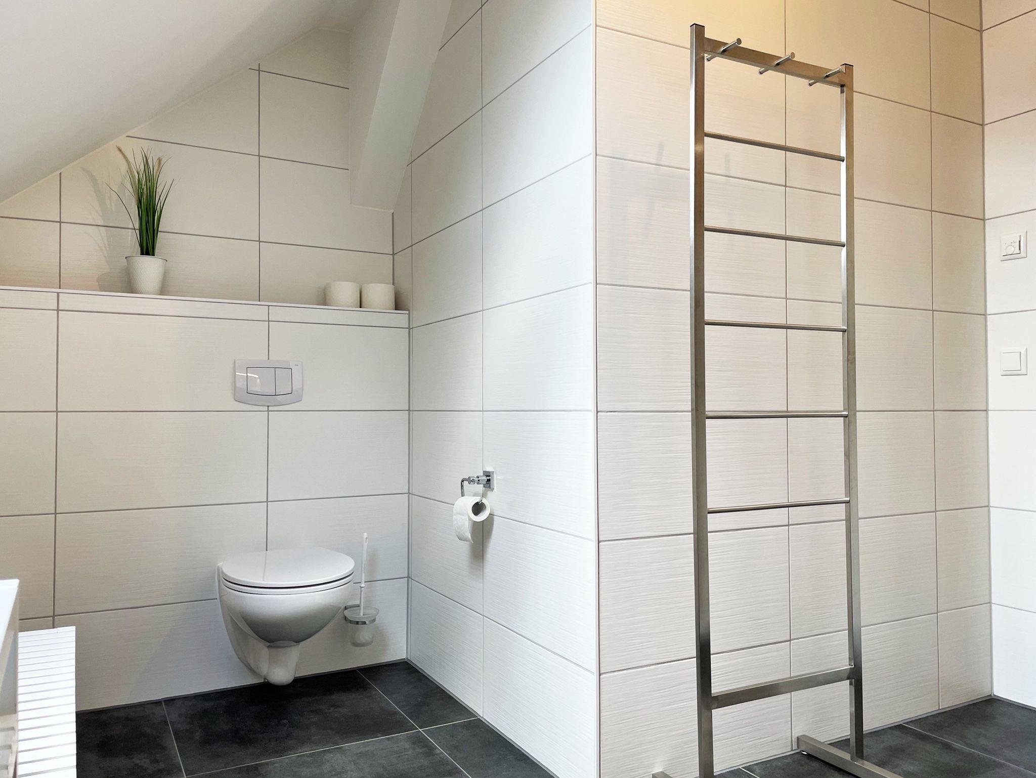 Die 86 m² große Nichtraucherferienwohnung hat 3 Zimmer, befindet sich in der oberen Etage und eignet sich ideal für 4 Personen. Alle Zimmer sind farblich, hell und harmonisch aufeinander abgestimmt. Das Wohnzimmer ist mit einer modernen Schrankwand, großem TV-Flachbildschirm und einem bequemen Ecksofa eingerichtet. Weiterhin befindet sich ein Esstisch im Wohnzimmer, an dem 4 Personen speisen können. Ein Schlafzimmer verfügt über 2 getrennt stehende Schlafmöglichkeiten und einer Kommode. Im 2 Schlafzimmer steht Gästen ein Boxspringbett zu Verfügung sowie ein großer Kleiderschrank, Kommode und ein TV-Flachbildschirm.