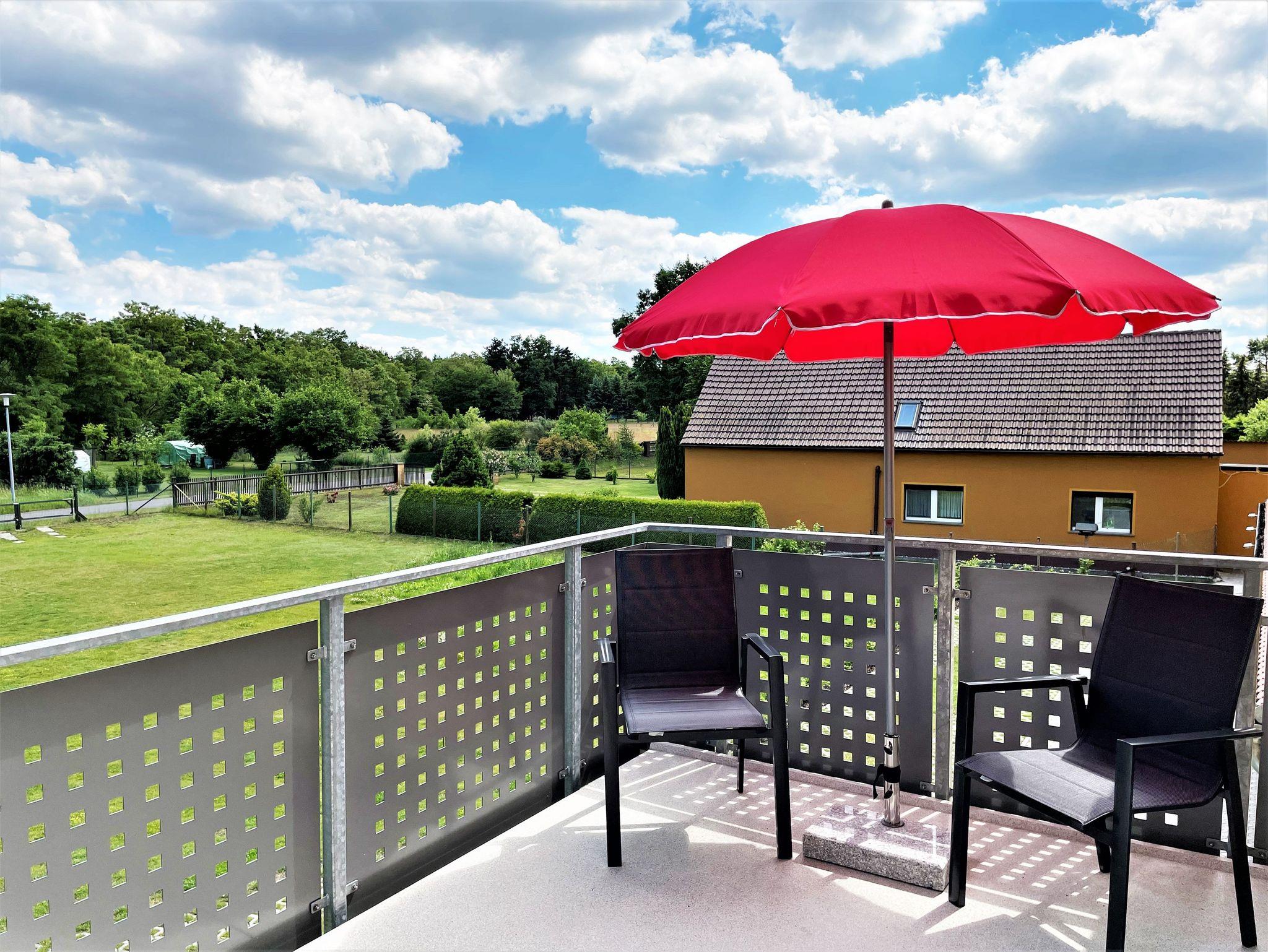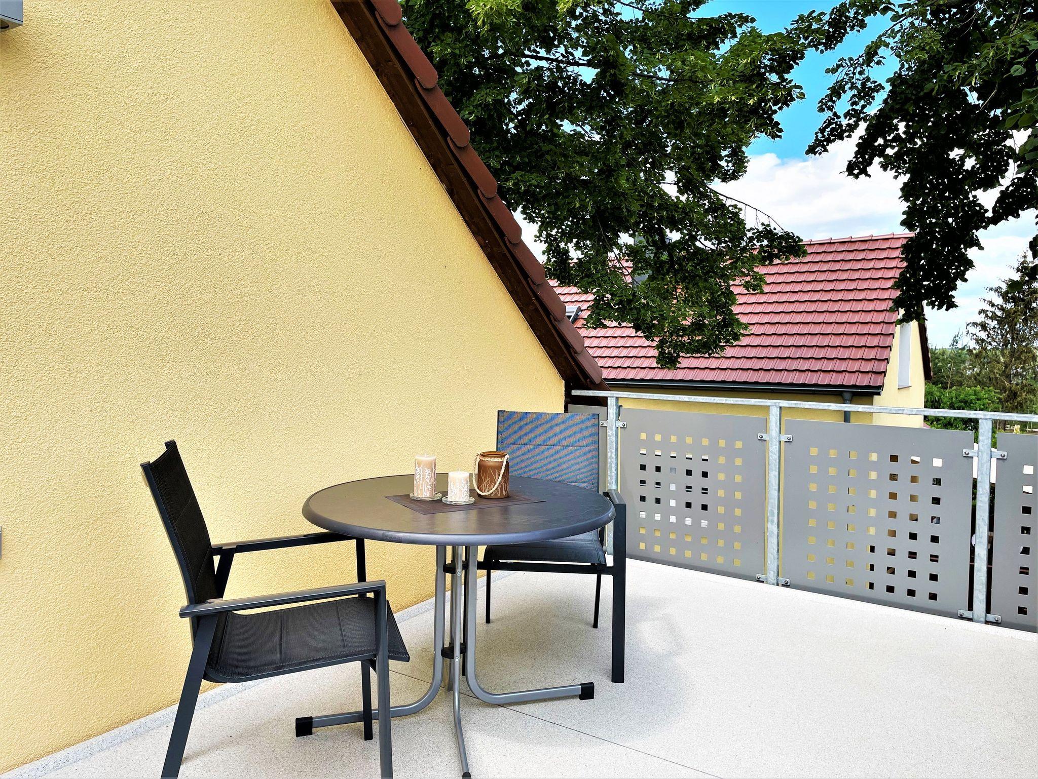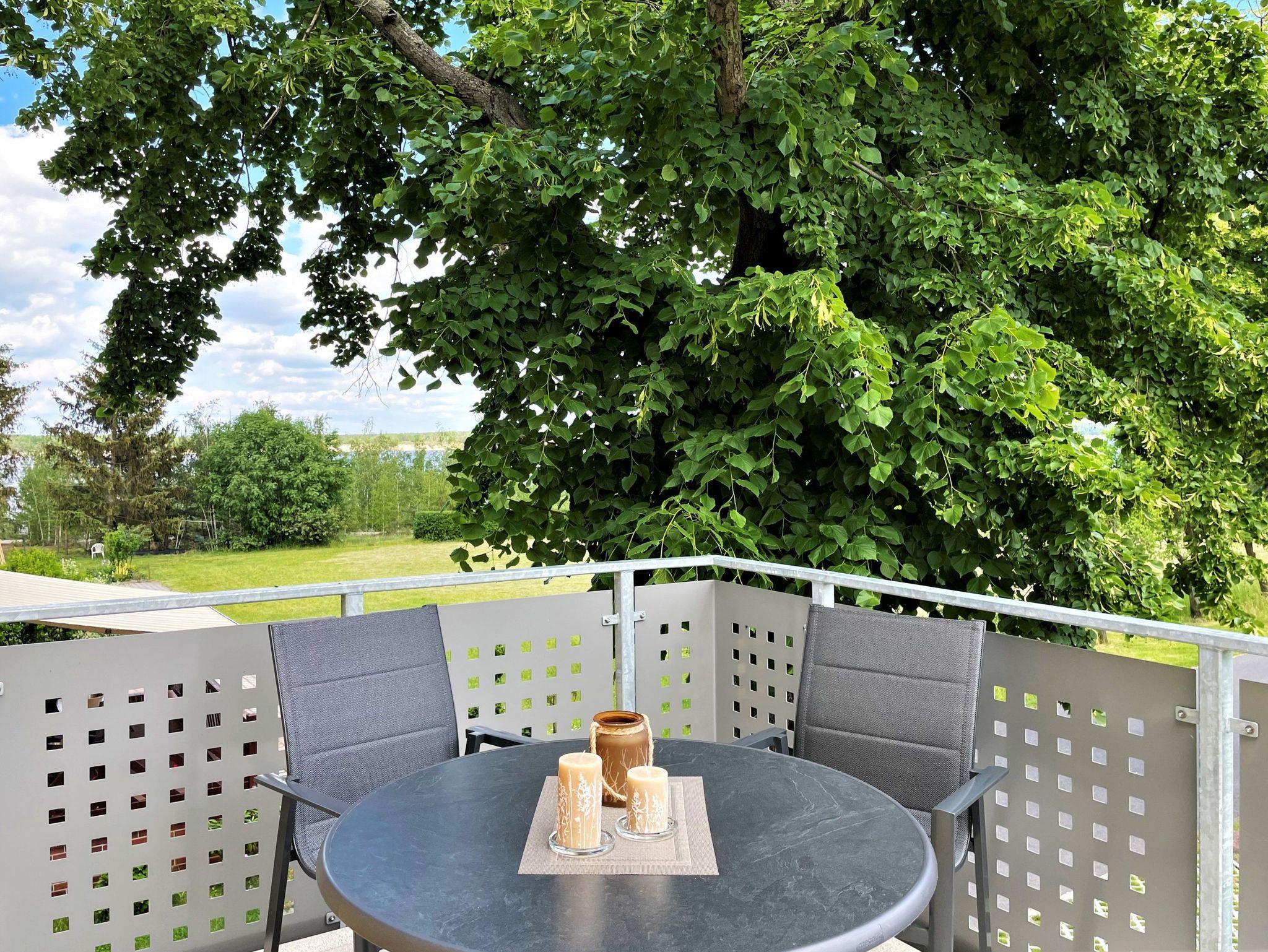Gäste genießen vom möblierten Balkon aus, einen schönen Blick auf die Blunoer Südsee und lassen gern einen erlebnisreichen Tag ausklingen.