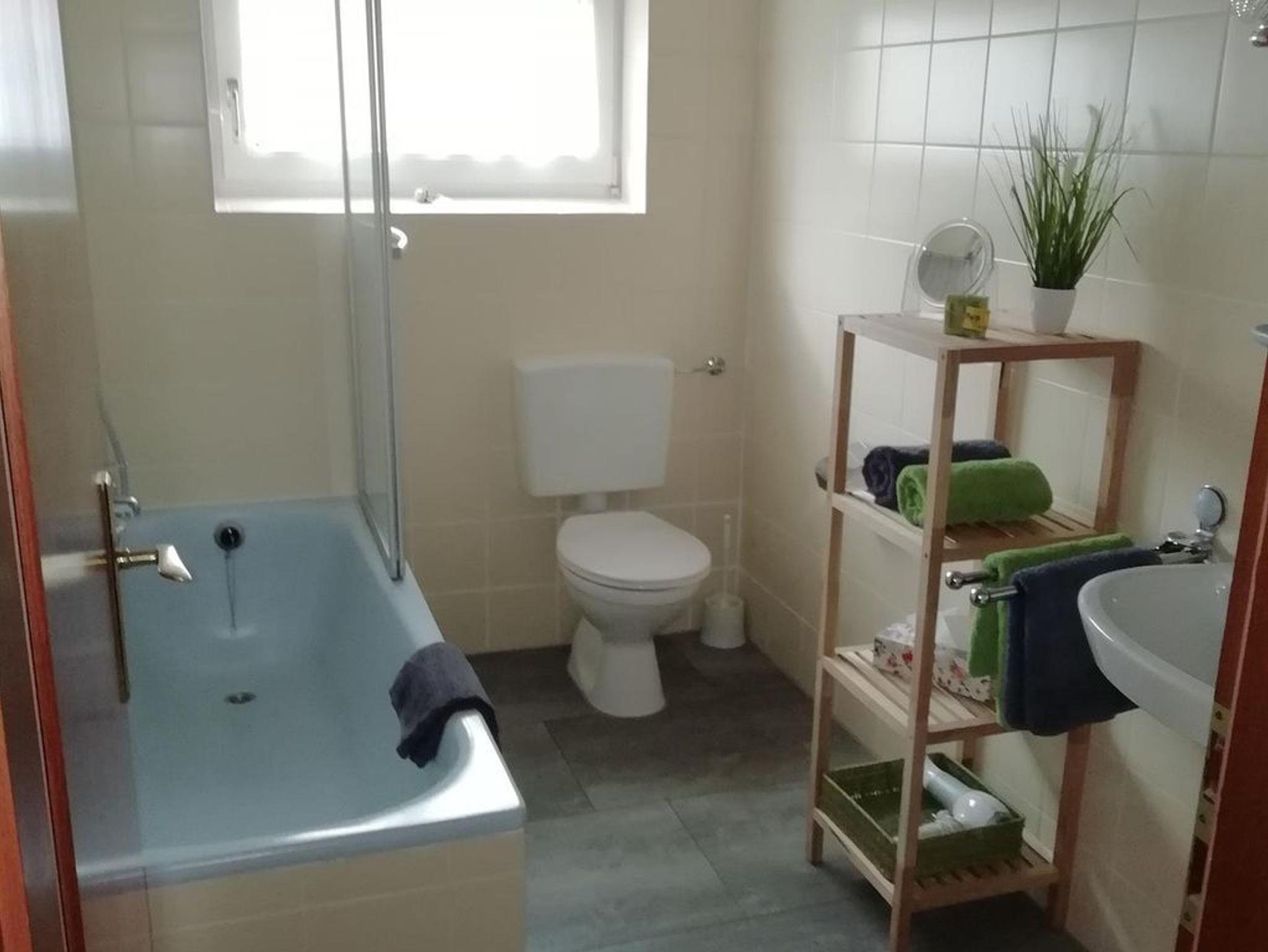 Das 100 qm große Ferienhaus bietet ein großzügiges, helles Wohn-Schlafzimmer mit Schlafcouch mit LCD-TV und DVD-Player. Vollausgestatte Küche mit Essplatz. Sonniges Eßzimmer mit herrlichem Blick in den Garten. Das Badezimmer verfügt über eine große Badewanne mit Duschvorrichtung, sowie ein Waschbecken und WC. Im oberen Bereich des Hauses befinden sich zwei gemütlich eingerichtete Schlafzimmer. Ein Zimmer verfügt über ein Doppelbett und ein Zimmer über zwei Einzelbetten. Ein Kinderhochstuhl und ein Babybett stehen Ihnen zur Verfügung. Alle Zimmer haben einen schönen Blick in den Garten. Waschmaschine auf Anfrage vorhanden.