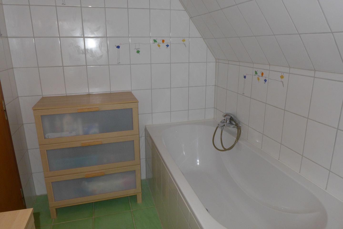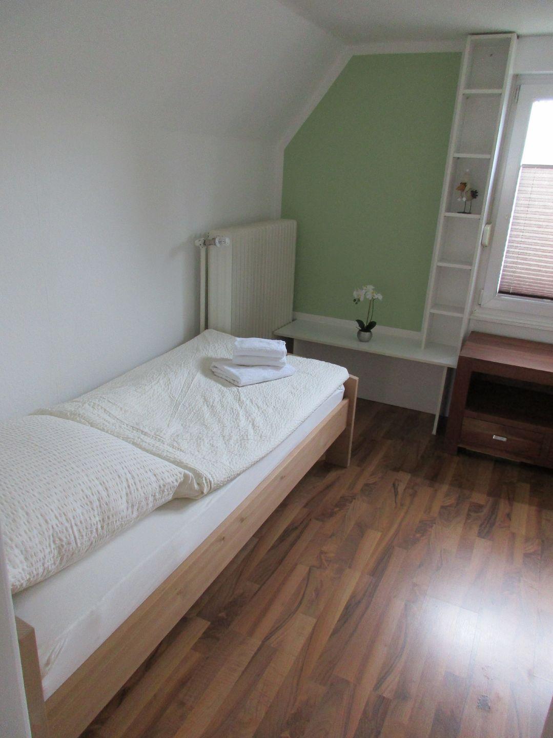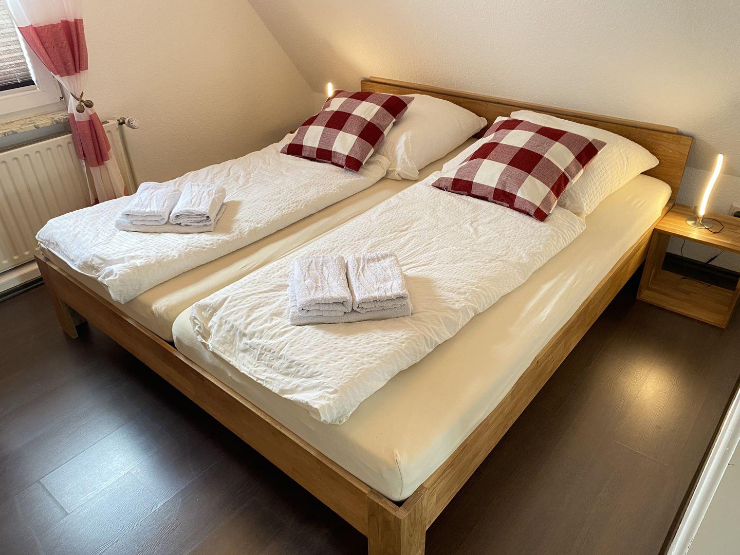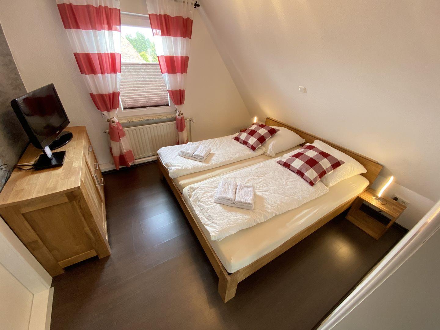 Im Obergeschoß befinden sich zwei Schlafzimmer und ein Flur. Das links Schlafzimmer verfügt über ein Doppelbett (1,40m Liegefläche) sowie einen eigenen Zugang zum Badezimmer mit Badewanne. Das gegenüber liegende Schlafzimmer besitzt zwei Einzel-/Doppelbetten (0,90m u. 1,40m Liegefläche) als Übernachtungsmöglichkeit. Das Ferienhaus ist demnach für bis zu sechs Personen ausgelegt.