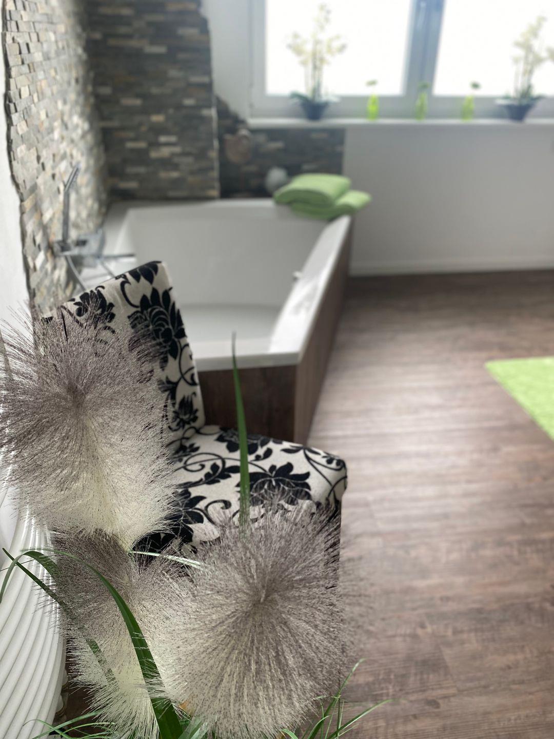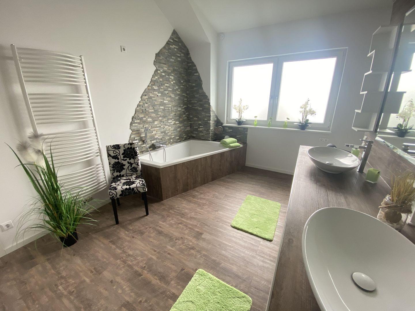 Der "Wohlfühl-Bereich" der Wohnung befindet sich im großzügigen Badezimmer: Ein Doppel-Waschtisch, eine begehbare Dusche sowie eine Badewanne mit Blick auf den Fernseher lassen Sie in den eigenen Wänden entspannen.