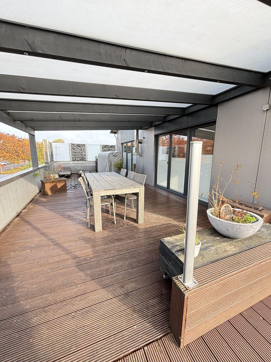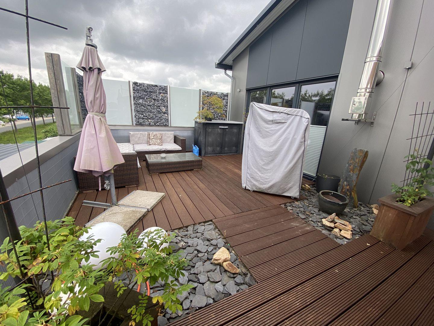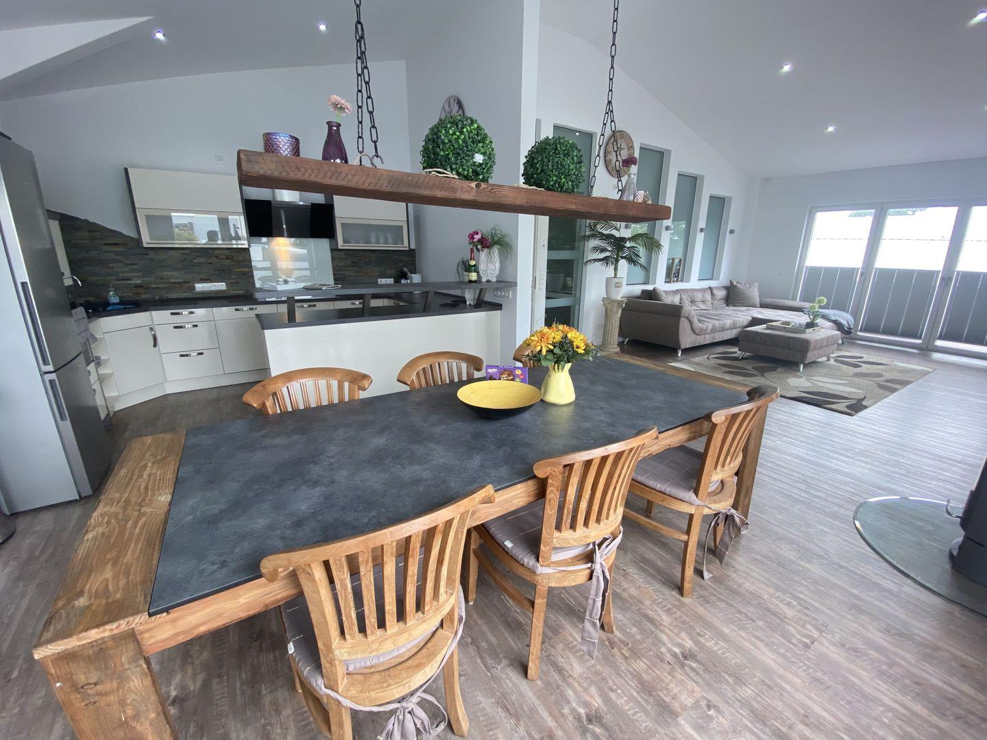 Das Highlight der Wohnung ist der offene Wohn-/Essraum mit hellen Fensterfronten und einer umlaufenden Dachterrasse. Die hohen Decken, der gemütliche Kaminofen und die hochmoderne Einrichtung lassen Ihre Herzen höher schlagen. Die daran angrenzende ca. 110qm große Dachterrasse mit großer Terrassenüberdachung und ihren zahlreichen Sitzgelegenheiten, wie z.B. einem Strandkorb, lädt am Morgen zu einem ausgiebigen Frühstück oder am Abend zu einem Glas Wein ein.