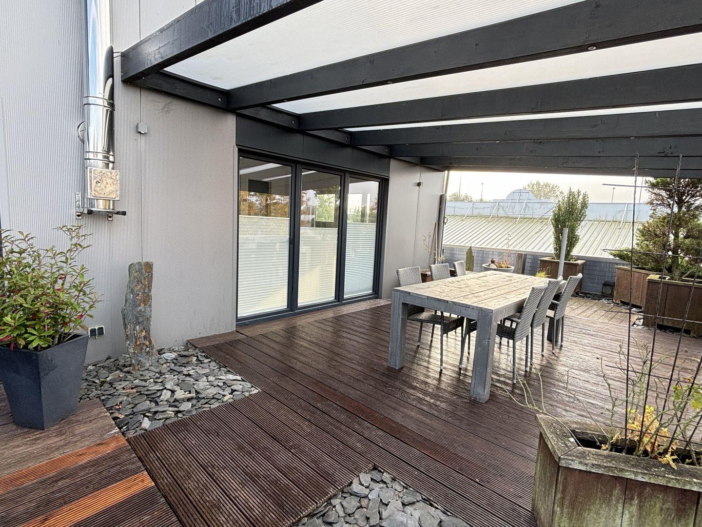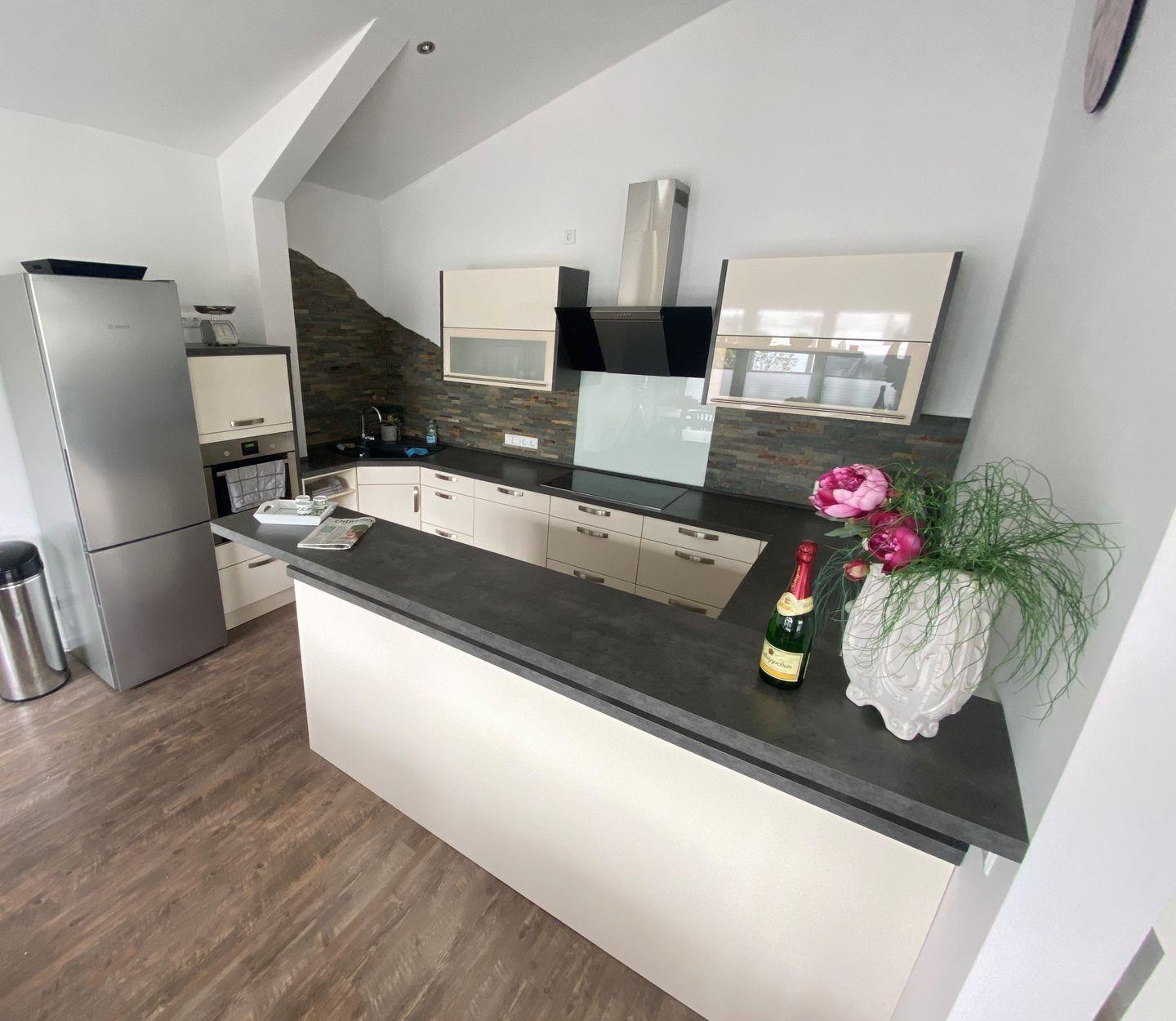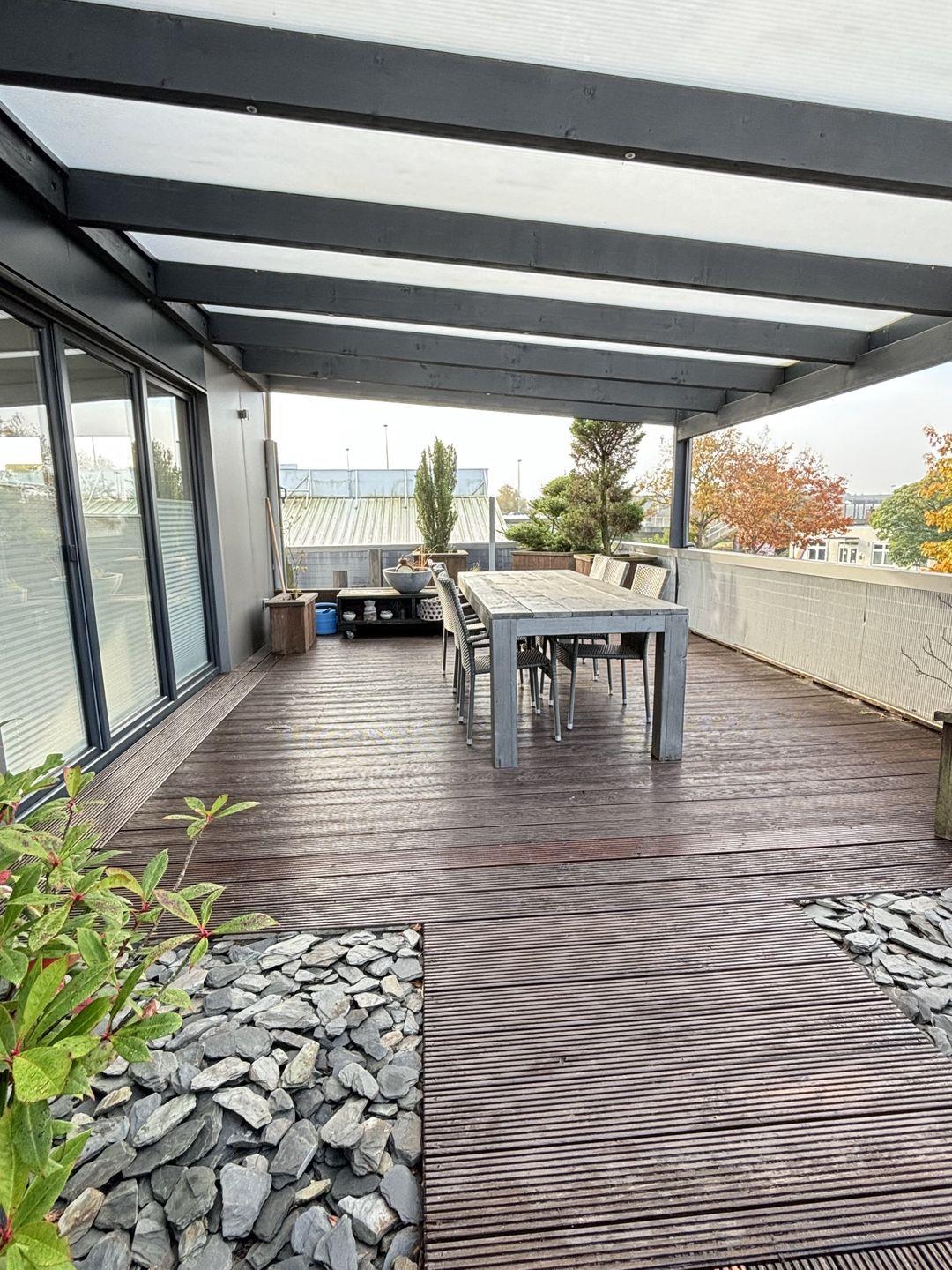 Das Highlight der Wohnung ist der offene Wohn-/Essraum mit hellen Fensterfronten und einer umlaufenden Dachterrasse. Die hohen Decken, der gemütliche Kaminofen und die hochmoderne Einrichtung lassen Ihre Herzen höher schlagen. Die daran angrenzende ca. 110qm große Dachterrasse mit großer Terrassenüberdachung und ihren zahlreichen Sitzgelegenheiten, wie z.B. einem Strandkorb, lädt am Morgen zu einem ausgiebigen Frühstück oder am Abend zu einem Glas Wein ein.