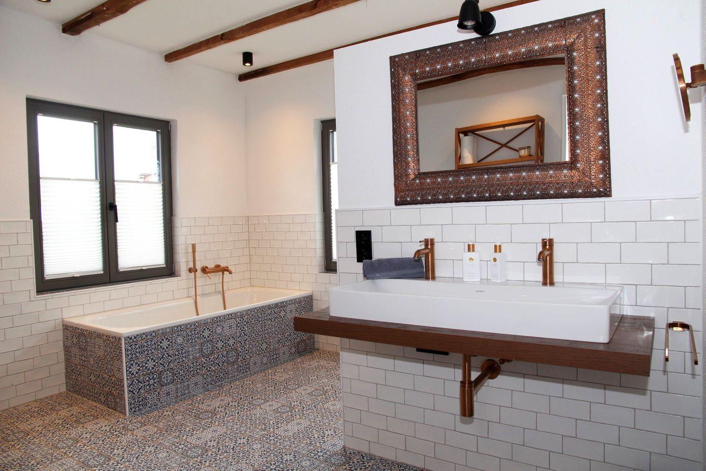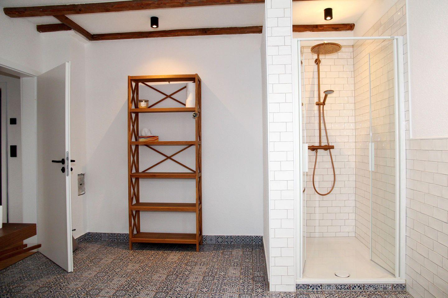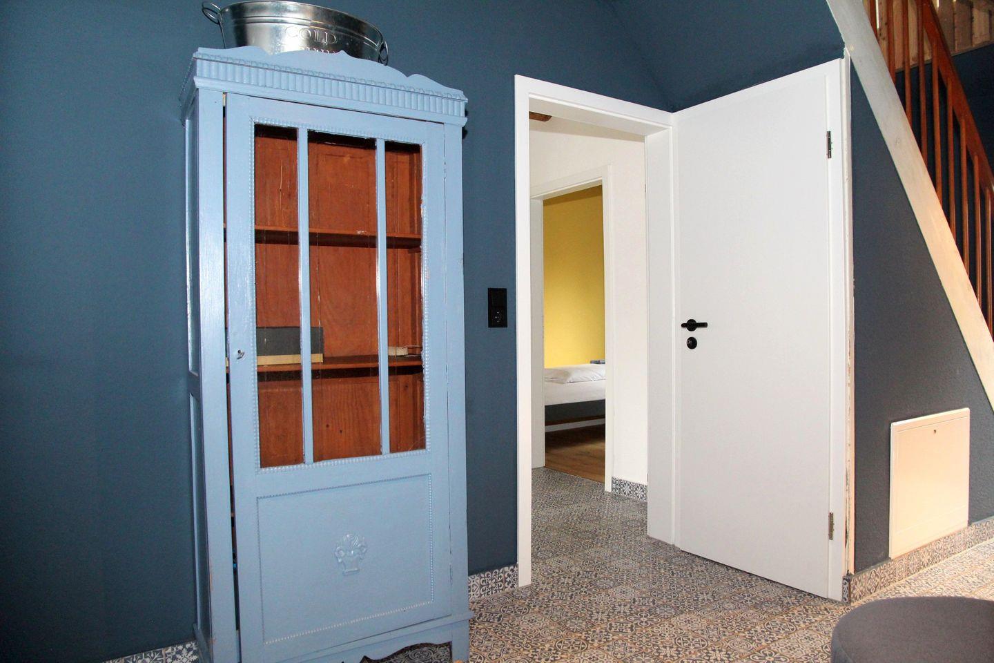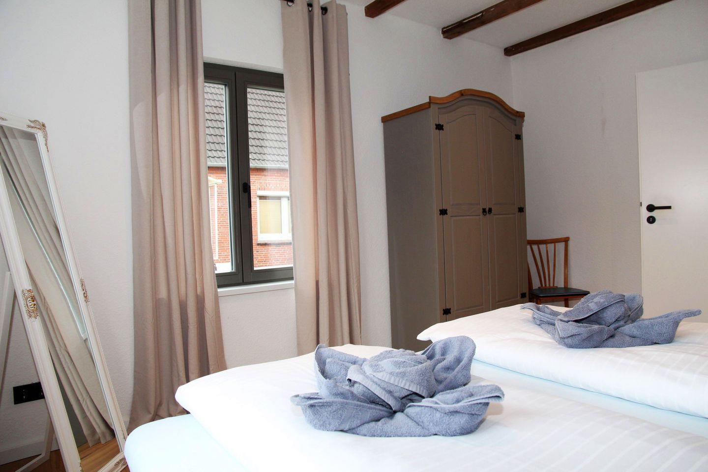 Das Ferienhaus verfügt über fünf geschmackvoll eingerichtete Schlafzimmer, die alle mit Verdunklungsvorhängen und gemütlichen Betten ausgestattet sind. Im Erdgeschoss befindet sich ein Schlafzimmer mit 1,80 m Doppelbett (durchgehender Topper), Kleiderschrank und dem großen Badezimmer en Suite. Dieses verfügt über Badewanne, Rainshower-Dusche, WC und ein Doppelwaschbecken. Ebenfalls im Erdgeschoss befinden sich ein weiteres Duschbad mit bodengleicher Dusche, WC und Waschbecken, sowie ein Schlafzimmer mit einem Einzelbett. Im Obergeschoss (steile Treppe mit hoher letzter Stufe) befinden sich die drei weiteren Schlafzimmer: Eines mit tollem Blick auf den Kanal, 1,40 m Doppelbett (durchgehende Matratze) und Schreibtisch, die anderen beiden jeweils mit Einzelbett.