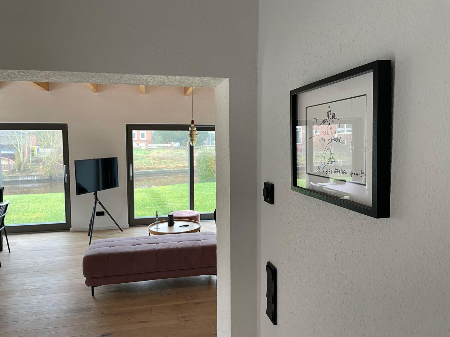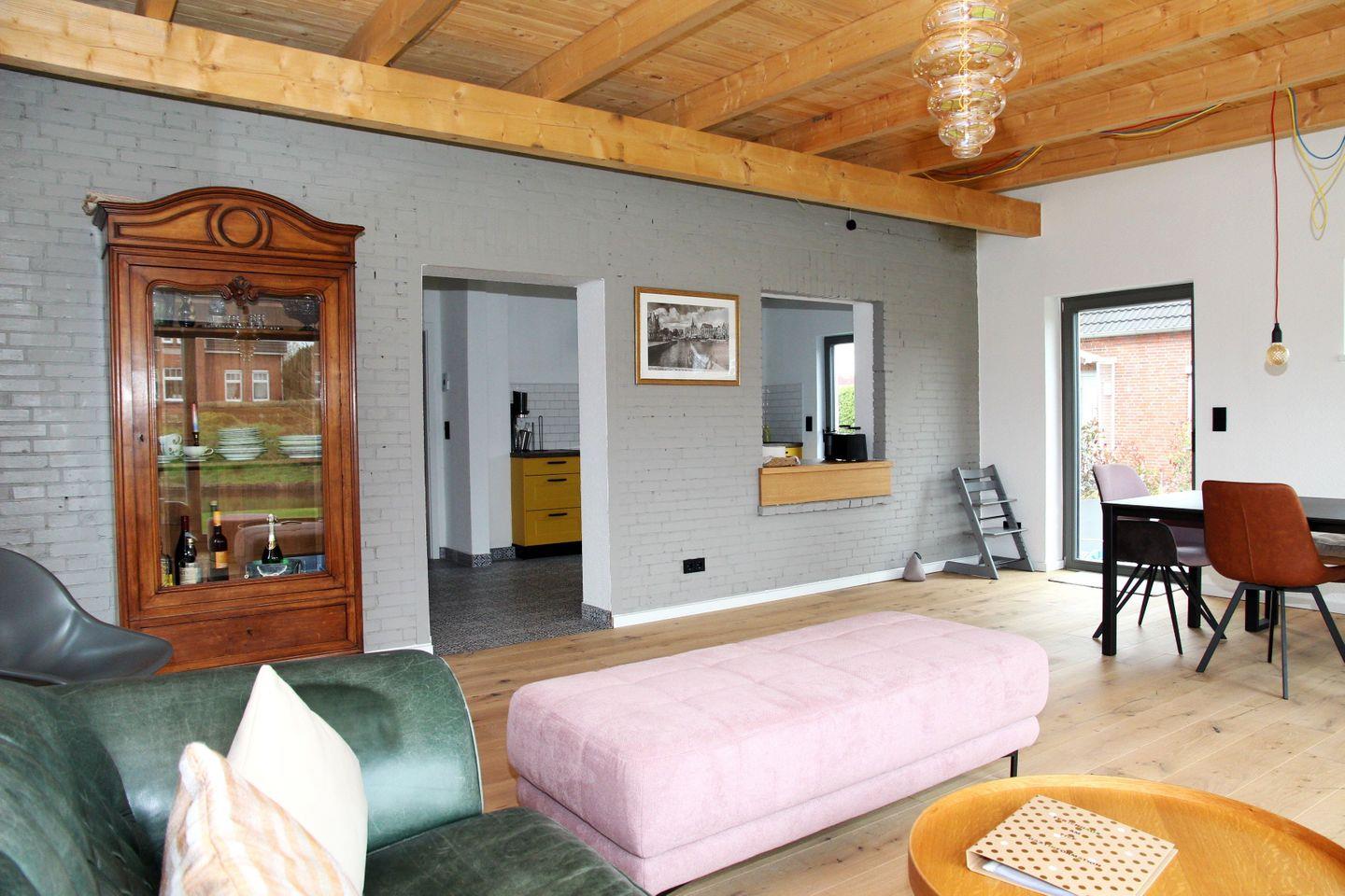 Das Haus erstreckt sich über zwei Etagen und bietet Ihnen viel Raum zur Entspannung und Erholung. Der offene Wohn- und Essbereich ist lichtdurchflutet und lädt zum Verweilen ein. Eine moderne Küche, ausgestattet u.a. mit Ceran-Herd, Backofen, Kühlschrank mit Gefrierschrank, Nespresso-Kapselmaschine, Wasserkocher, Toaster, Sodastream und Geschirrspüler, ermöglicht Ihnen die Zubereitung von leckeren Familienmahlzeiten. Der direkt angrenzende Wohn- und Essbereich im neu geschaffenen Anbau bietet einen schönen Sofabereich mit Fernseher, sowie den Esstisch mit Platz für acht Personen. Genießen Sie Ihre Mahlzeiten am großen Esstisch oder auf der herrlichen Terrasse. Beide Plätze bieten einen tollen Blick auf den Garten und das direkt angrenzende Larrelter Tief. Der schöne Garten mit Liegewiese und Gartenmöbeln ist der ideale Platz für Kinder zum Spielen und für Erwachsene zum Entspannen.