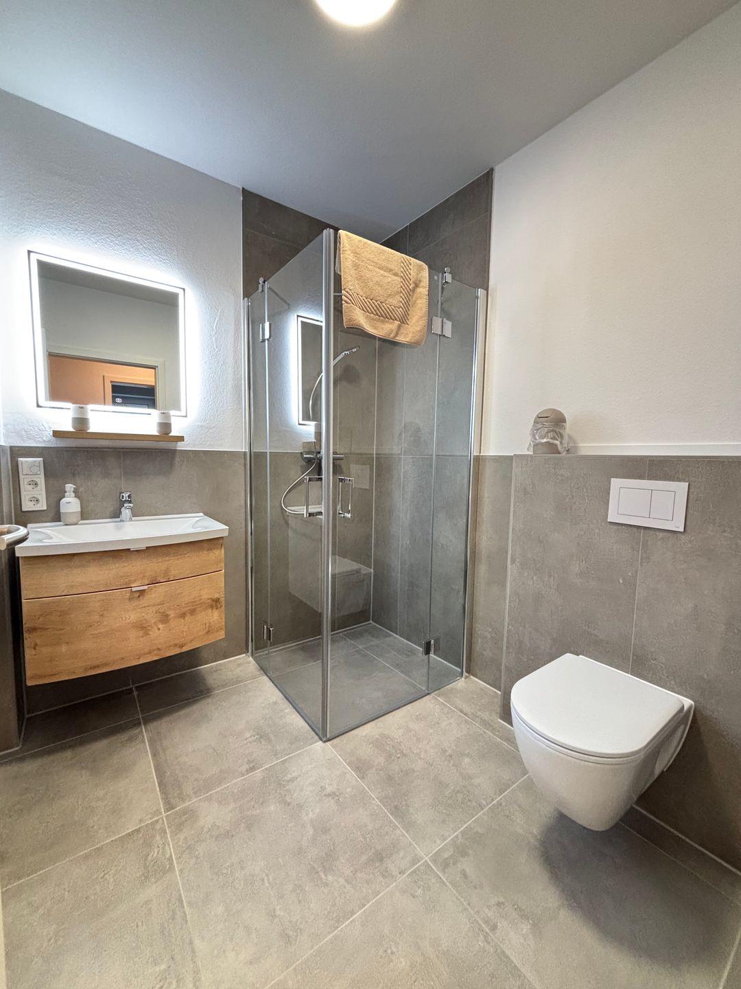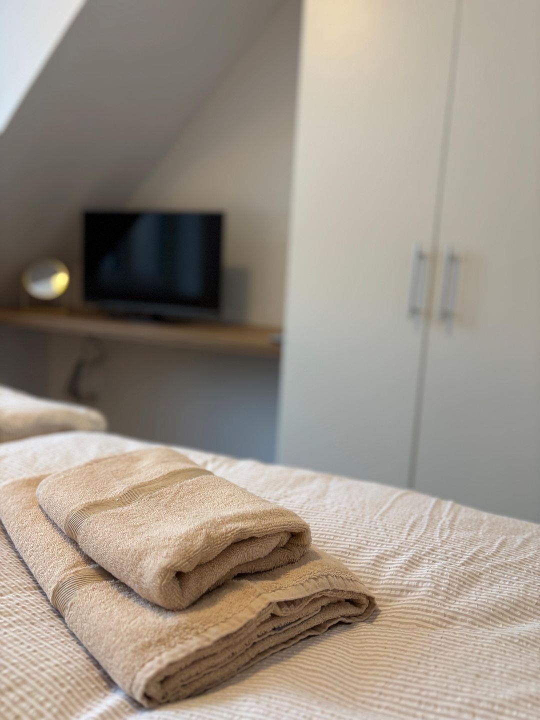 Zwei komfortabel ausgestattete Badezimmer bieten eine hochwertige Sanitärausstattung – darunter ein bodengleiches Duschbad und eine Badewanne im oberen Badezimmer. Haartrockner, Spiegel, Fenster und warmes Wasser runden das Angebot ab. Selbstverständlich stehen kostenfreie Bettwäsche, Handtücher und eine Erstausstattung in Küche und Bad bereit.