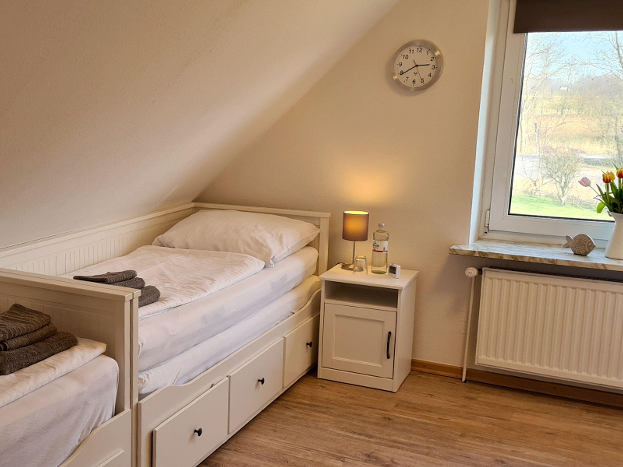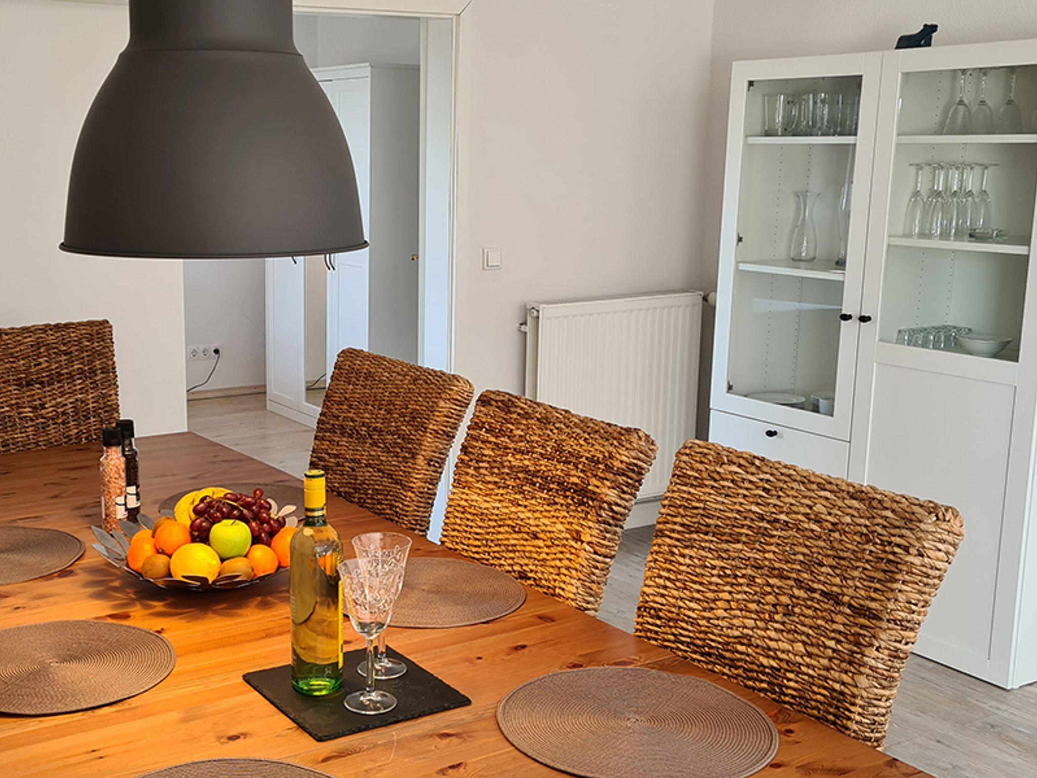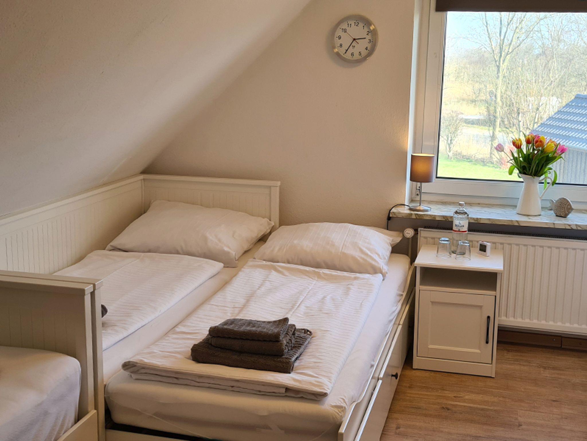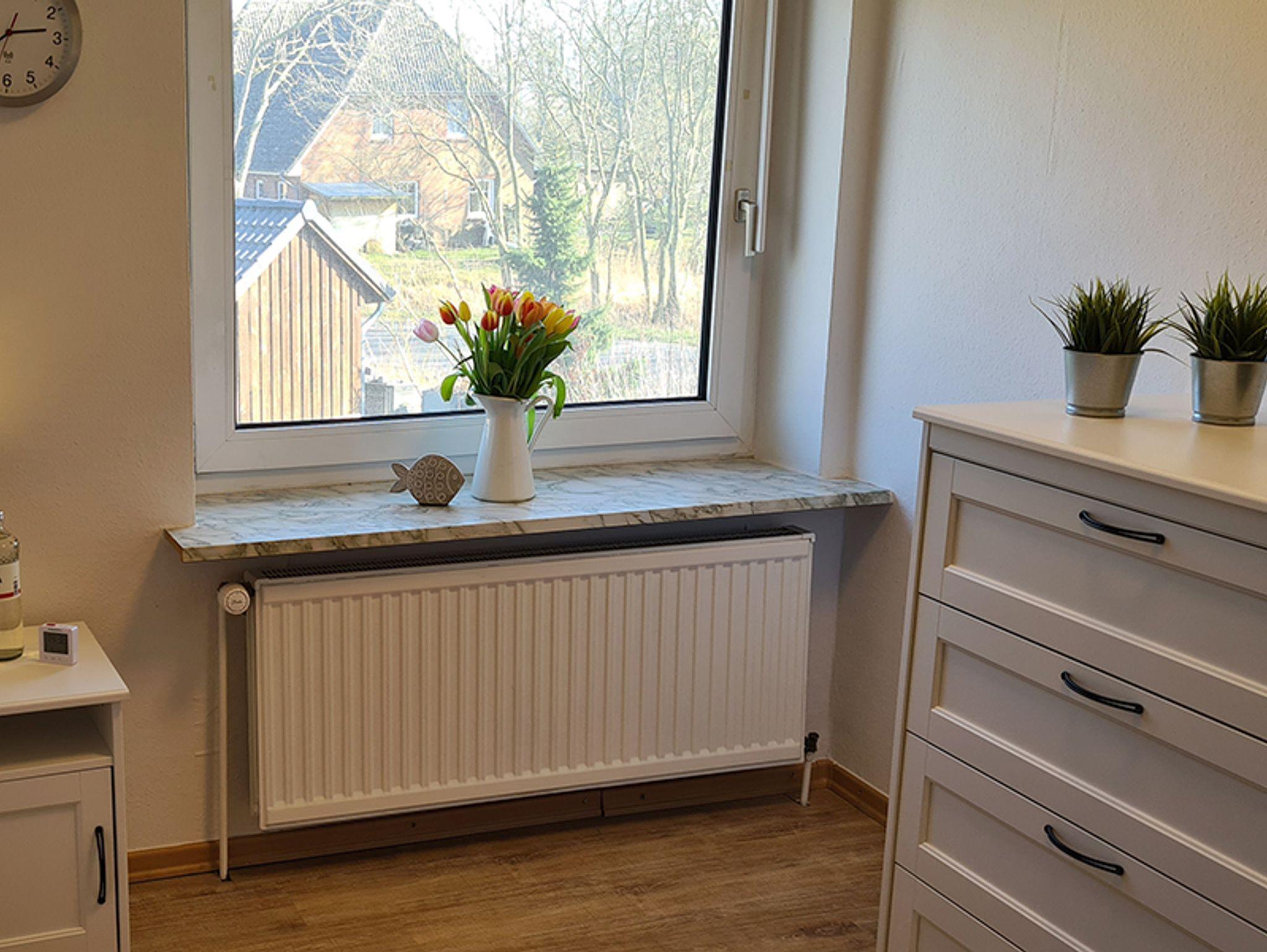Das Ferienhaus Schau ins Land (Nichtraucher) besteht aus einer Doppelhaushälfte mit eigenem Garten, möbliertem Wintergarten und großer Terrasse mit einem Strandkorb und Sitzgelegenheiten. Auf 125 m2 Wohnfläche über 2 Ebenen haben maximal 8 Personen Platz und es ist ideal für 1-2 Familien geeignet. Diese Unterkunft wurde 2019 renoviert und neu möbliert. Ihr Hund ist bei uns willkommen. Das Ferienhaus Schau ins Land verfügt über 3 Schlafzimmer, voll ausgestatteter großer Küche mit Abstellraum, 2 komfortablen Badezimmern und einem geräumigen Wohn-und Essbereich. Im Erdgeschoss des Ferienhauses Schau ins Land befindet sich ein großer Flur. Von dort geht die vollausgestattete Küche ab, welche genug Platz für einen Küchentisch mit 6 Stühlen hat. Der Abstellraum geht von der Küche aus ab. Zur Küchenausstattung gehören ein Herd mit Ceranfeld und Backofen, Mikrowelle, Kühlschrank, Spülmaschine, Kaffeemaschine, Wasserkocher, Toaster, Handmixer und ein CD-Radio. Das Badezimmer im Erdgeschoss mit Fenster verfügt über eine Duschkabine, Waschbecken, Spiegel, Hänge-WC und einen Fön. Im geräumigen hellen Wohnzimmer steht ein Sofa mit Recamiere, Sat-TV, sowie eine Stereoanlage mit Bluetooth und USB Funktion. Der Esstisch bietet Ihnen Platz für 8 Personen. Es grenzt der voll möblierte Wintergarten an das Wohnzimmer, von wo aus man einen herrlichen Blick übers Land und Felder hat. Freies W-Lan ist vorhanden. Durch das Wohnzimmer gelangen Sie in das Schlafzimmer, welches ausgestattet ist mit einem Doppelbett (1,80 m x 2,00 m) Kleiderschrank, Kommode und einem Verdunkelungsrollo. In der 1. Etage befindet sich ein weiteres Badezimmer mit Badewanne, Waschbecken, Spiegel, Hänge-WC und einem Fön. Im Kinderzimmer stehen 2 Tagesbetten mit Ausziehfunktion (jeweils 2x 0,80 m x 2,00 m breit) welche Schlafplätze für 4 Personen bieten, 1 Kleiderschrank , eine Kommode, sowie ein Verdunkelungsrollo und CD-Radio. Das 3. Schlafzimmer ist mit einem Doppelbett (1,60 m x 2,00 m) ausgestattet, sowie 2 hohen Kommodenschränken und Verdunkelungsgardinen. Parkmöglichkeiten sind direkt vor dem Haus vorhanden.