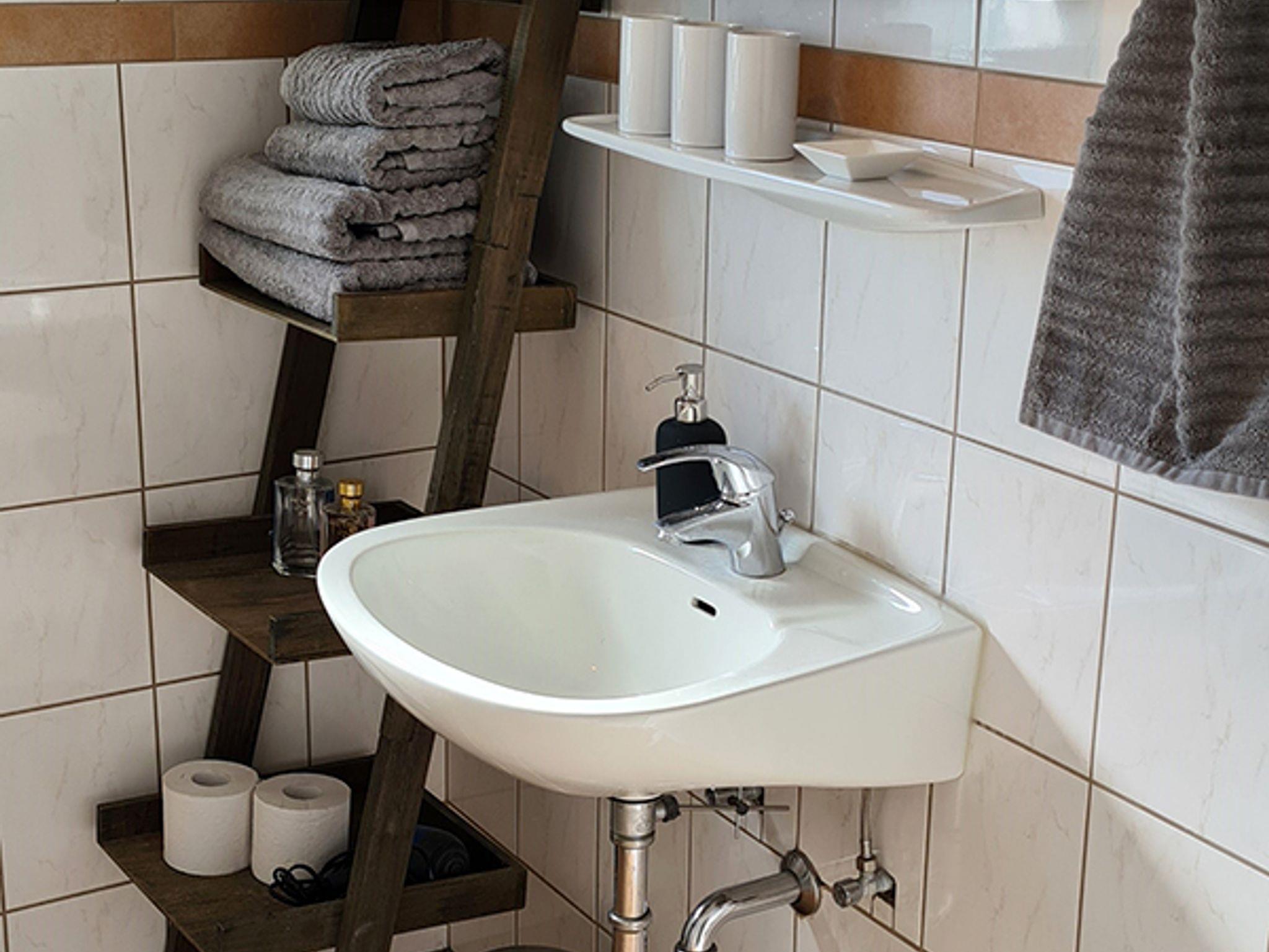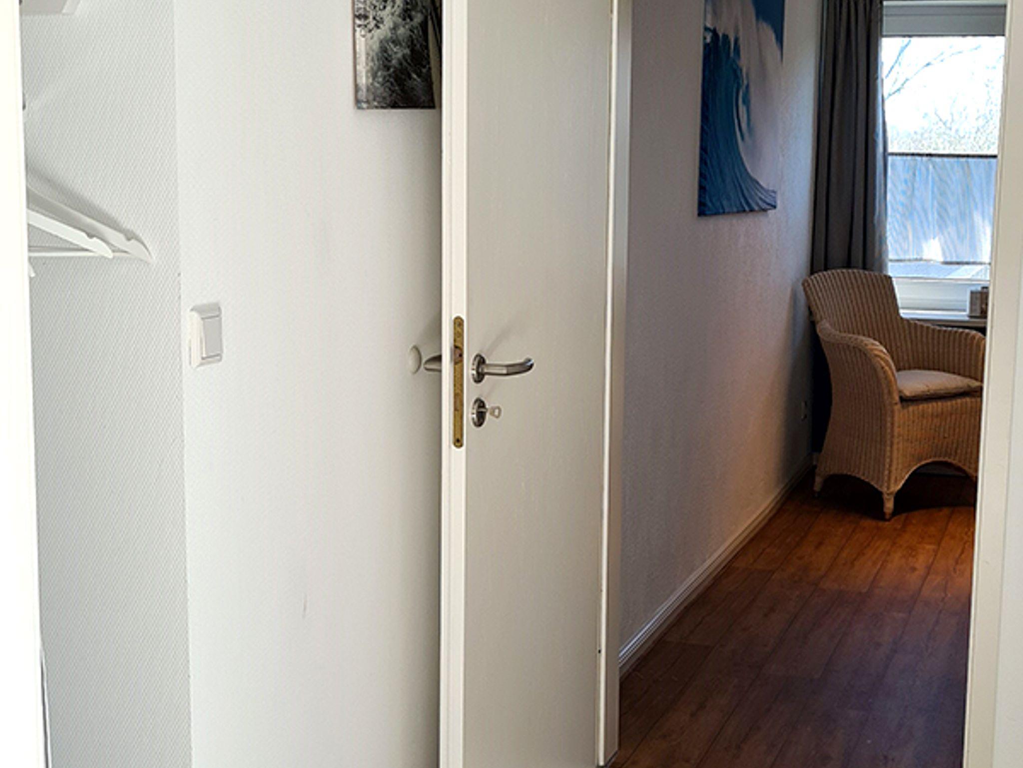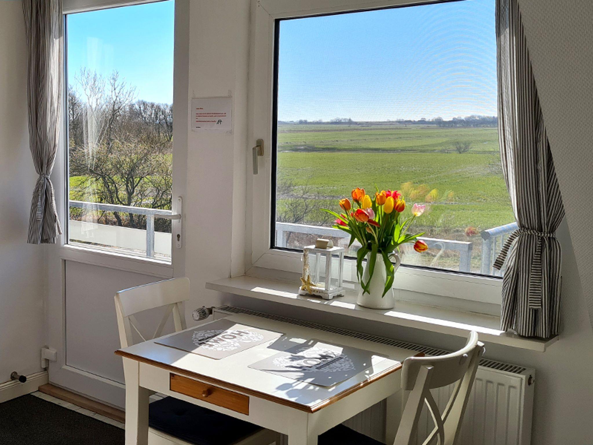 Die Ferienwohnung Seeblick (40 m2) für 2 Personen liegt im hinteren Teil des Hauses Schau ins Land in der 1. Etage. Sie verfügt über einen separaten Eingang, welcher über eine Außentreppe vom Garten aus zu erreichen ist. Von dem dazugehörigen Balkon aus genießen Sie den Weitblick übers Land und Felder bis zum Deich der nahegelegenen Nordsee. Zusätzlich zu Ihrem Balkon kann der Gemeinschaftsgarten mit genutzt werden. Sitzgelegenheiten sind vorhanden. Der Wohnbereich mit integrierter moderner Küchenzeile ist stilvoll eingerichtet mit einer Sofaecke, großem Sat-TV und einem CD-Radio. Eingebaute Spots sorgen für ein gemütliches Licht. Freies W-Lan ist verfügbar. Es ist genug Platz für einen Esstisch mit 2 Stühlen. Die vollausgestattete Küchenzeile beinhaltet einen Herd mit Cerankochfeld und Backofen, Spülmaschine, Kühlschrank mit Gefrierfach, Kaffeemaschine, Wasserkocher, Toaster und einem Handmixer. Im Schlafzimmer befindet sich ein Doppelbett (1,80 m x 2,00 m) und ein Kleiderschrank. Verdunkelungsvorhänge sind ebenfalls vorhanden. Das helle Badezimmer mit Fenster ist ausgestattet mit Duschkabine, Waschbecken, Spiegel, WC und einem Fön. Die Ferienwohnung Seeblick (Nichtraucher) ist modern und liebevoll eingerichtet. Ihr Hund ist uns willkommen. Parkmöglichkeiten sind direkt vor dem Haus vorhanden.