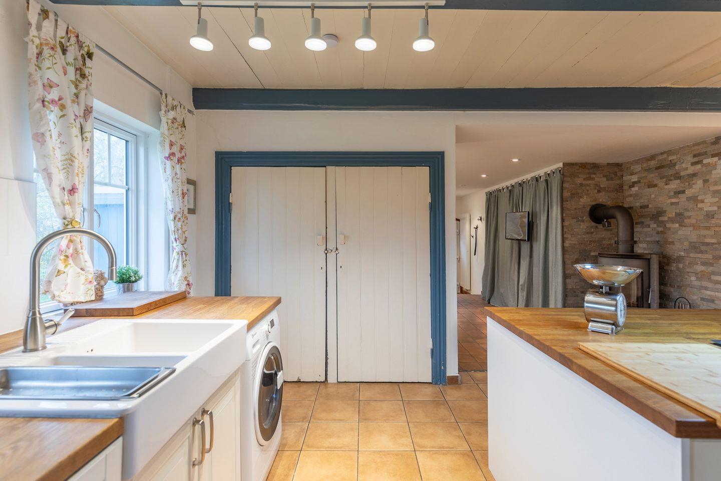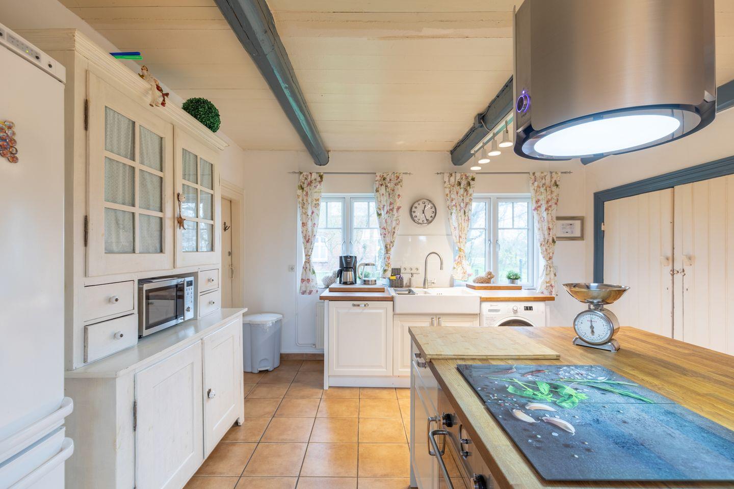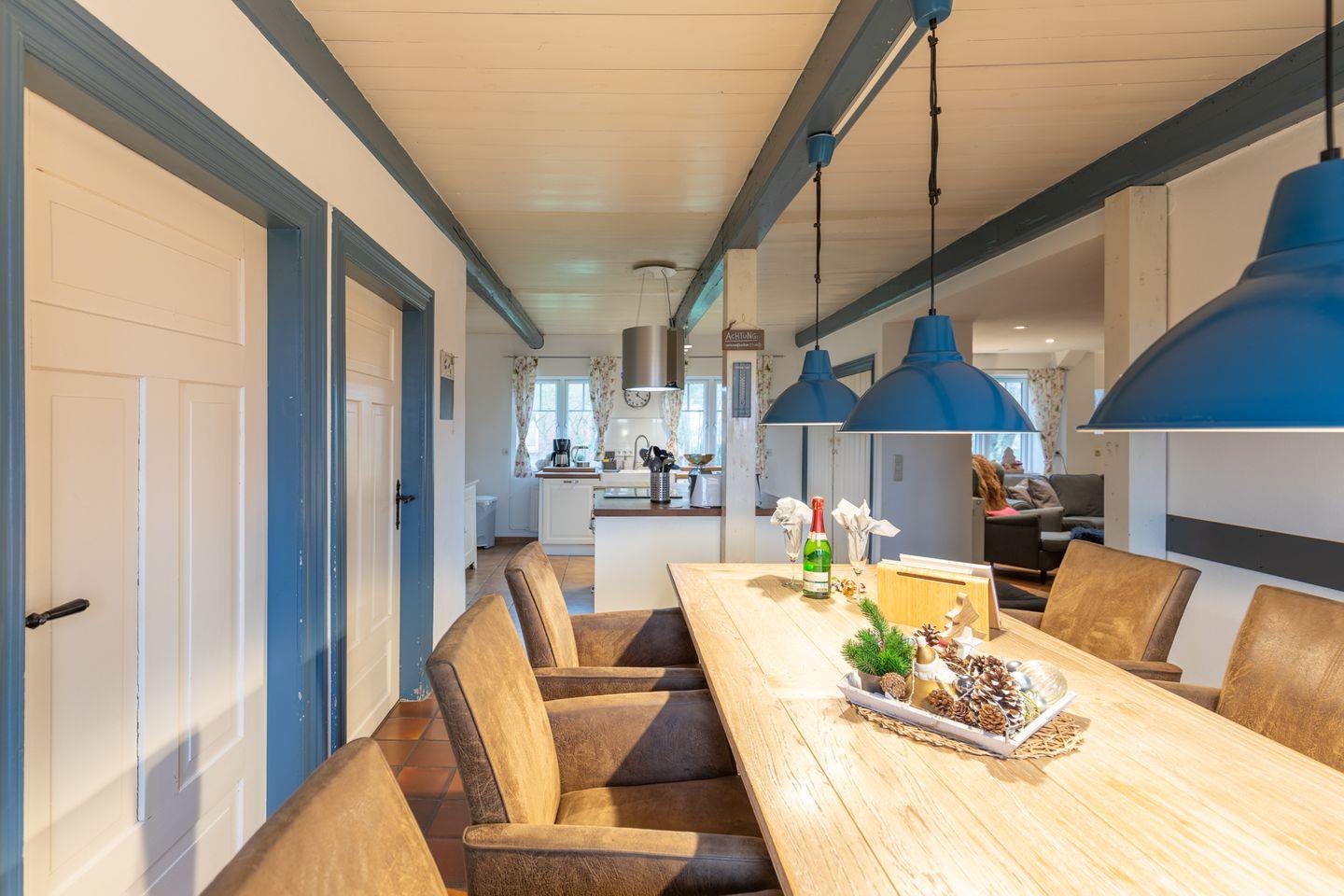 Der große Esstisch lädt zu gemütlichen Abenden im Kreise der Freunde oder Familie ein. Die offene Küche ist mit einem Geschirrspüler, Herd, Backofen, Filterkaffeemaschine, Toaster, Wasserkocher, einer Mikrowelle und einem Kühlschrank mit Gefrierfach ausgestattet.