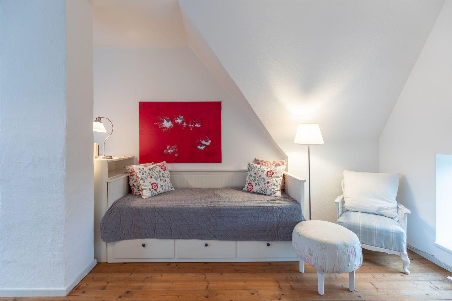 Im Obergeschoss finden Sie ein geräumiges Wohnzimmer mit TV, ein großes Schlafzimmer mit einem Doppelbett (200 x 200) und einem niedlichen, stabilen Kinderbett mit Himmel. Des Weiteren befindet sich im oberen Wohnzimmer ein ausziehbares Kojenbett.