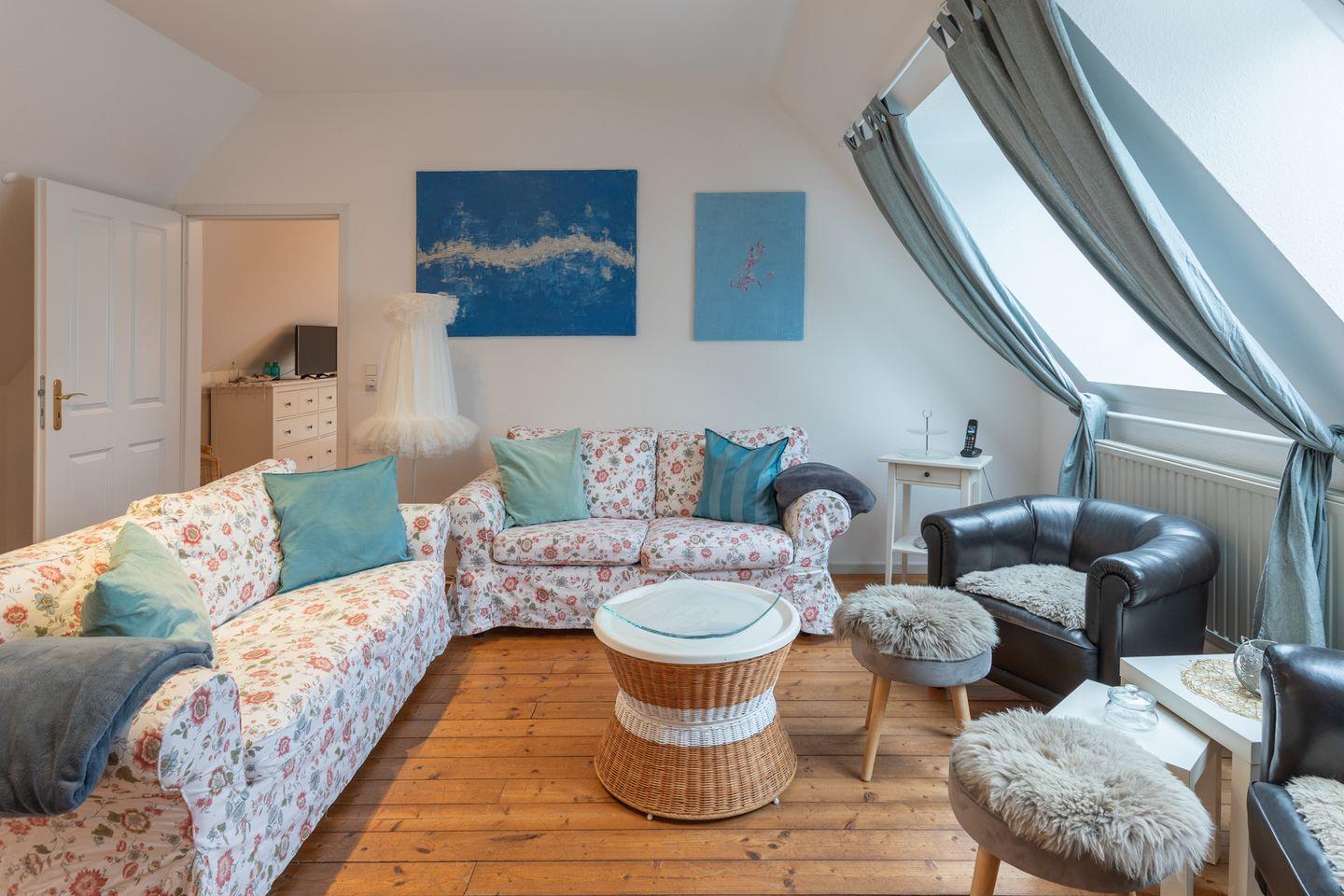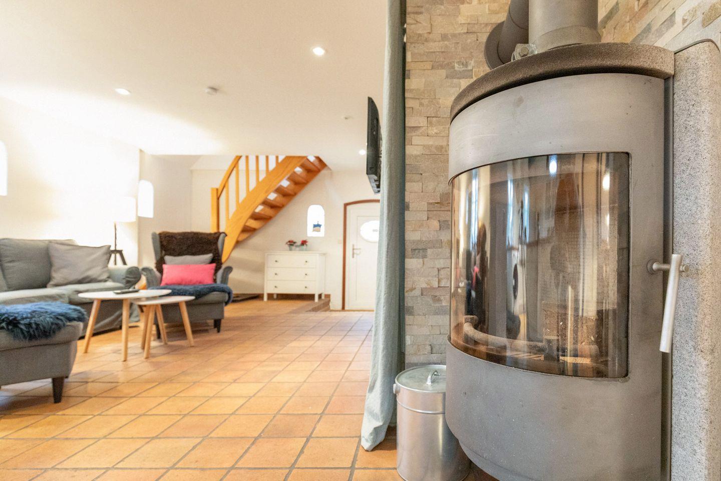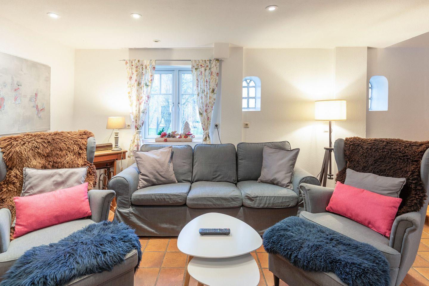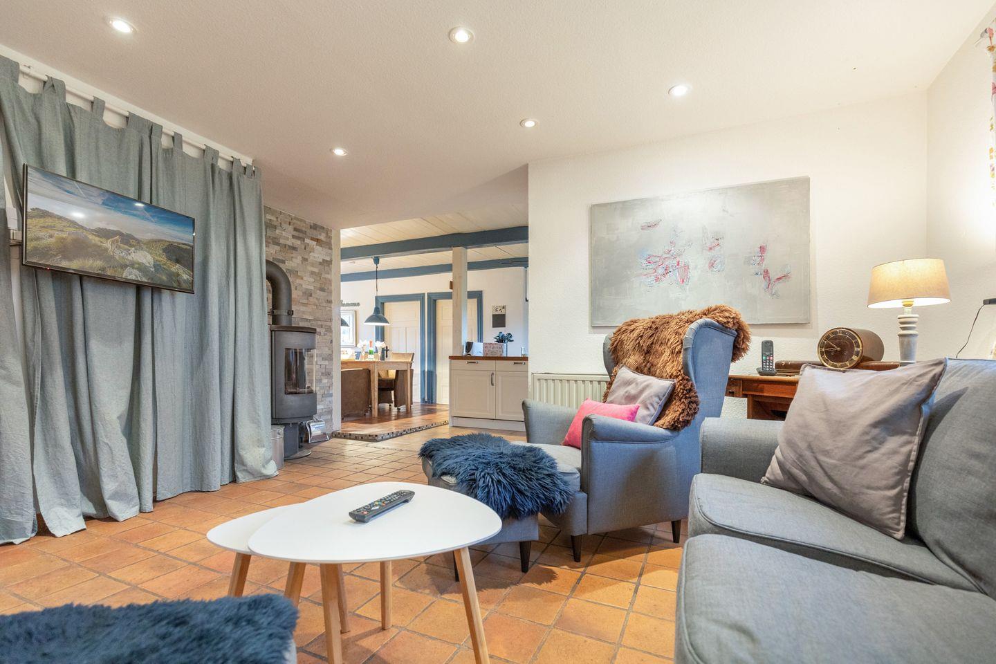 Das Wohnzimmer im Erdgeschoss bietet Ihnen einen Kaminofen für gemütliche Stunden, ein Flachbild-TV (SAT) und einen DVD-Player.