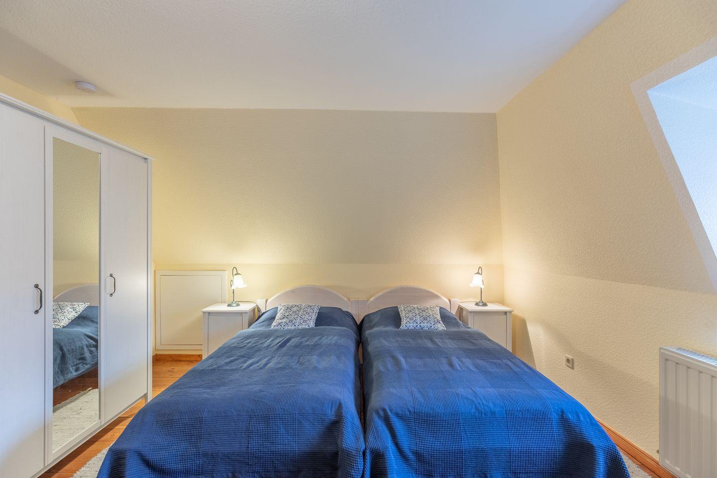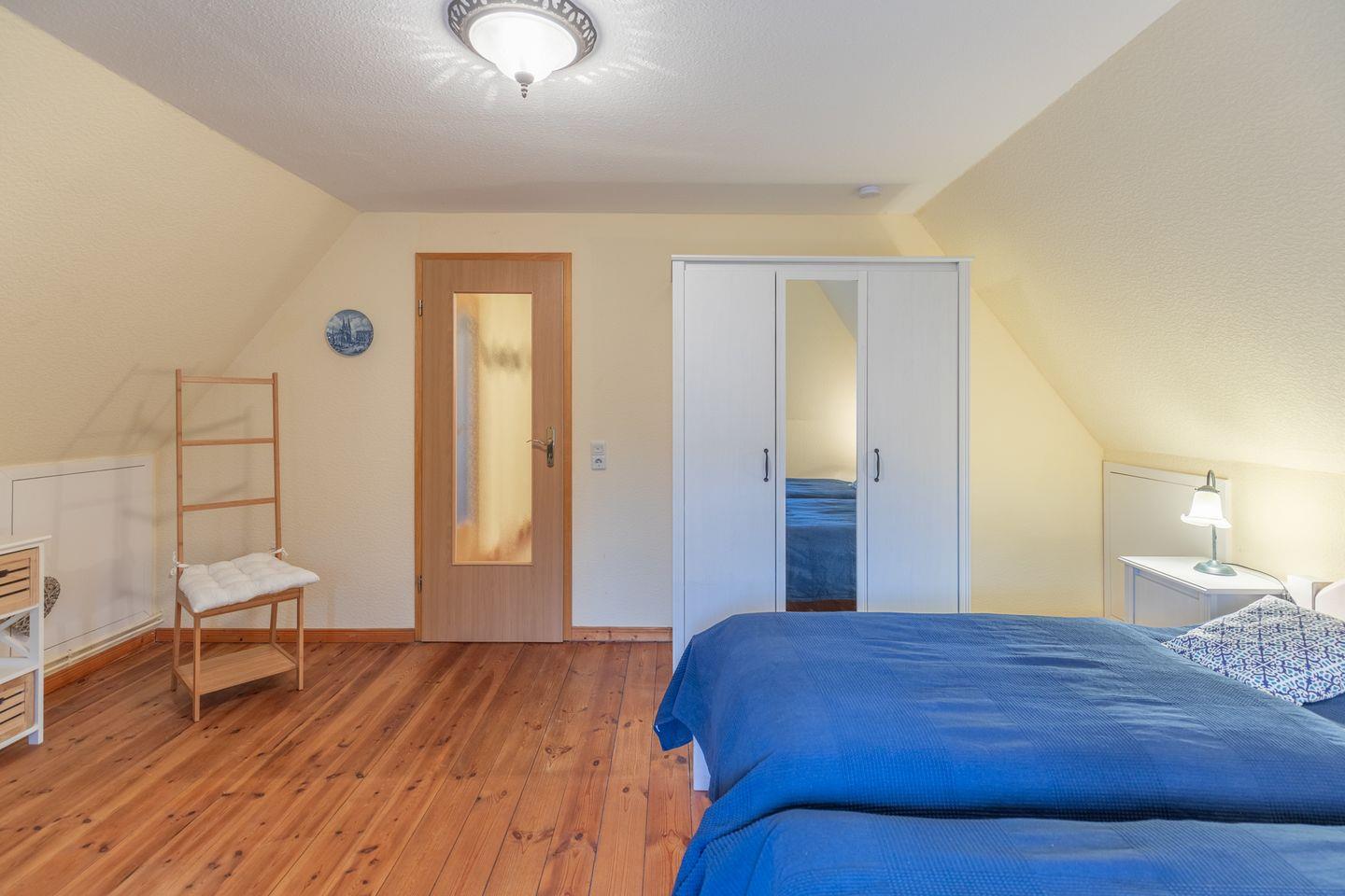Das 150 qm große Ferienhaus bietet drei Schlafzimmer mit Platz für max. 6 Erwachsene. Das Schlafzimmer „Deichblick“ im EG mit einem 180 cm breiten Doppelbett und direktem Zugang zum Duschbad, das 2. Schlafzimmer im Apartment mit zwei Einzelbetten (90 × 200) und das „Blaue-Zimmer“ mit zwei Einzelbetten (90 × 200).