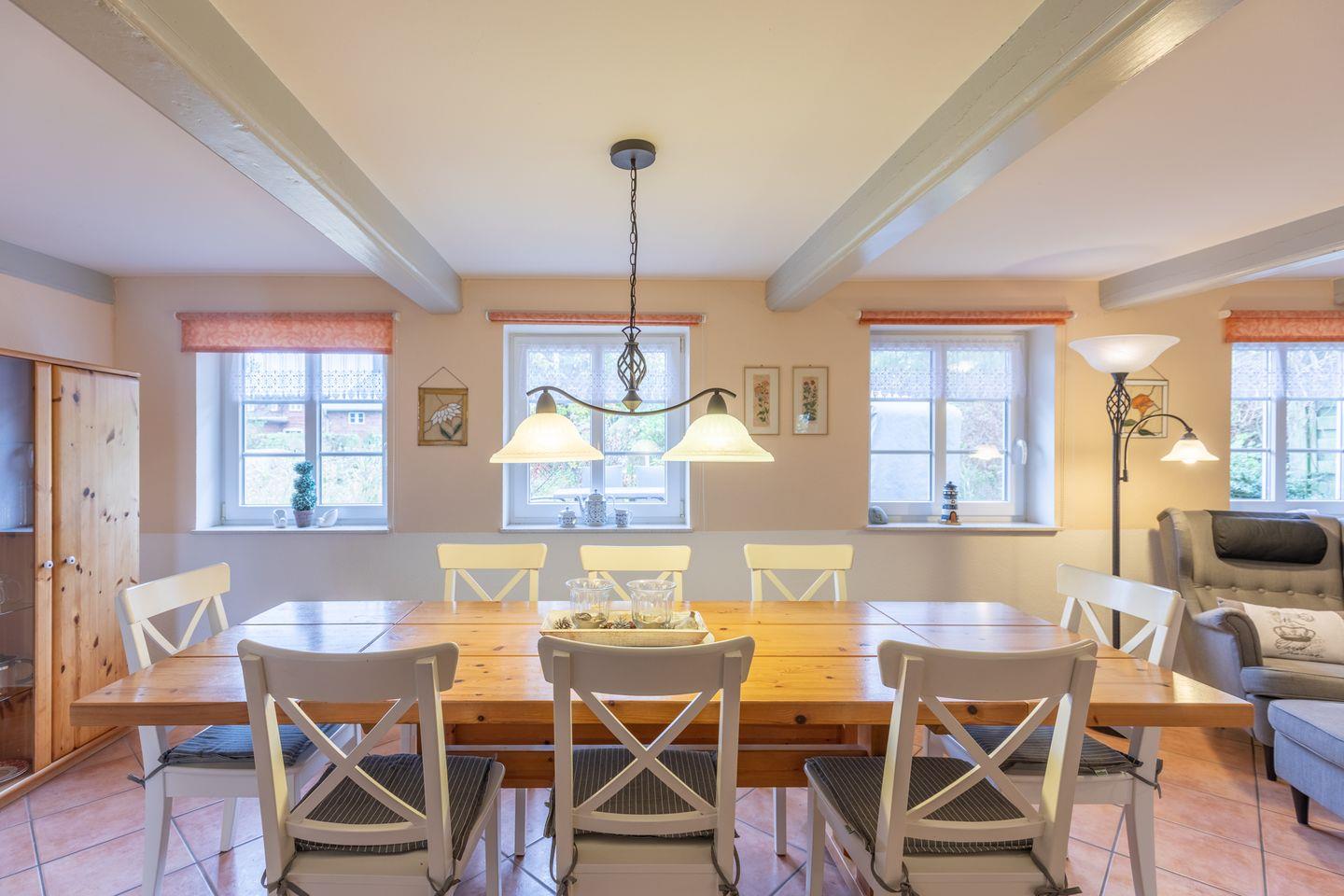 Im Wohnzimmer stehen Ihnen ein großer LCD-Fernseher (SAT), ein DVD-Player und eine Stereoanlage mit jeweils einer kleinen Auswahl an Filmen und CDs zur Verfügung. An kühleren Abenden können Sie am prasselnden Kachelofen schöne Lesestunden verbringen. Kaminholz in ausreichender Menge ist im Mietpreis enthalten. Der große Esstisch bietet Platz für acht Personen und lädt zum gemütlichen Verweilen mit Familie und Freunden ein. Die komfortabel eingerichtete Küche mit Terrassenzugang ist mit Ceranfeld, Backofen, Gefrierschrank, Kühlschrank, Mikrowelle, Kaffeemaschine (Filtergröße 4), Toaster, Wasserkocher, Geschirrspüler und reichhaltigem Küchenequipment ausgestattet.