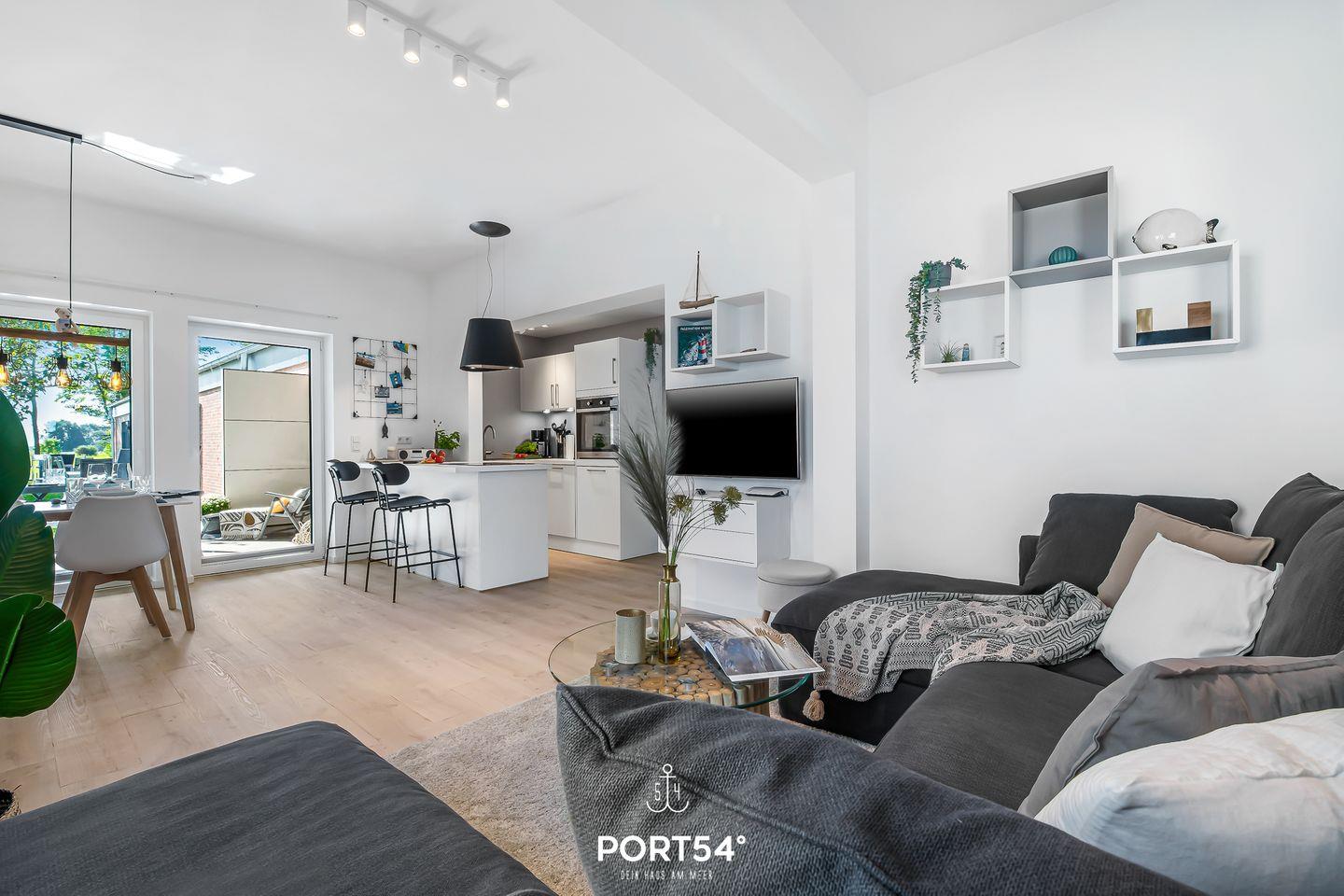 Im geräumigen Wohnzimmer können Sie es sich gemütlich machen. Die offene Küche mit angrenzenden Essbereich ist modern und komplett ausgestattet und lädt zum gemeinsamen kochen ein. Das Schlafzimmer ist hochwertig mit einem Doppelbett (200 x 200 cm) eingerichtet. Für weitere 2 Personen steht im Wohnzimmer ein gemütliches Schlafsofa zur Verfügung. Das helle Badezimmer hat eine ebenerdige Dusche und, wie die gesamte Wohnung, Fußbodenheizung. Auf der Sonnenterrasse mit einem Gemeinschaftsgarten können Sie herrliche Stunden an der frischen Nordseeluft verbringen. Und wenn das Wetter mal nicht so will wie Sie: Die Terrasse ist überdacht. Für gesellige Grillabende steht Ihnen ein Elektrogrill zur Verfügung.