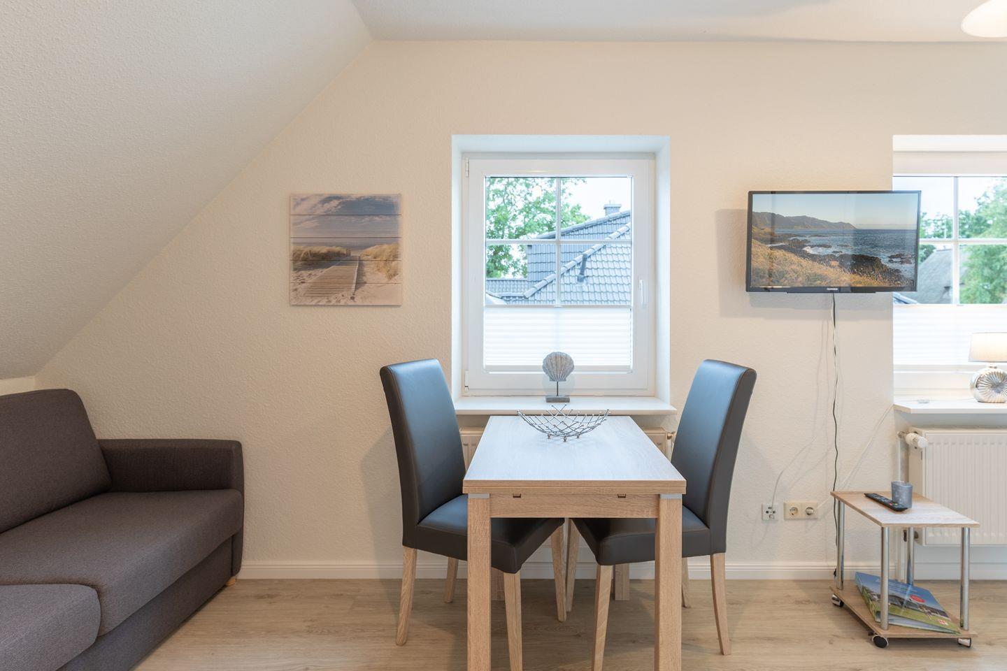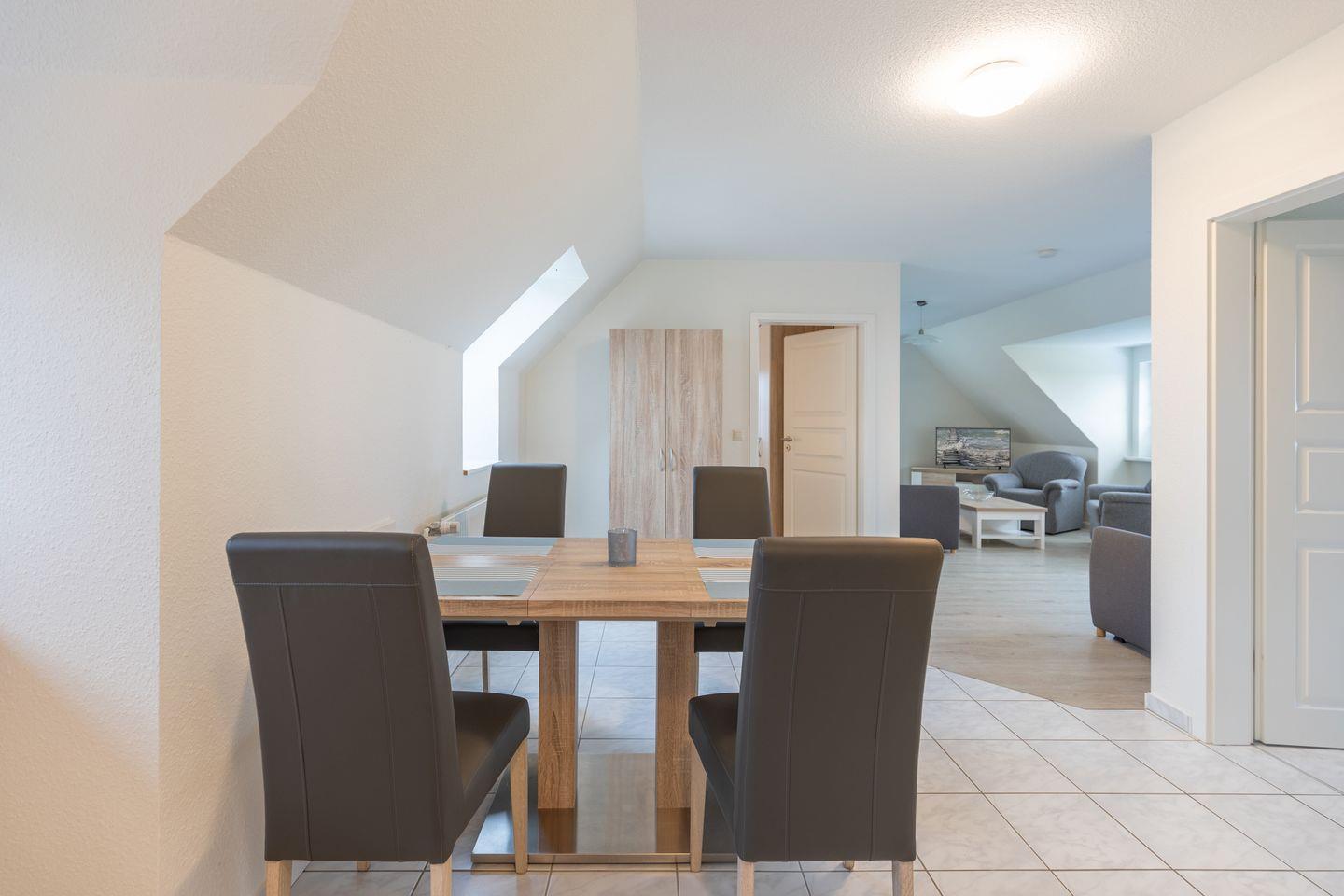 Beide Wohnzimmer sind mit ausziehbaren Schlafsofas ausgestattet und bieten zusätzliche Schlafmöglichkeiten. Alle Wohnbereiche verfügen über einen Fernseher, für gesellige Abende. Am ausziehbaren Esstisch in der unteren Wohnung kann die Gruppe gemeinsam zusammen sitzen.