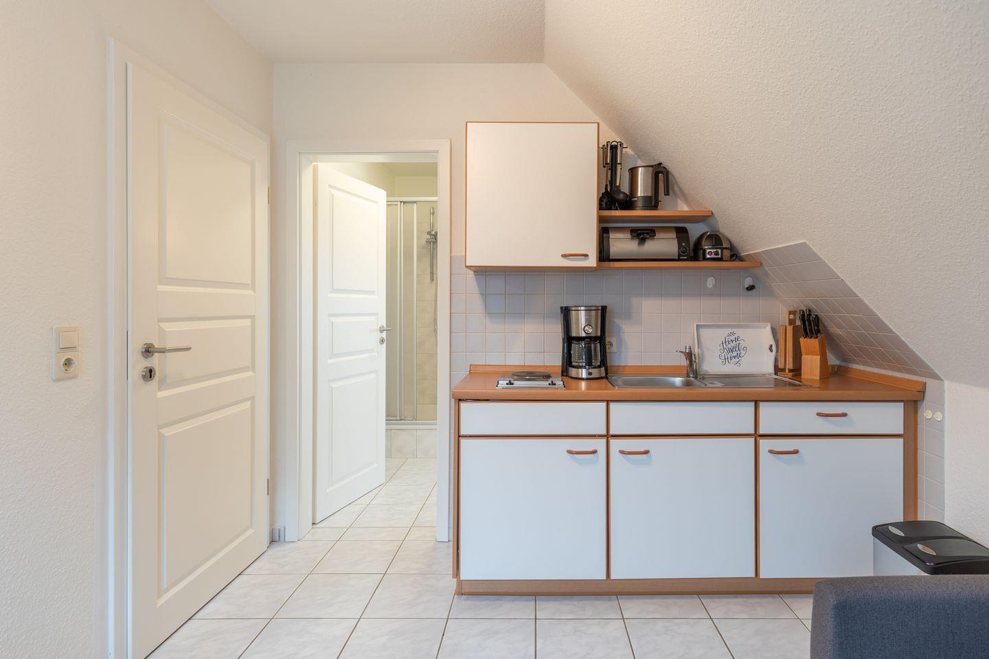Eine zusätzliche Kochnische im Obergeschoss. Gemeinsam kann am großen Esstisch in der unteren Wohnung gespeist werden.