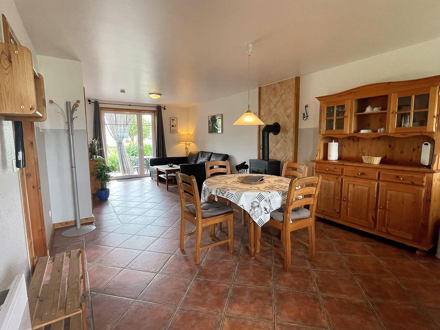 Die Ferienhaushälfte bietet Platz für bis zu sechs Personen und ist stilvoll eingerichtet. Beim Betreten werden Sie von einer warmen und gemütlichen Atmosphäre empfangen. Der offene Wohnbereich lädt zum Entspannen ein und bietet beim Blick aus dem Küchenfenster einen freie Sicht auf den Nordseedeich, der sich nur 600 Meter entfernt befindet. Genießen Sie die Ruhe und den Komfort dieses charmanten Zuhauses.